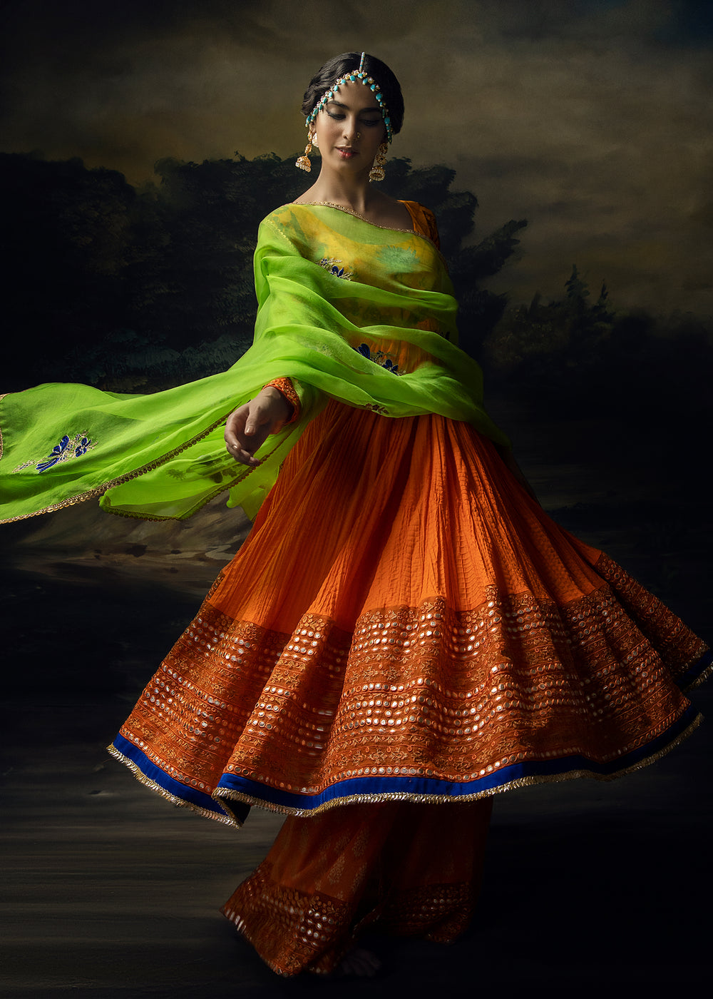 Our design philosophy revolves around creating a look that enhances your natural glow. From vivid yellows and lime greens to deep marigold tones and classic golds, each mehndi dress for bridal is curated to make you the center of attention. We combine heritage embroidery techniques like zardozi, gotta work, resham detailing, and mirror embellishments with innovative cuts that bring a contemporary edge to your bridal look.