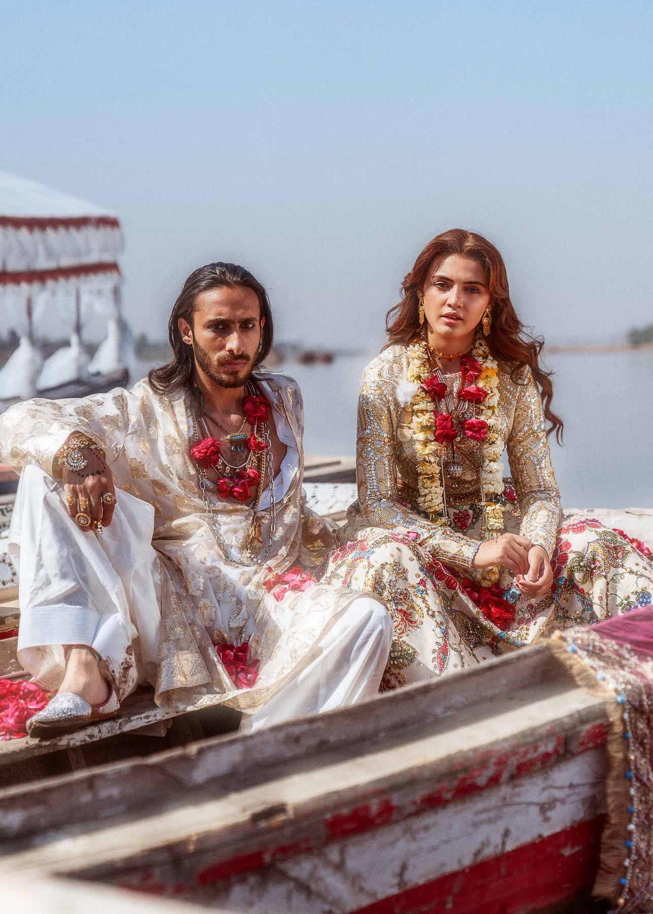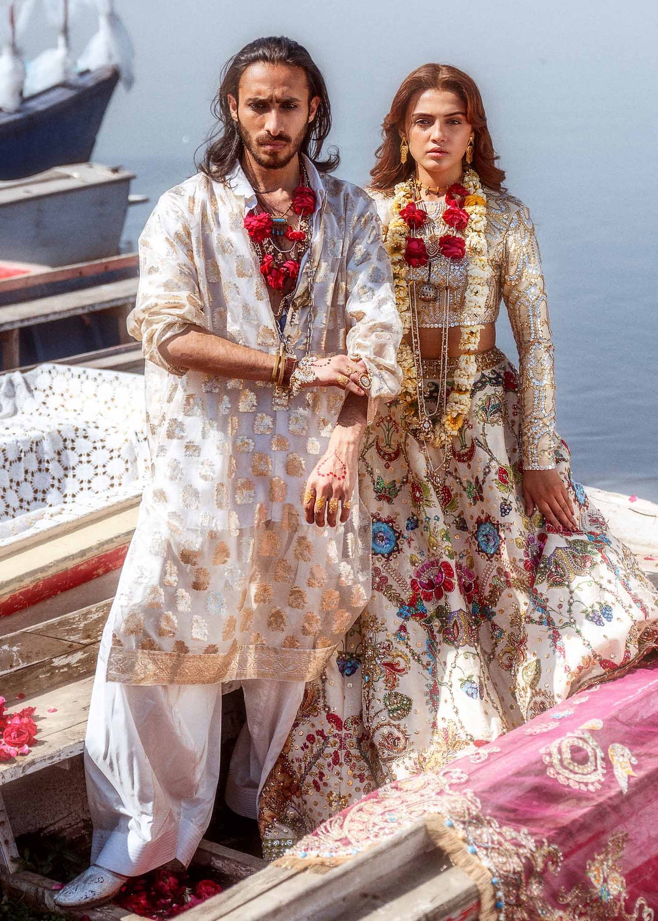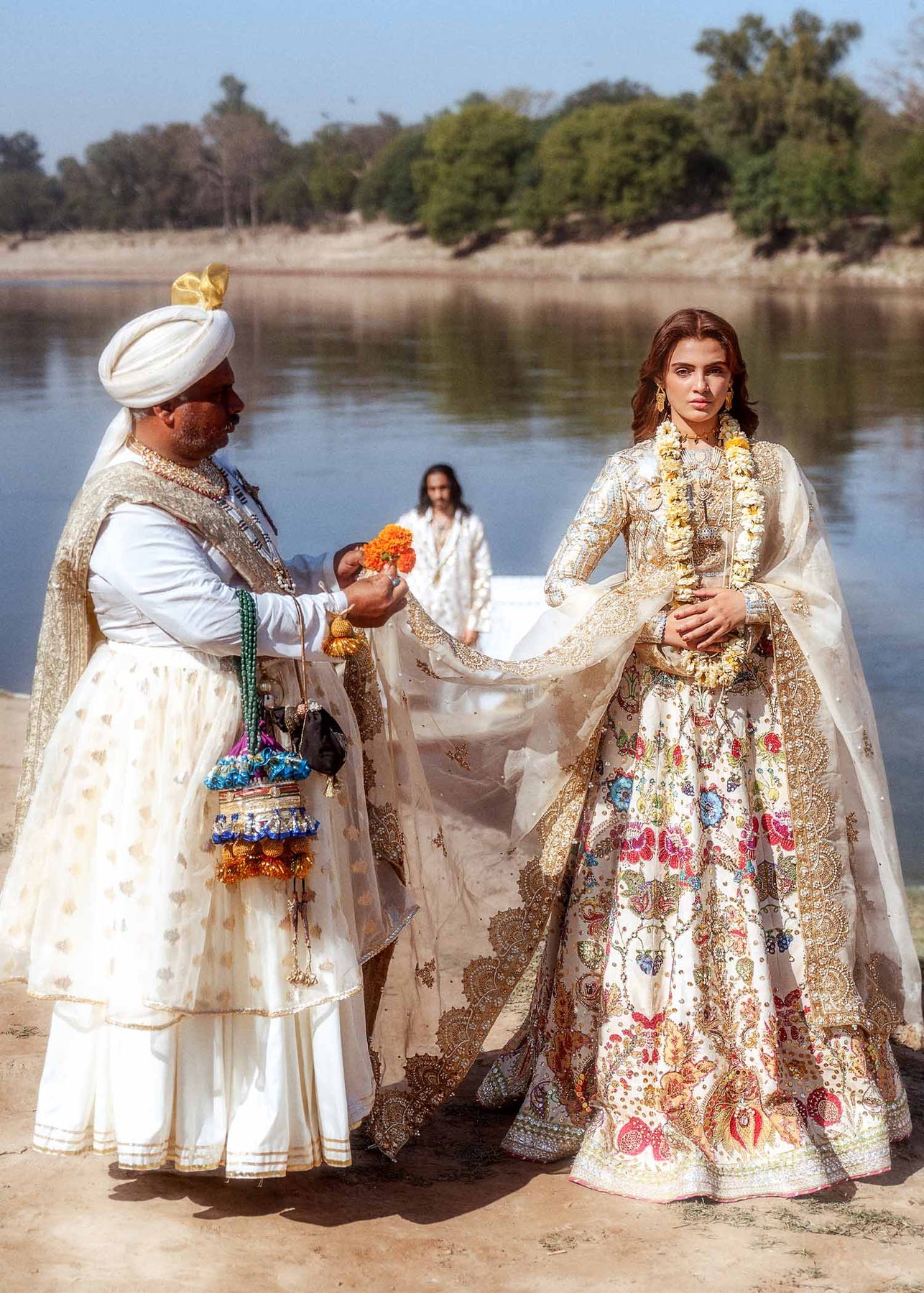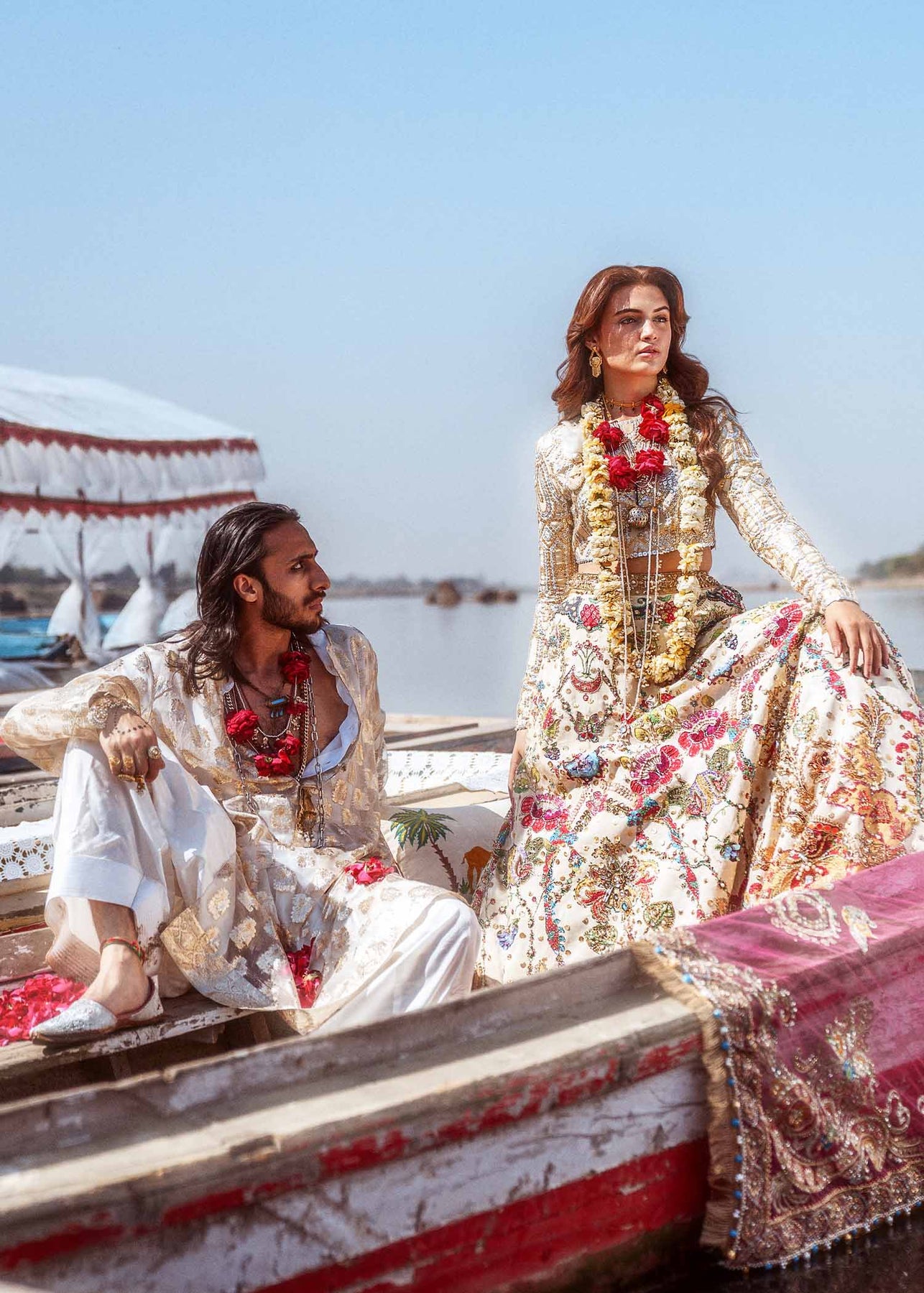 A lovely ivory base is hand-rendered in rich shades of nature to bring alive the exquisite beauty of flora and funa together in a modern silhouette. The lehenga has 3 dimensional sequins work in rainbow hues while the choli has a unique scales pattern in gold and silver. It is paired up with an ivory organza dupatta framed with an embellished border and a hot pink net dupatta with sequin, pearls and aari work.