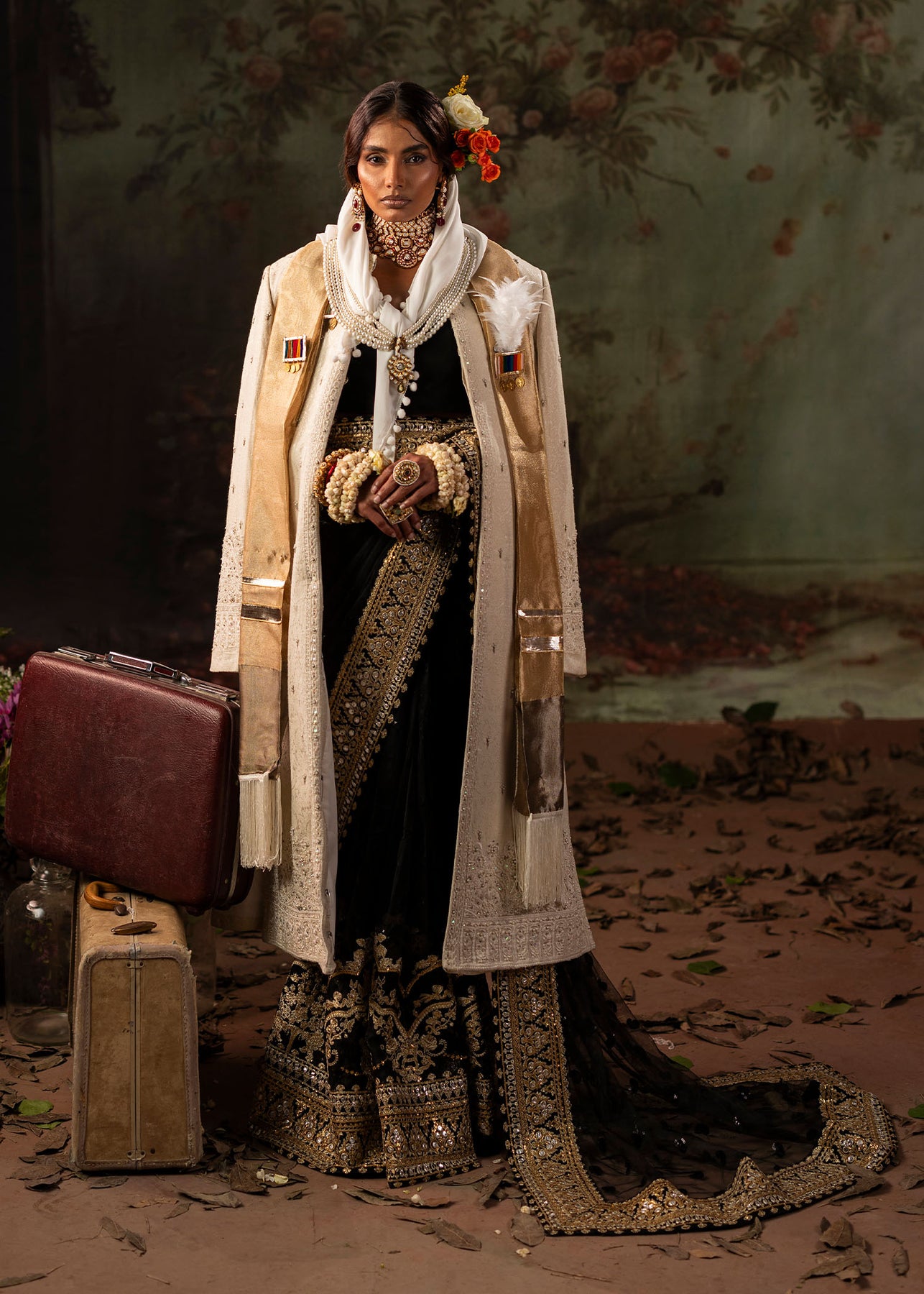 A sheer self embroidered black net saree that gives a dramatic and elegant base. The border consists of Handcrafted panni work in silver and gold, adding a rich shimmer to the edges without overpowering the dark net. Along with that it has a solid black blouse with a statement touch: appliqué and embroidery in green and pink on the sleeves, highlighted further with pearls for a regal, feminine detail.
