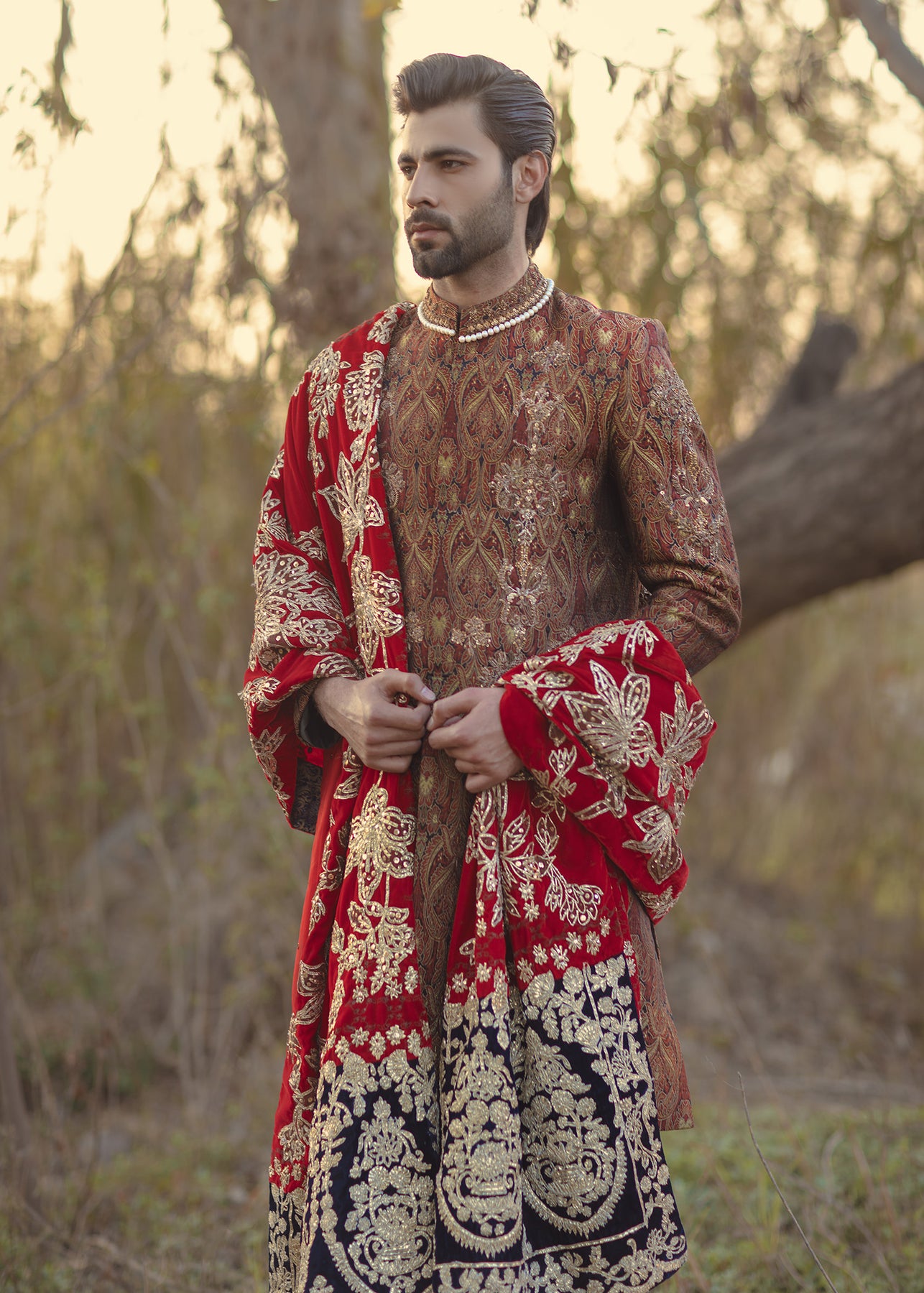 Ali xeeshan designs a dapper festive look with this rust deconstructed waist coat teamed with a blended paisley designs adorned with beadwork.