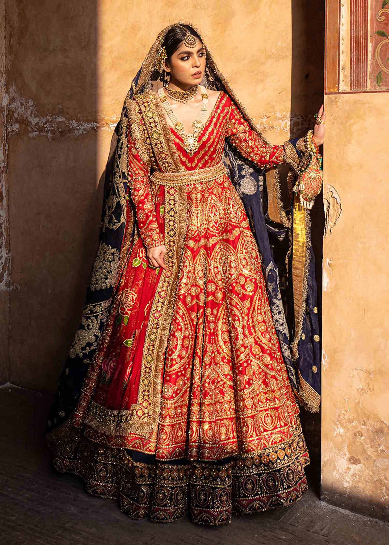 A scarlet red raw silk pishwas has a rich hand-rendered base, heavenly incrusted with pearls, naqshi and sitara. It is paired up with a contrasting navy blue lehnga framed with a hand-crafted border along with a beautiful embroidered net dupatta with a contemporary green border.
