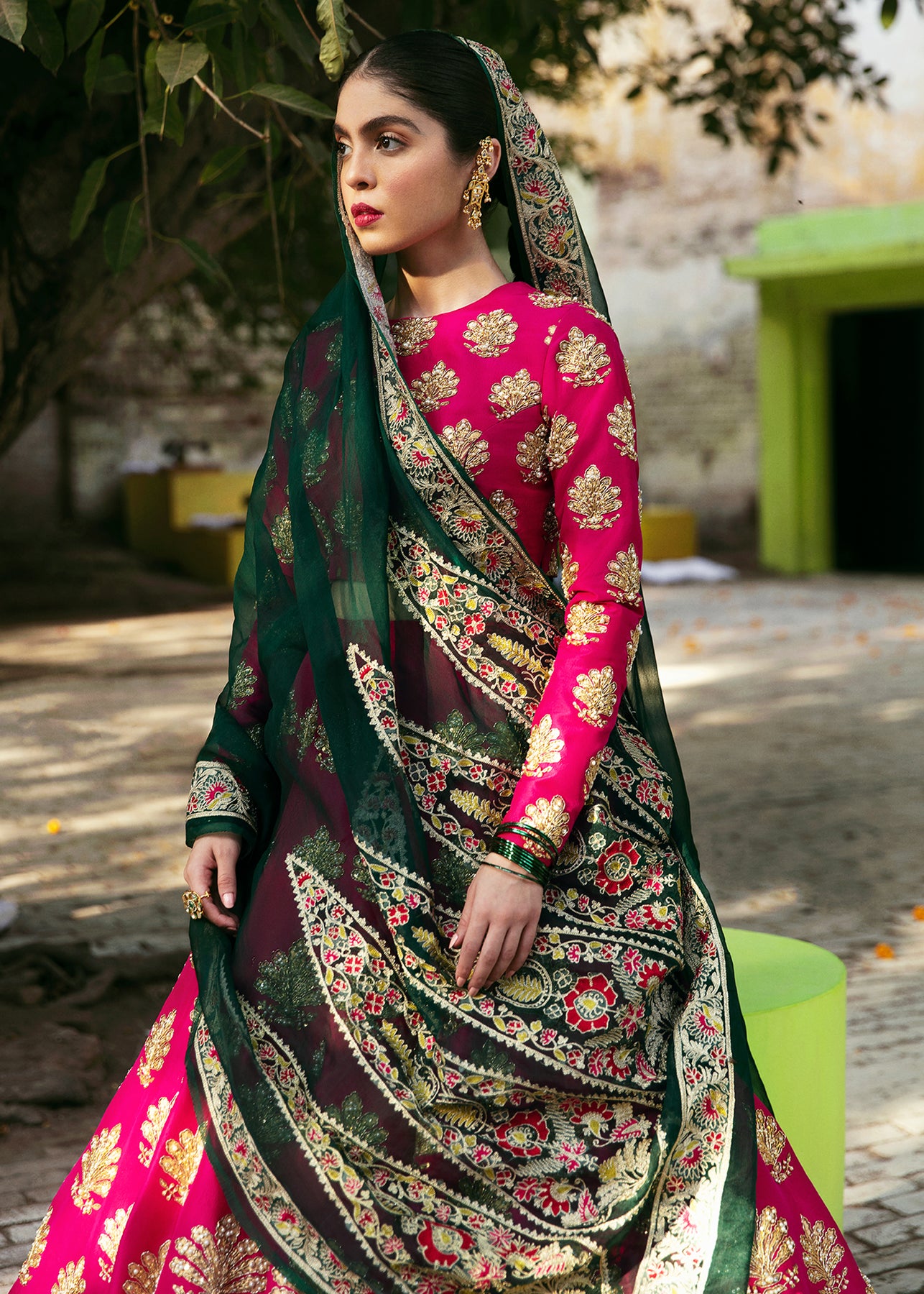 A wild berry pink raw silk lehnga and choli, beautifully hand-rendered in gold and copper, are enhanced with naqshi, pearls and dabka. It is paired up with a contrasting bottle-green dupatta in organza with aari border and paisleys that are adored with sitara and pearls.
