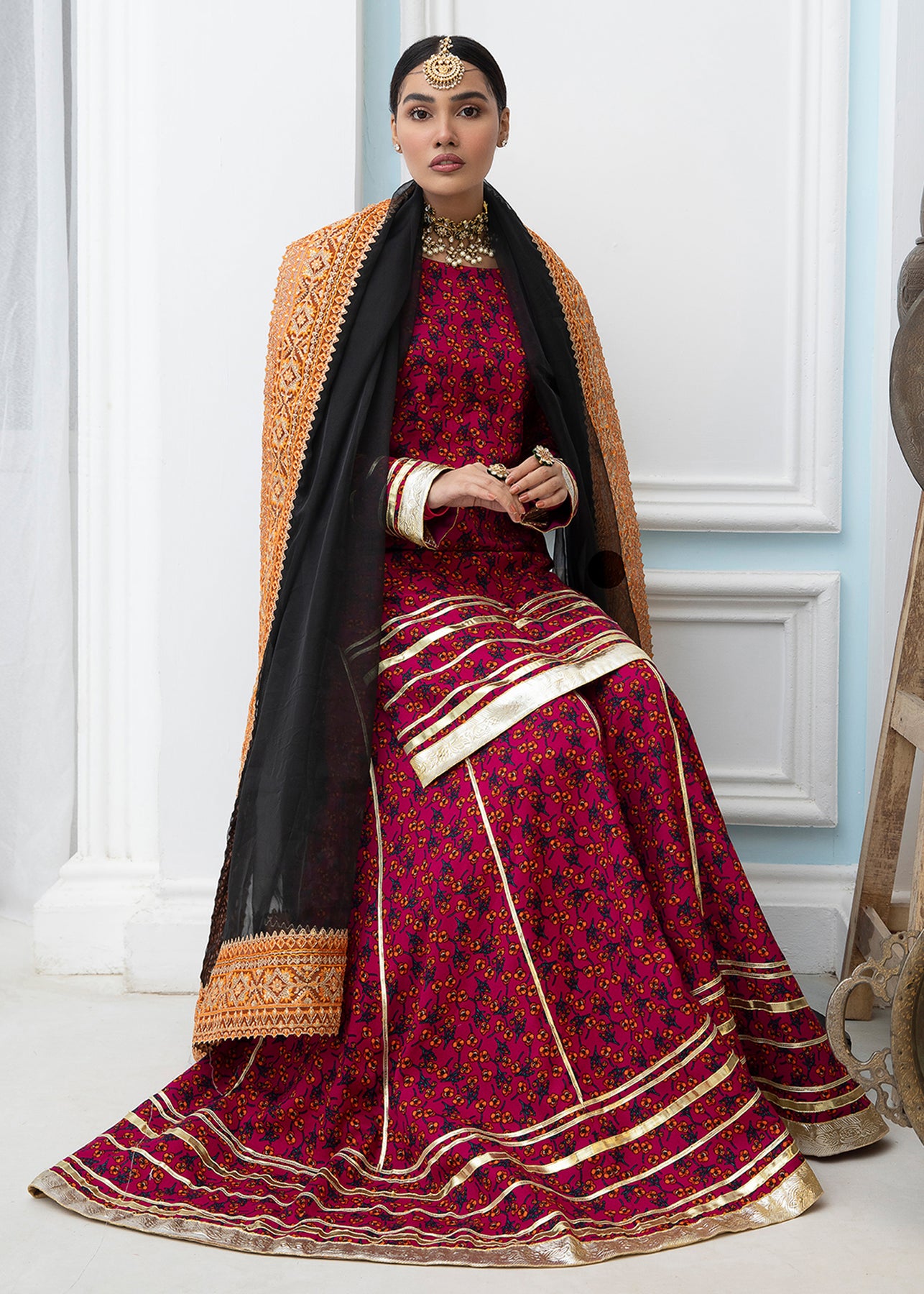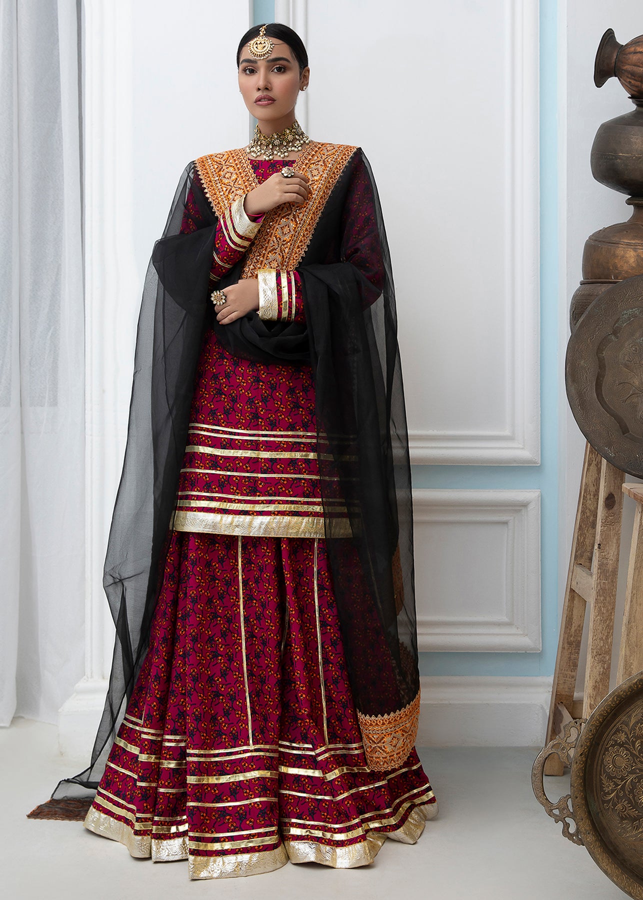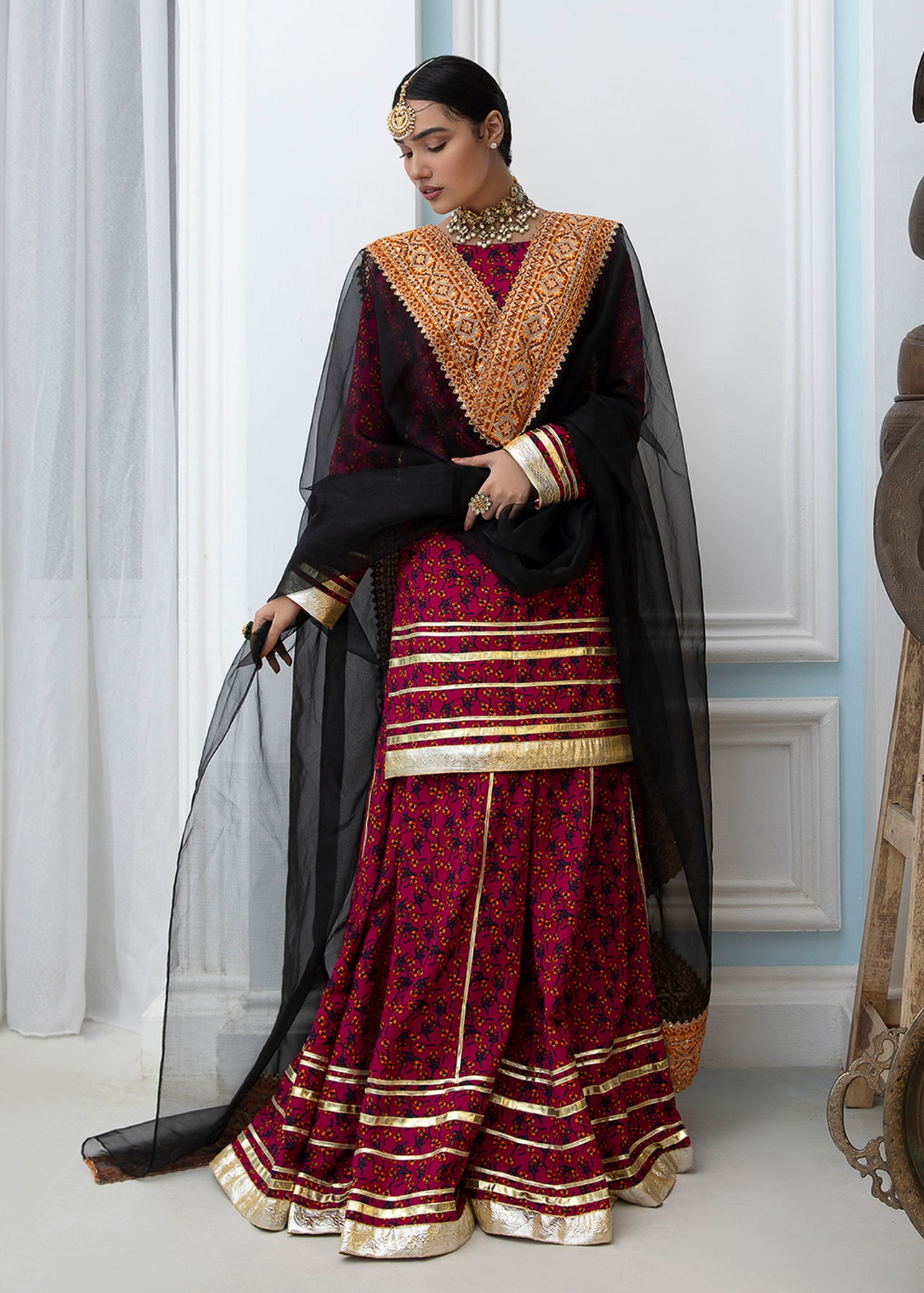 A beautiful cotton silk shirt is hand-rendered with a botanical print and is adorned with gota and lappa work. It is paired up with flared sharara and black organza dupatta having an embroidered orange border with gold sitara.