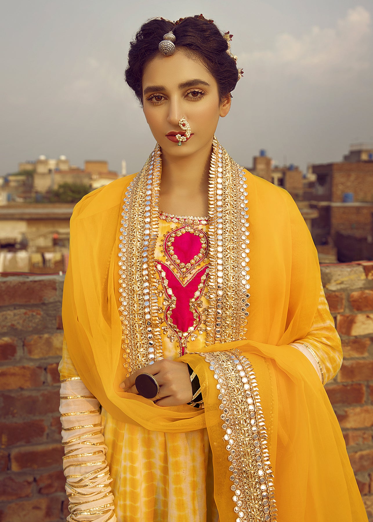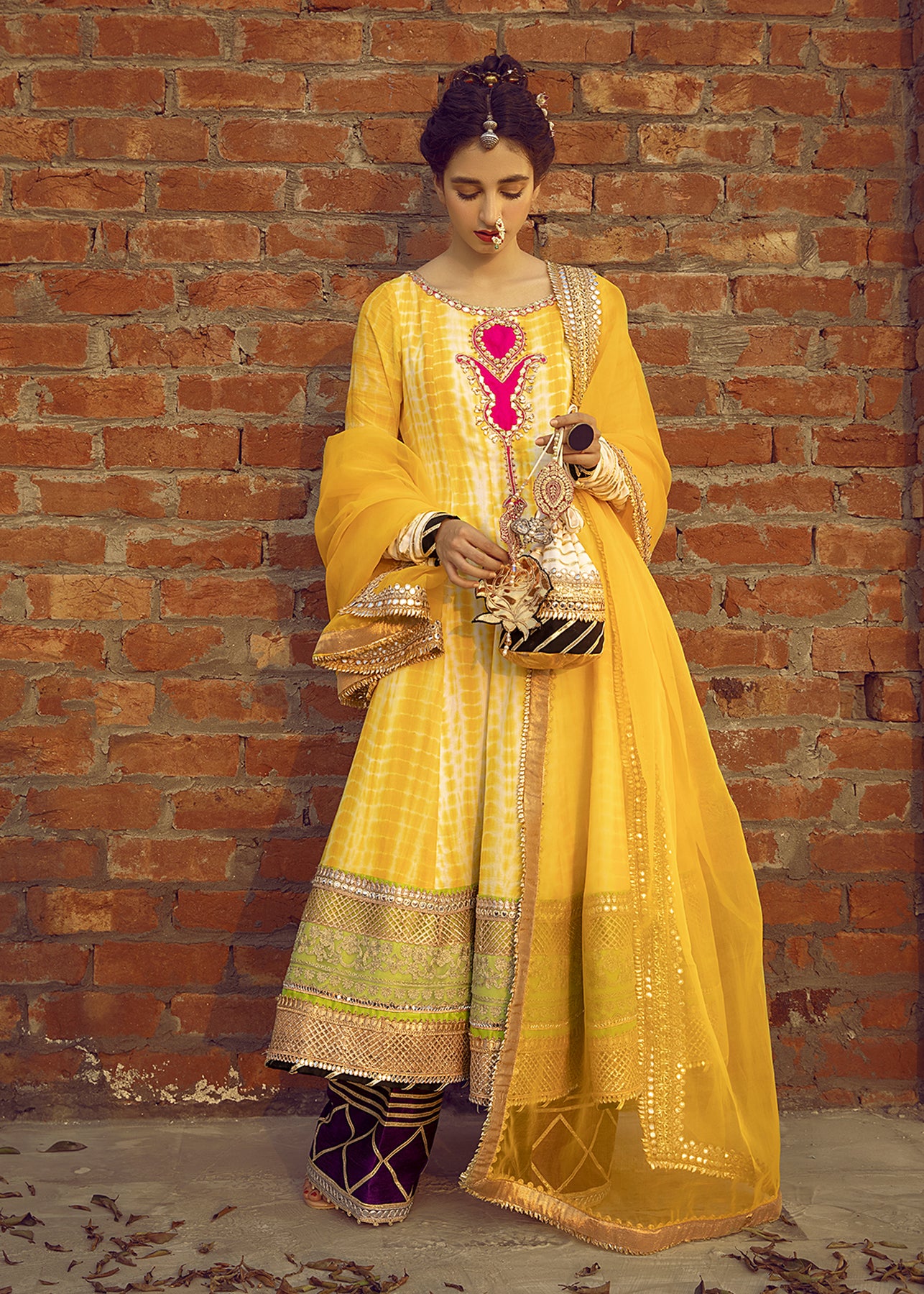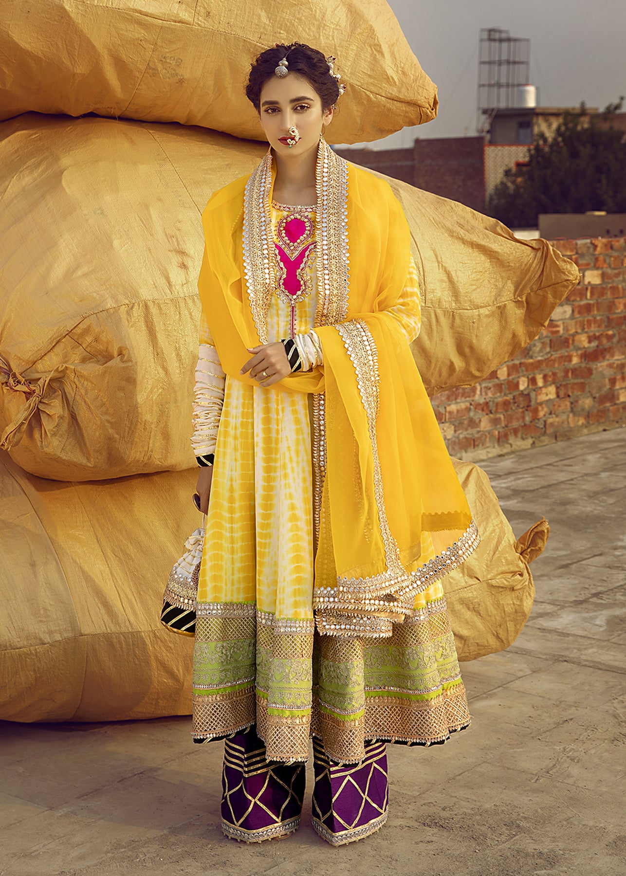 A yellow tie and dye cotton pishwas is adroned with hot pink gota details on the neckline to add a festive feel. It is paired up with contrasting silk pants in a bright purple hue and yellow organza dupatta having a gota border.