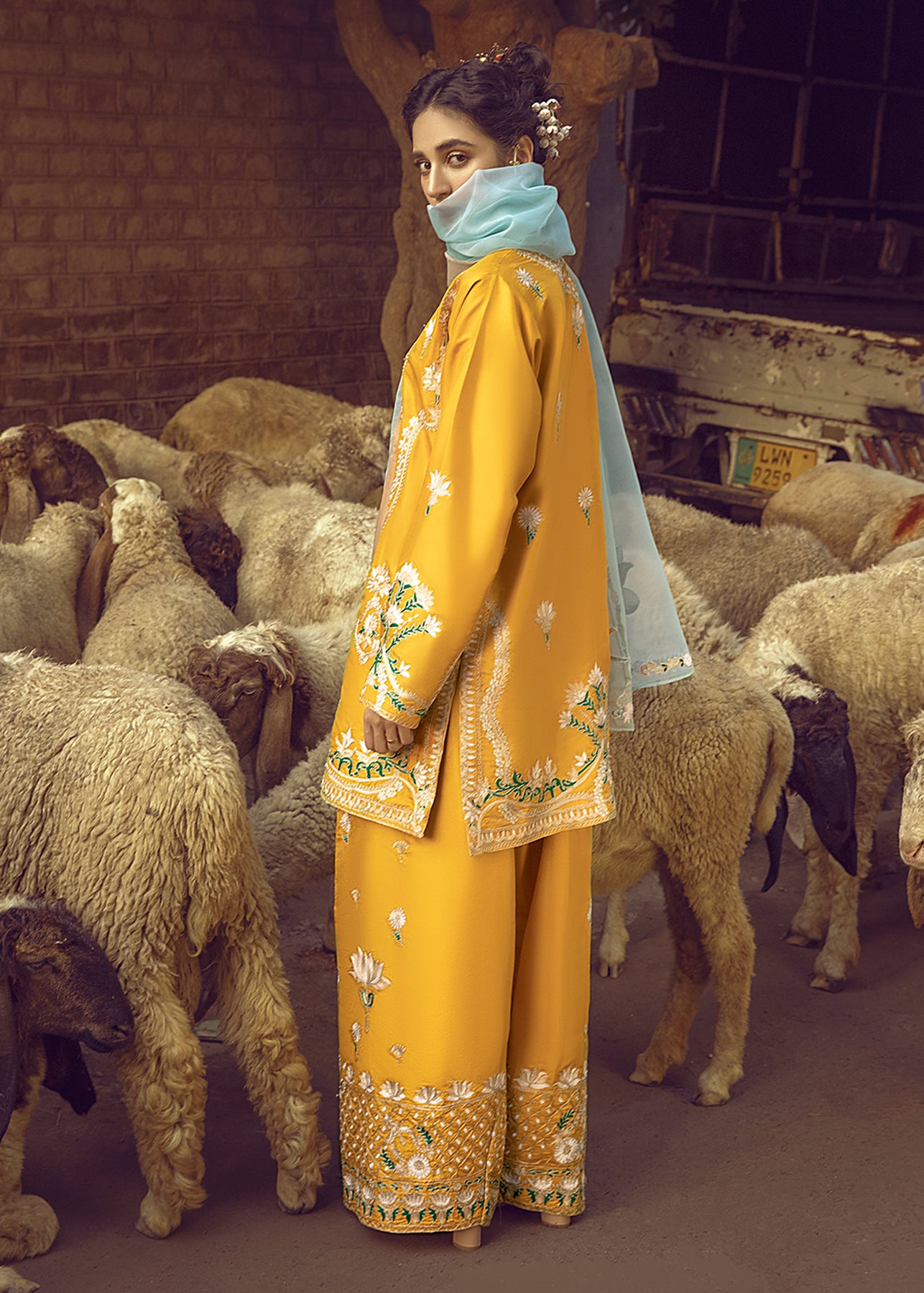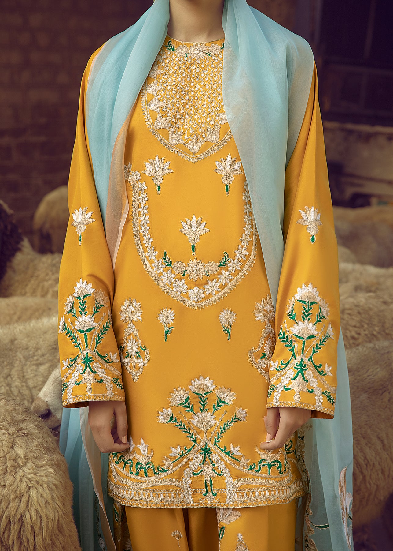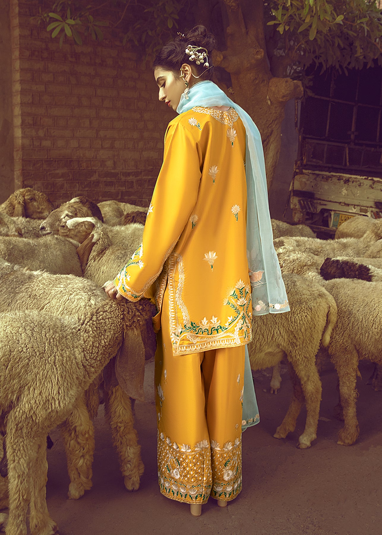A mustard-yellow shirt and shalwar in kattan silk are meticulously designed by artisans using our signature aari embroidery. It is paired up with a gorgeous shade of ferozi dupatta that is further enhanced with aari motifs.