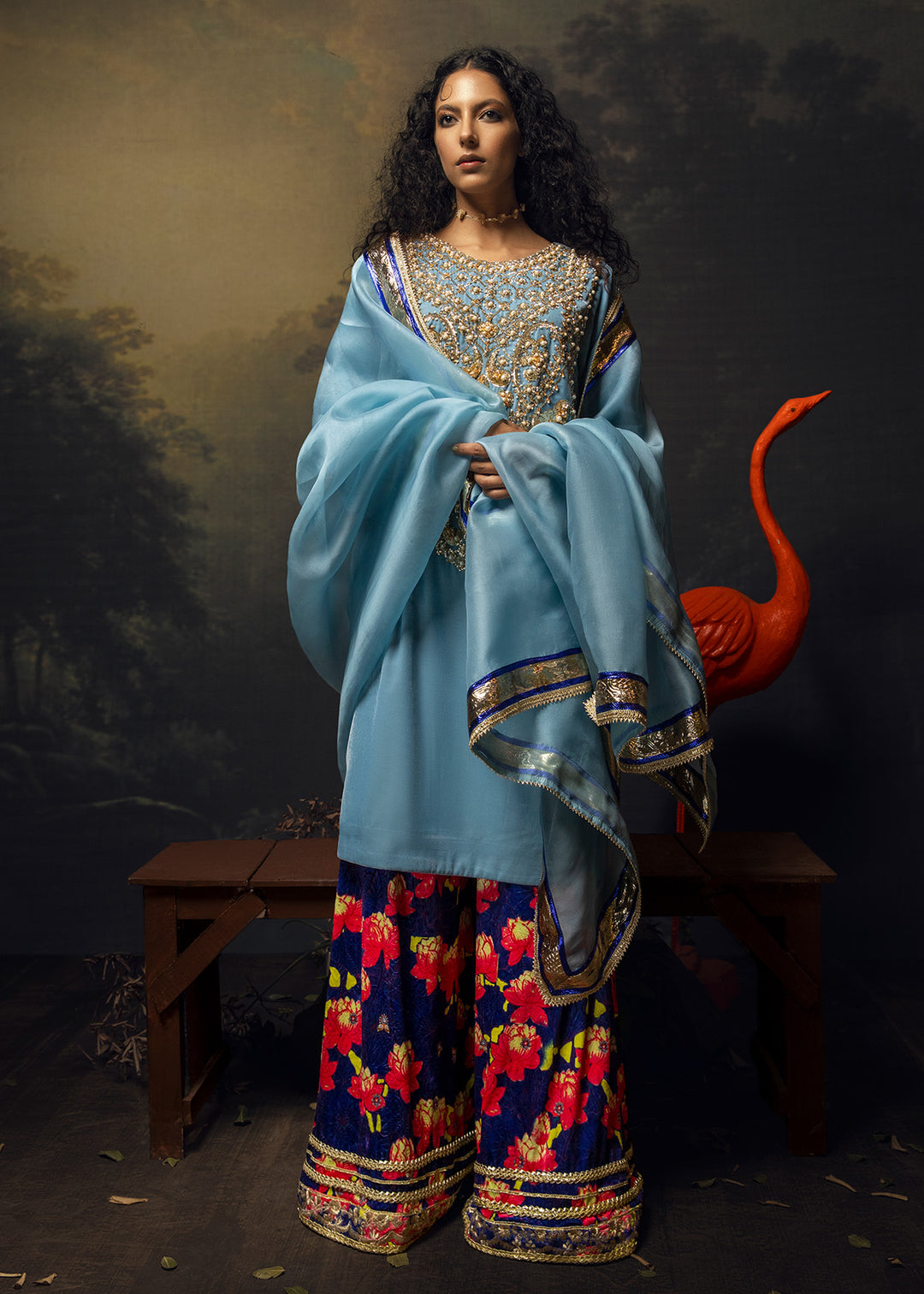 • Gul-e-Rana: Floral embroidery layered over a rich canvas of color