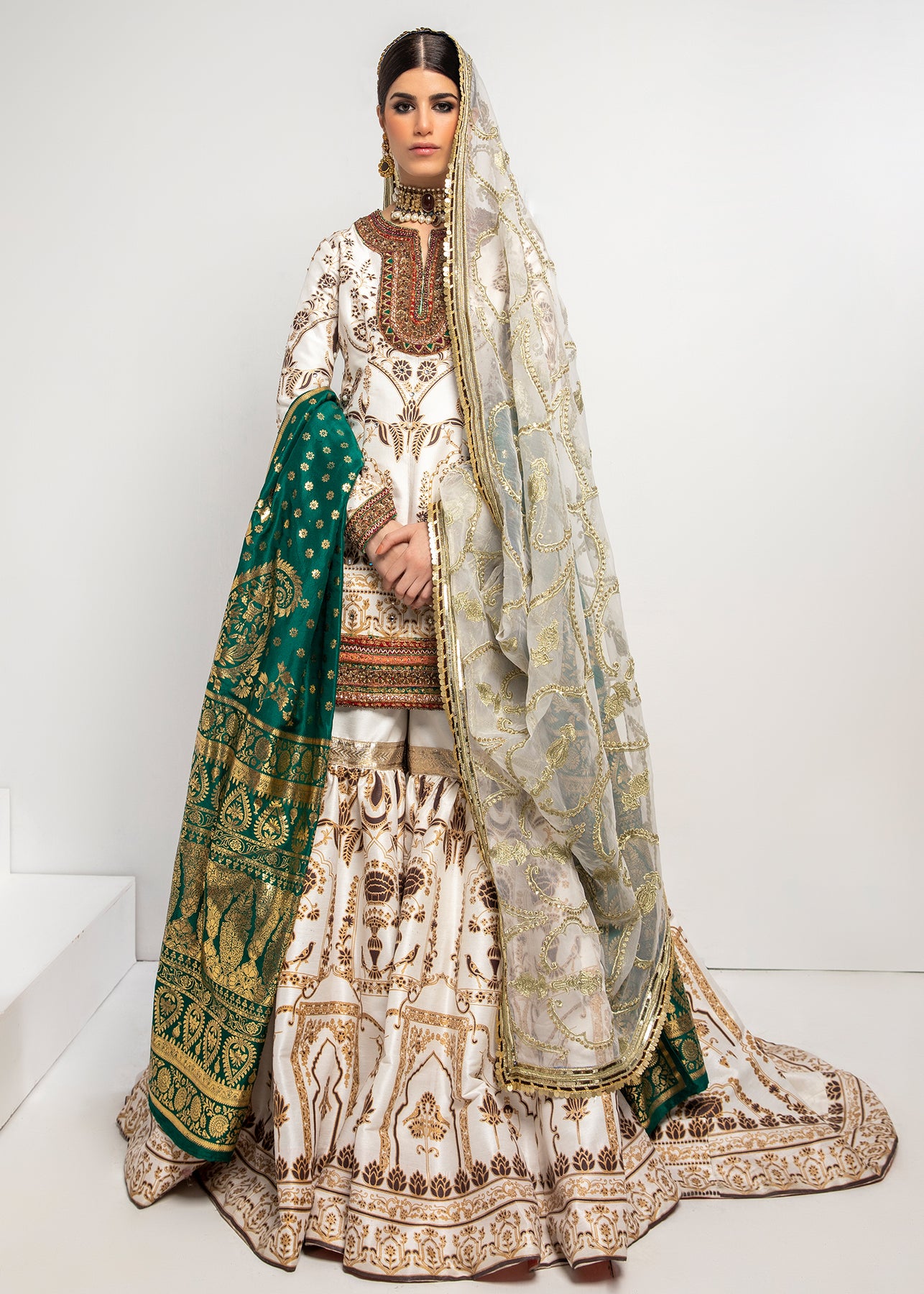 A gorgeous short shirt has a screen-printed base with mughal architecture inspired motifs. It is enhanced with traditional naqshi and antique dabka work on the borders and neckline. This is paired up with a furshi garara and organza dupatta with a geometric pattern in tilla embroidery.