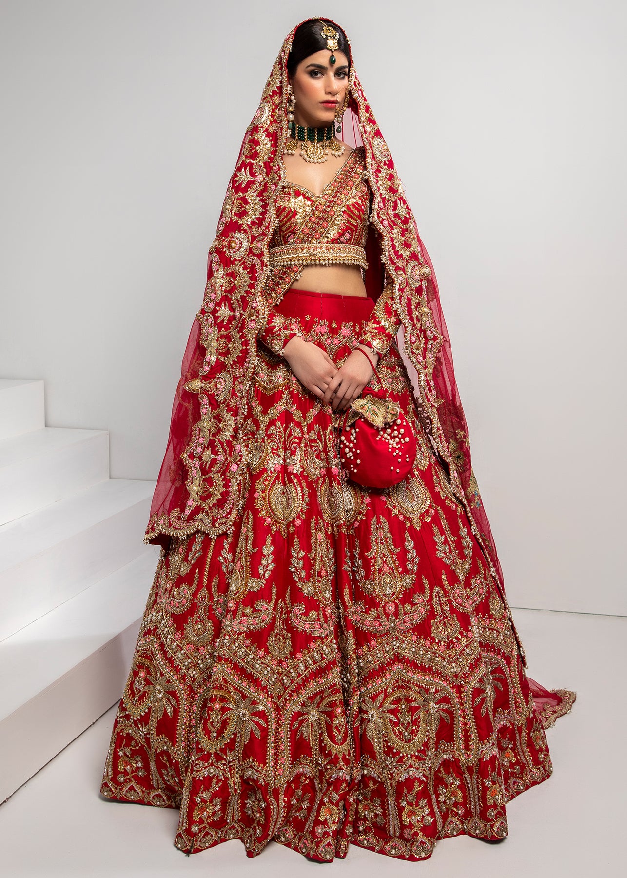 A crimson red pure raw silk base serves as a canvas to beautifully handcrafted motifs incrusted with kora, dabka and sitara. It is further adorned with pink and ferozi resham. It is paired up with a choli with beautiful butterflies and two dupattas. The first one is in net with scalloped border and our statement aari work while the other is in Chiffon mukesh with a gorgeous linear border.