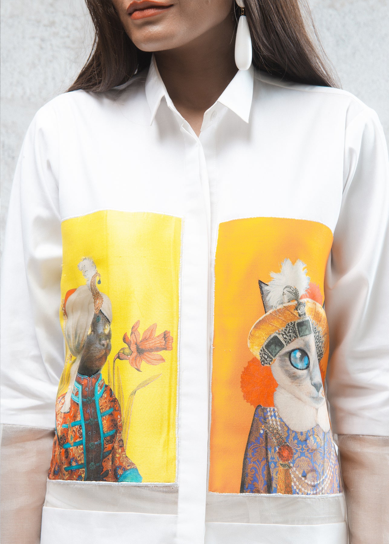 Cotton and pure raw silk, bright fun digital prints. French organza detailing