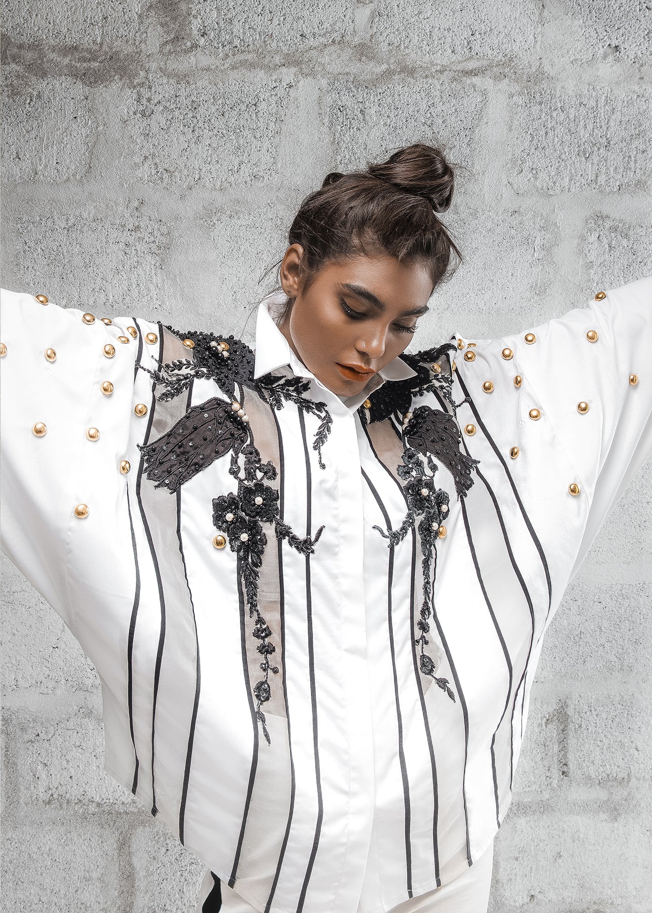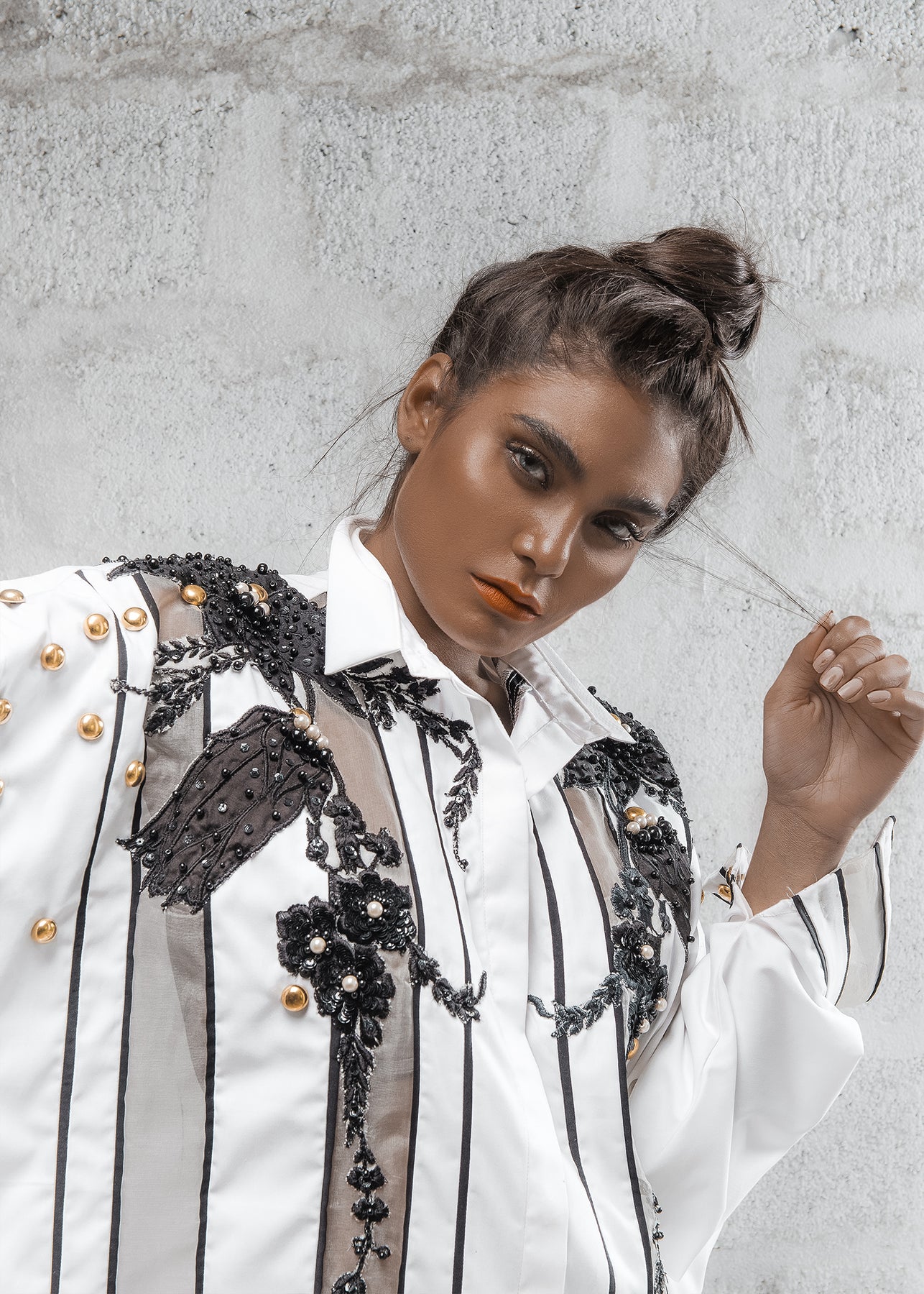 White cotton button down with pure french organza details. Black heavily embellished flowers and metallic studs.