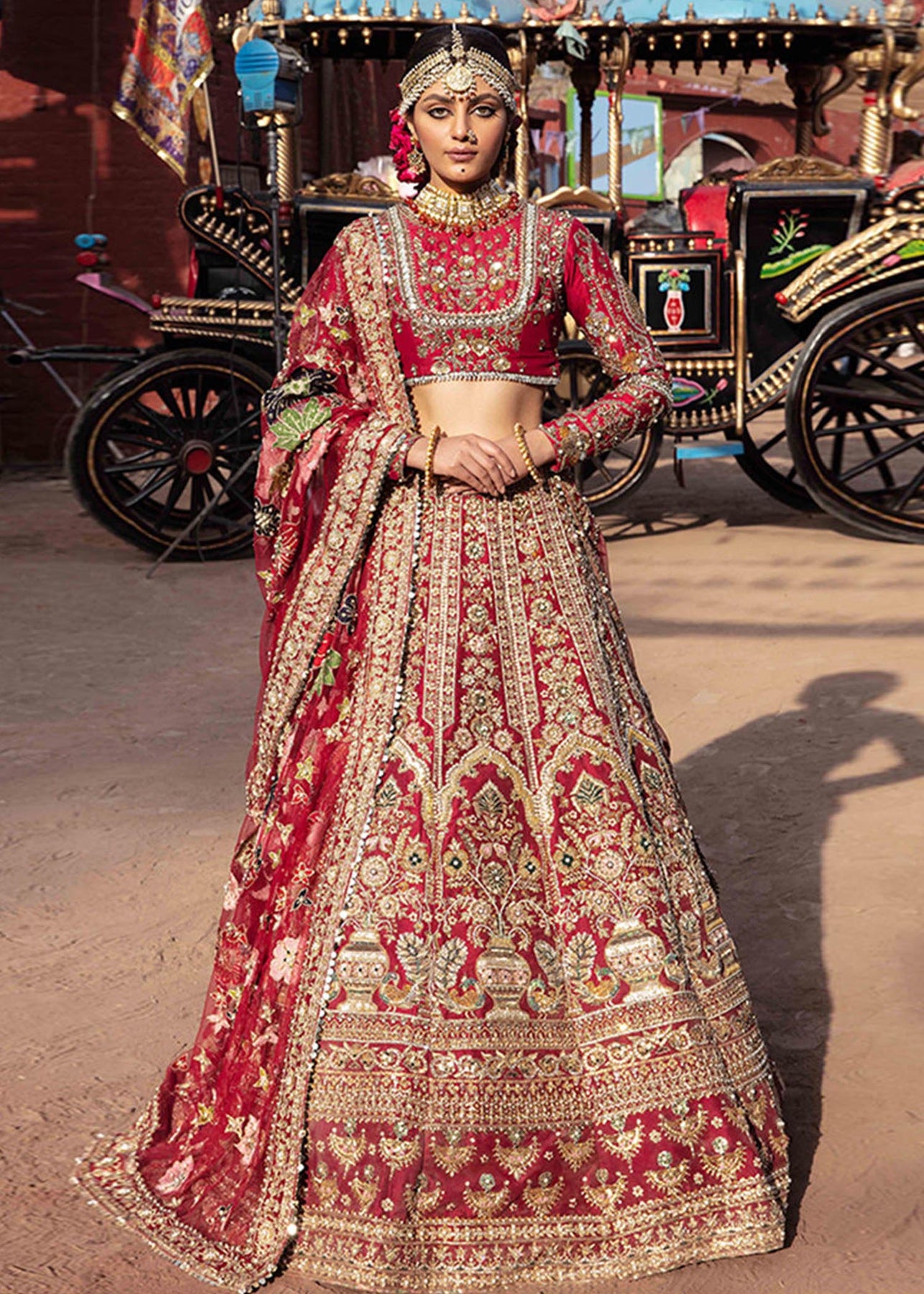 The ruby red raw silk lehenga choli is handmade with love by the Ali Xeeshan artisans to create a classic red bridal that would be worn by generations ahead. It is intricately embellished over sleepless nights with pure zardozi, crystals, sequins, pearls, stones and resham. The matching ruby red net dupatta is worked with multicoloured aari, zardozi, pearls, sequins, crystals and finished with tilla and pearl edging. The red net veil is sprayed with pearls, embellished with sequins, pearls and pipes and finished with a scalloped edging.