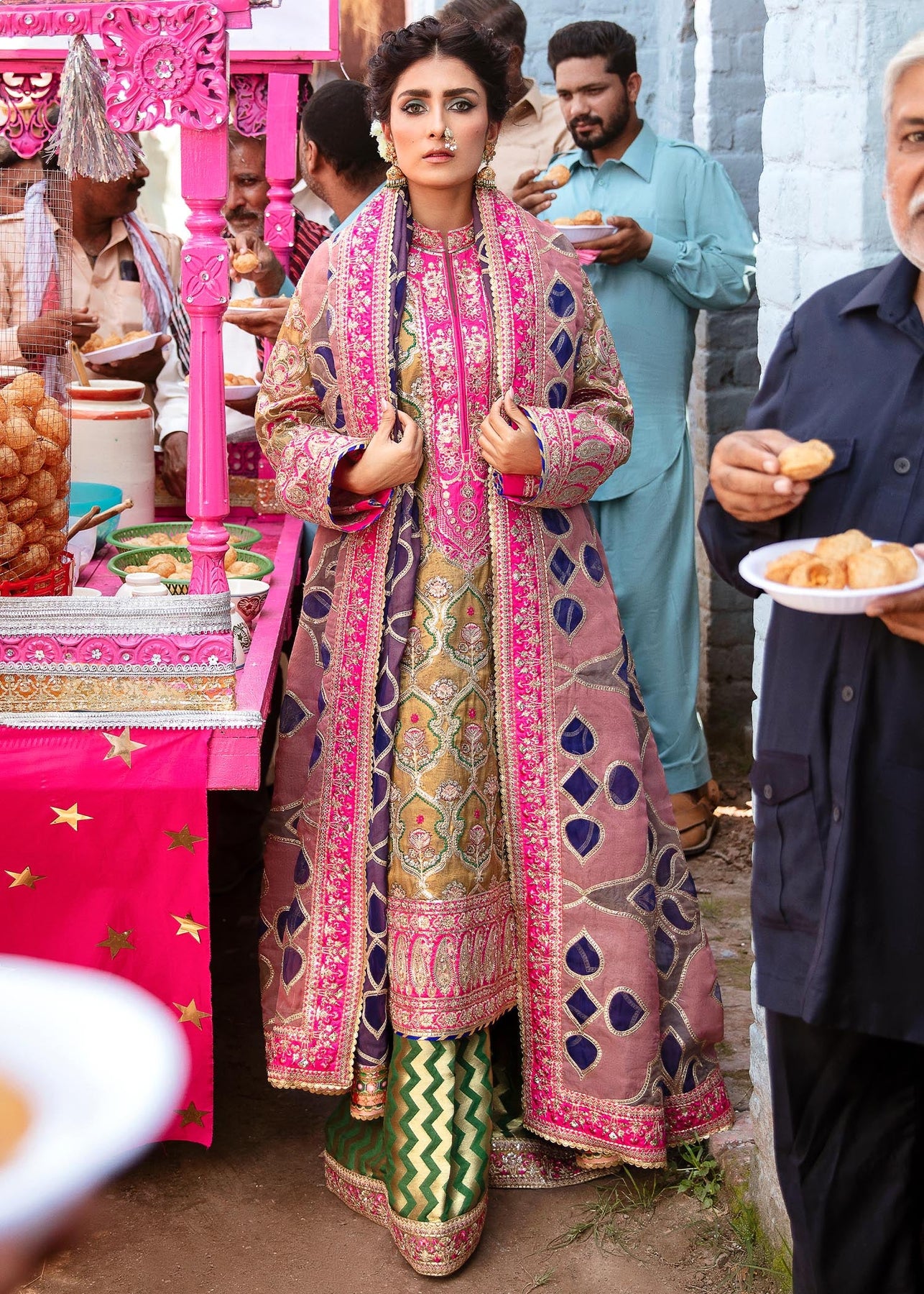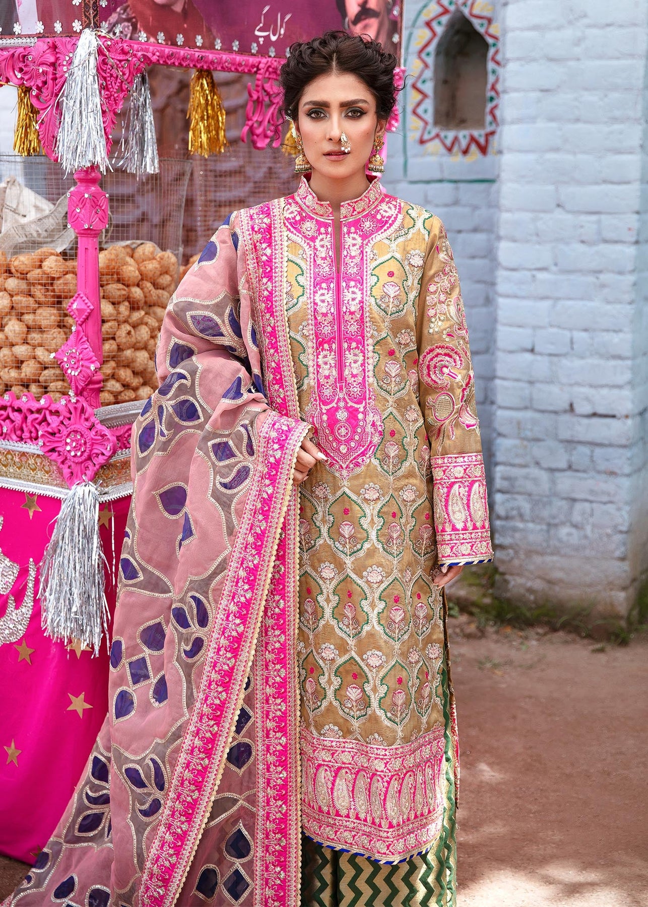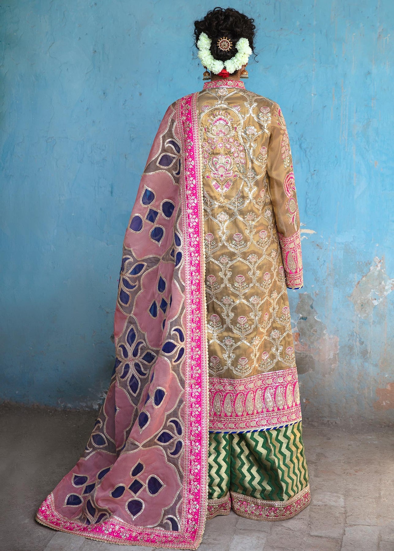 Description: A bronze masoori shirt has a lovely architectural inspired design married to floral motifs in gold tila and sequins. The neckline and hem are rendered in hot pink while the trouser is in green raw silk with vertical chevron pattern and embroidered borders. It is paired up with a multi-coloured dupatta with embroidered borders
