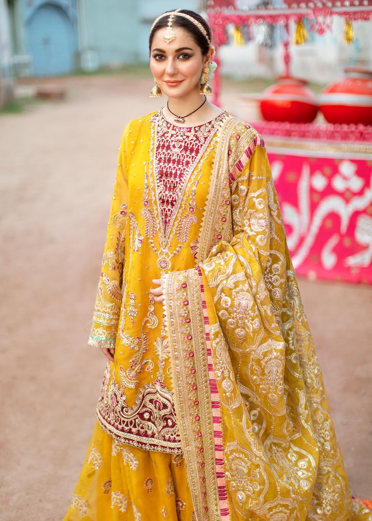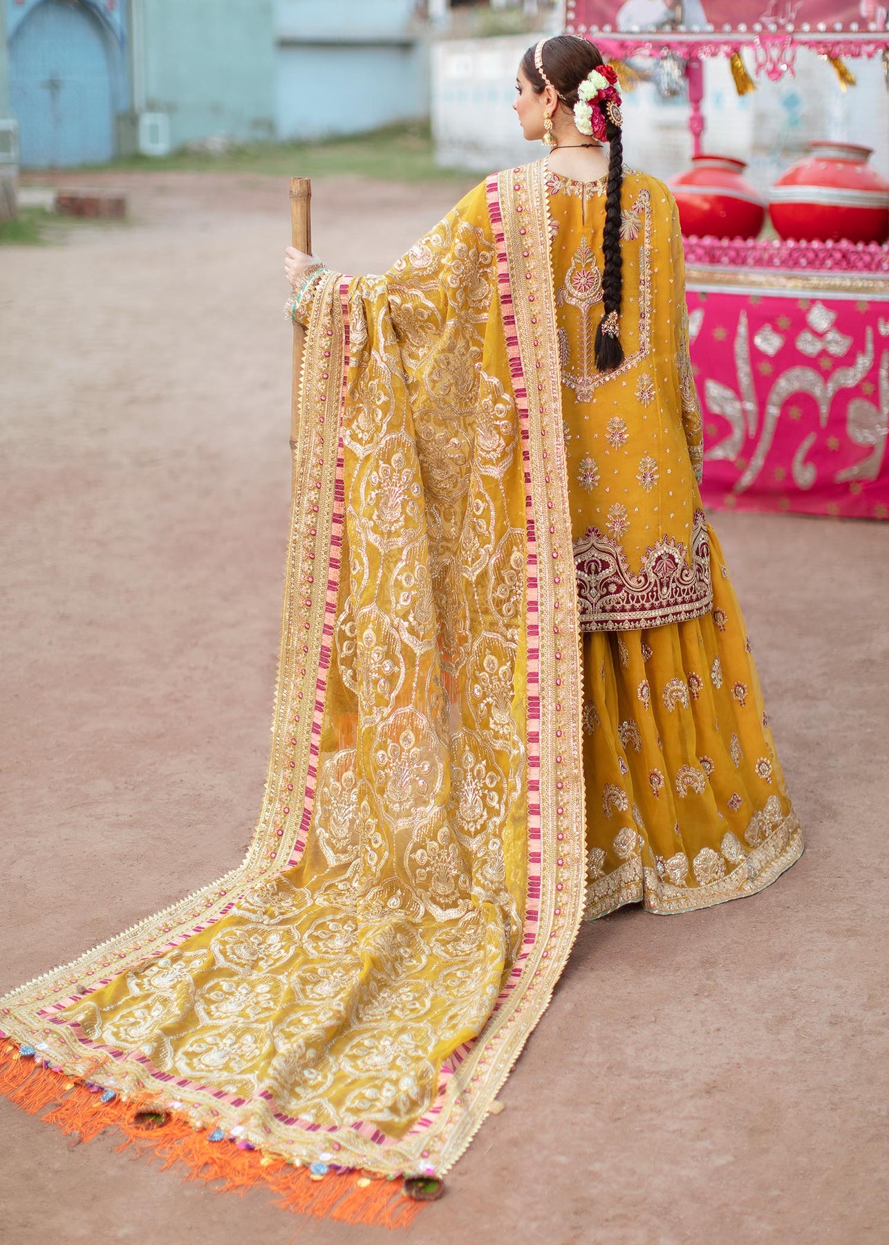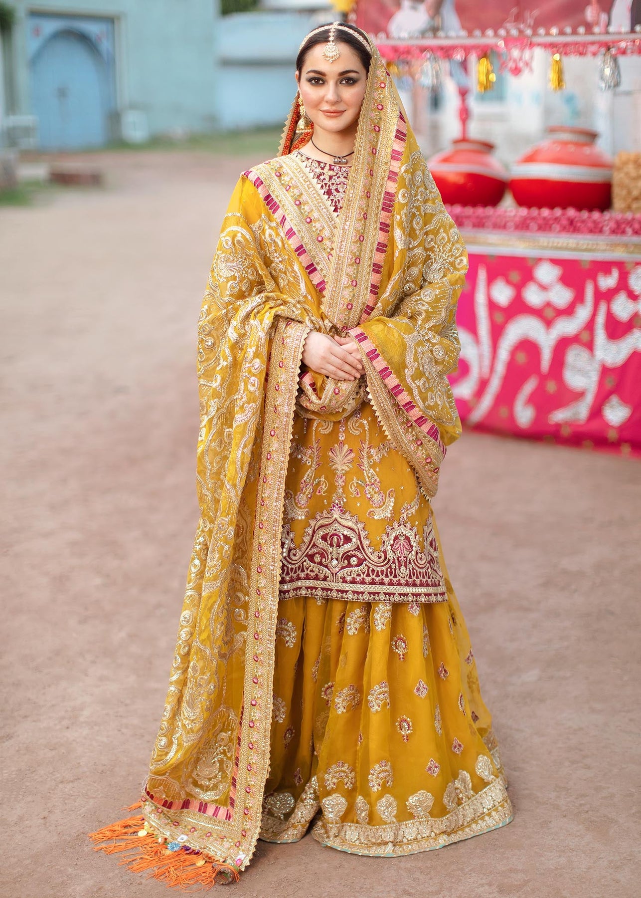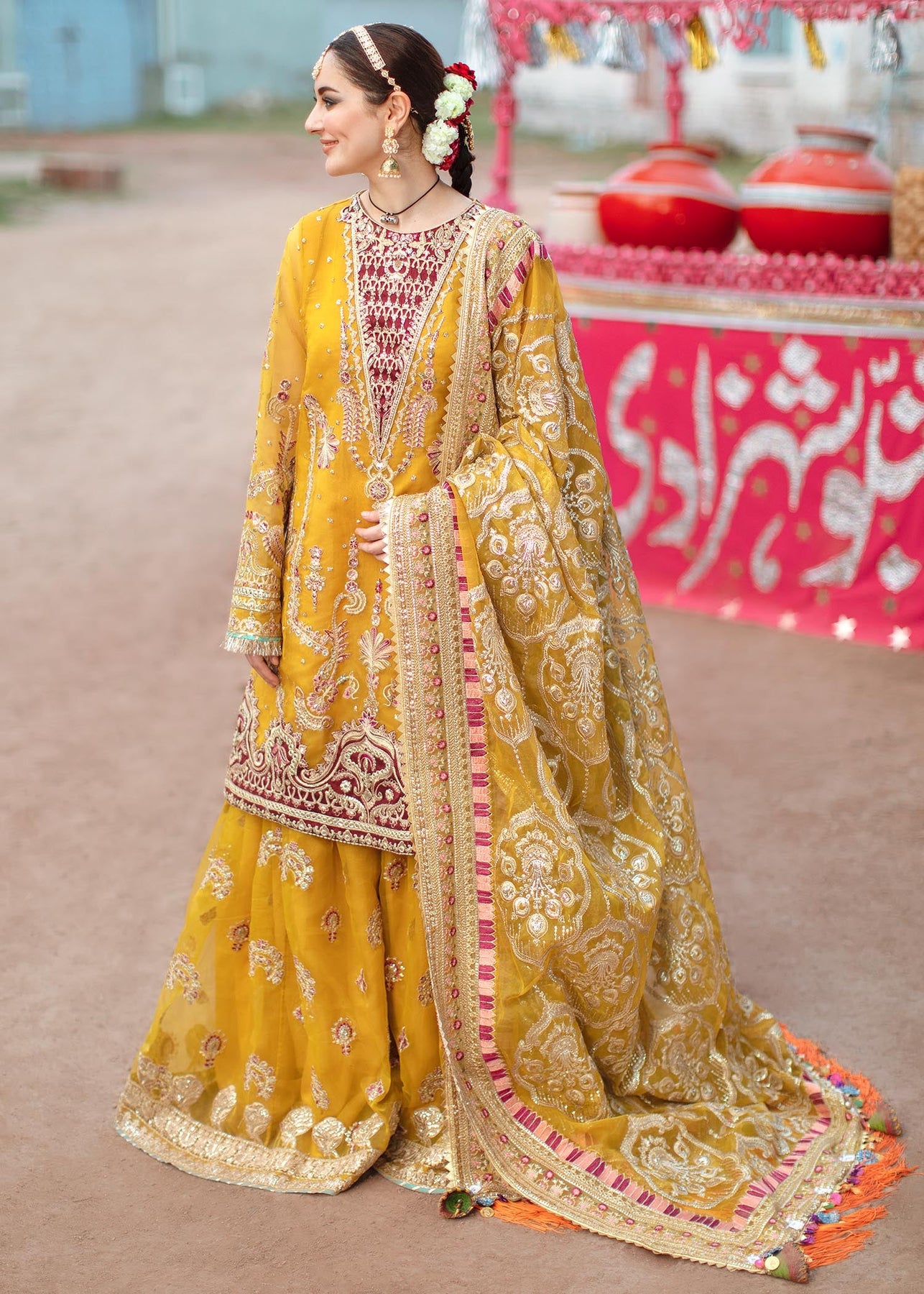 Description: A beautiful designed rich mustard gharara and shirt on an organza base has intricate details of gold sequin and tilla. A contrasting maroon embroidery on the neckline and scalloped border at hem are the star of the show. It is paired with an organza dupatta with beautiful motifs.