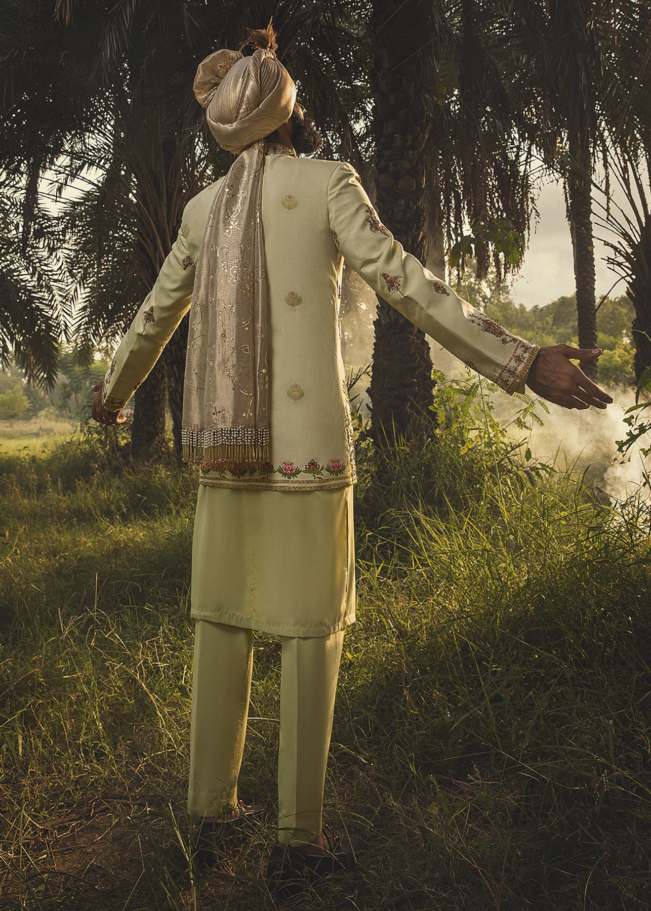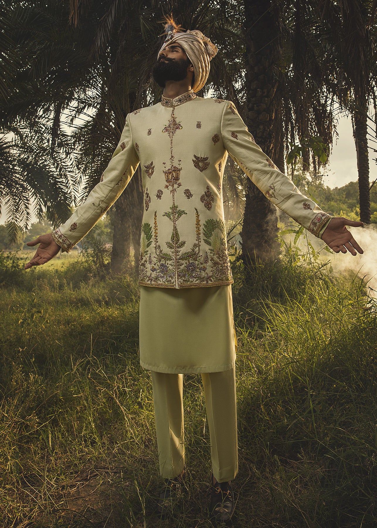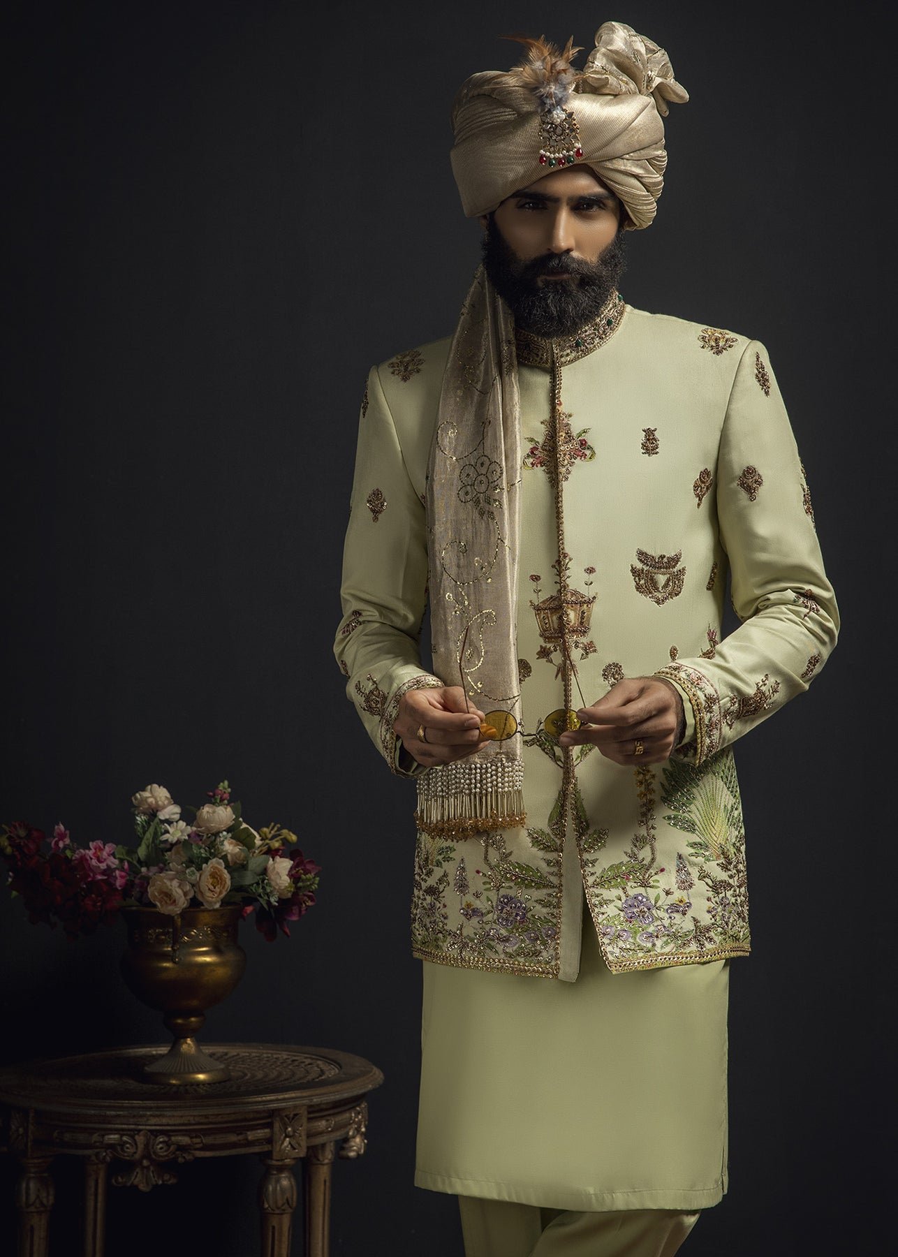 A pastel green hand-printed prince coat in cotton serves as a canvas to unique botanical motifs in grass green and lilac. It is further enhanced with aari work in gold and antique zardozi embellishment. It is paired up with a luscious pistachio inner suit.