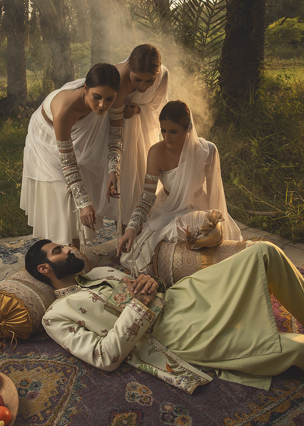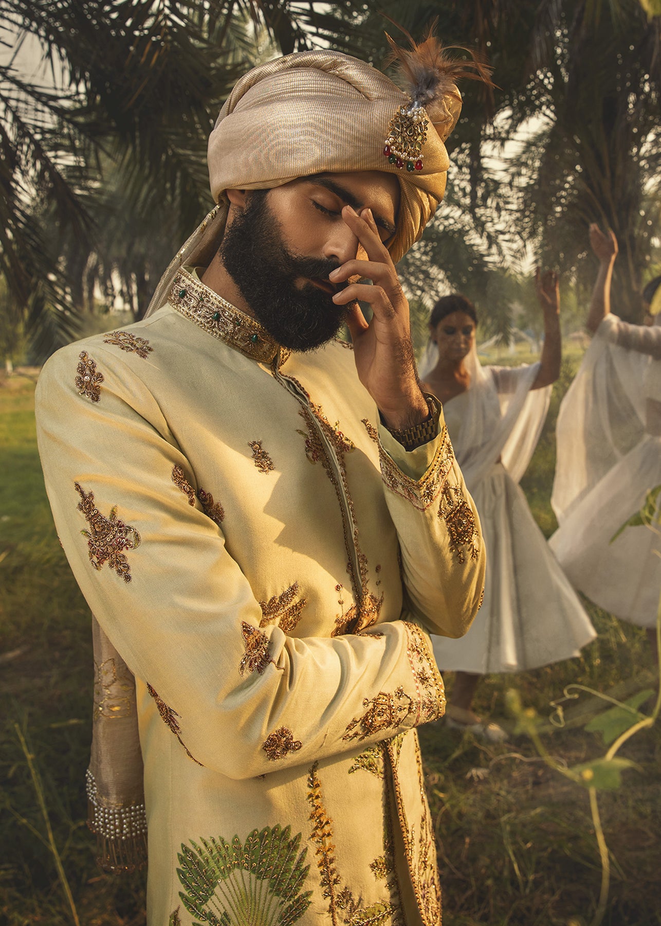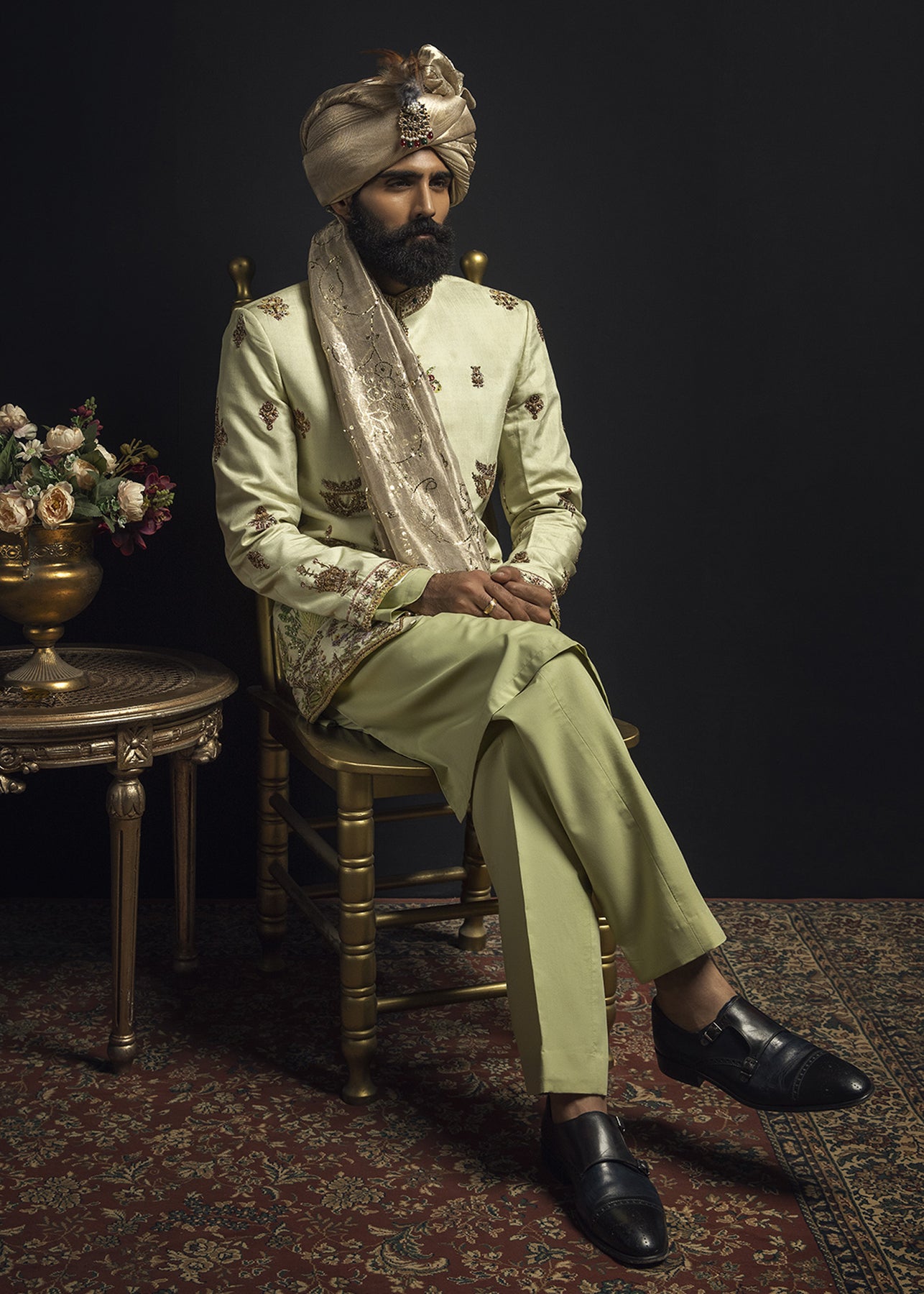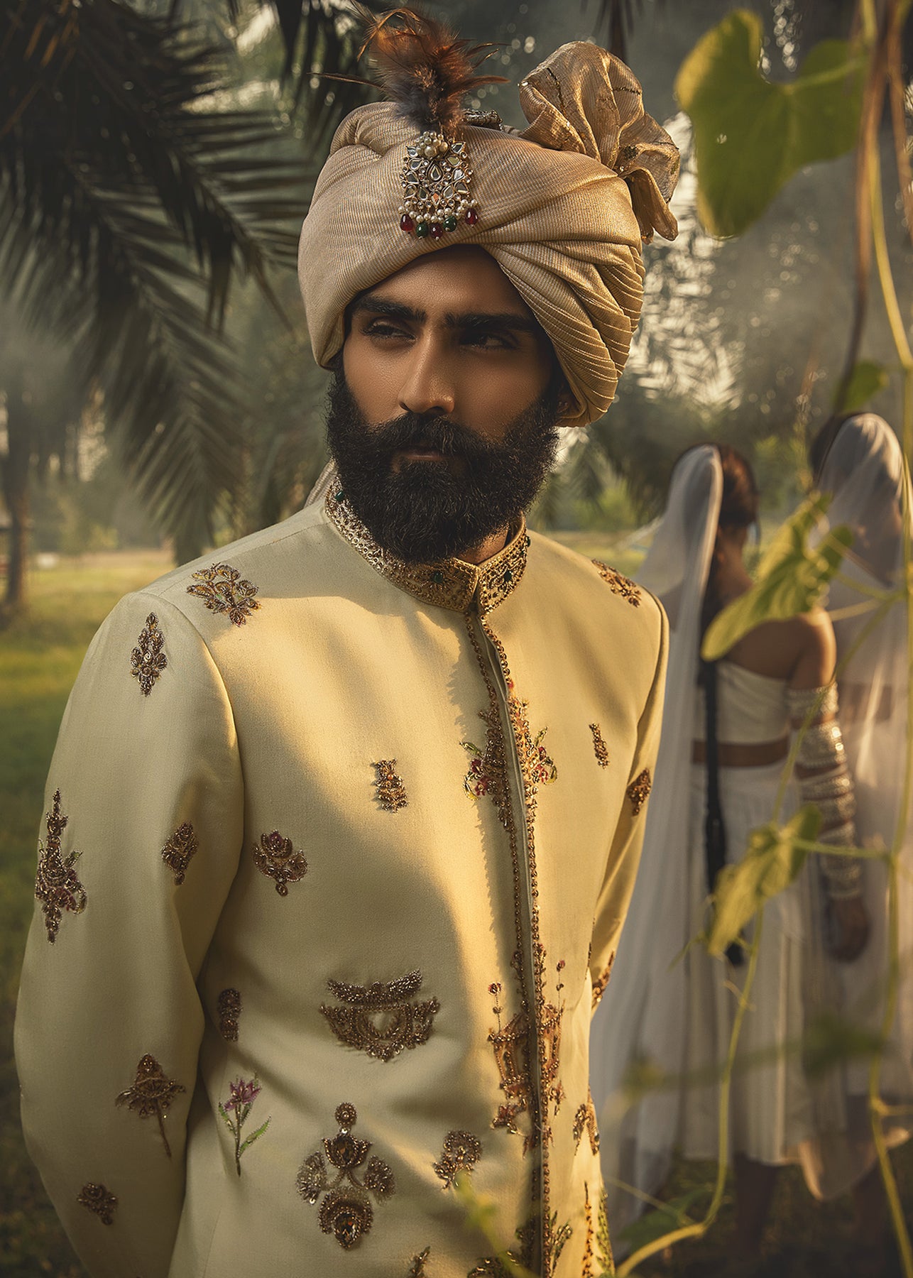 A pastel green hand-printed prince coat in cotton serves as a canvas to unique botanical motifs in grass green and lilac. It is further enhanced with aari work in gold and antique zardozi embellishment. It is paired up with a luscious pistachio inner suit.