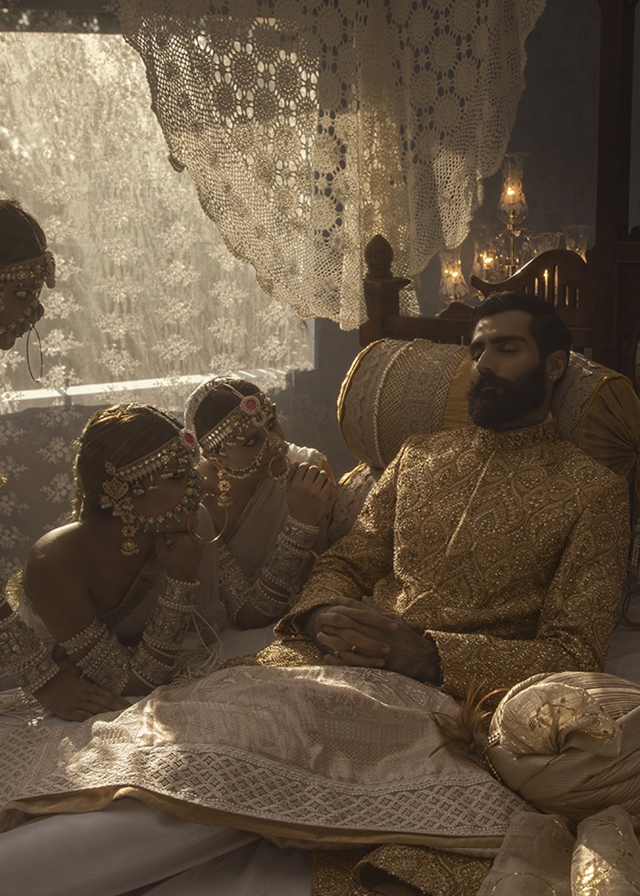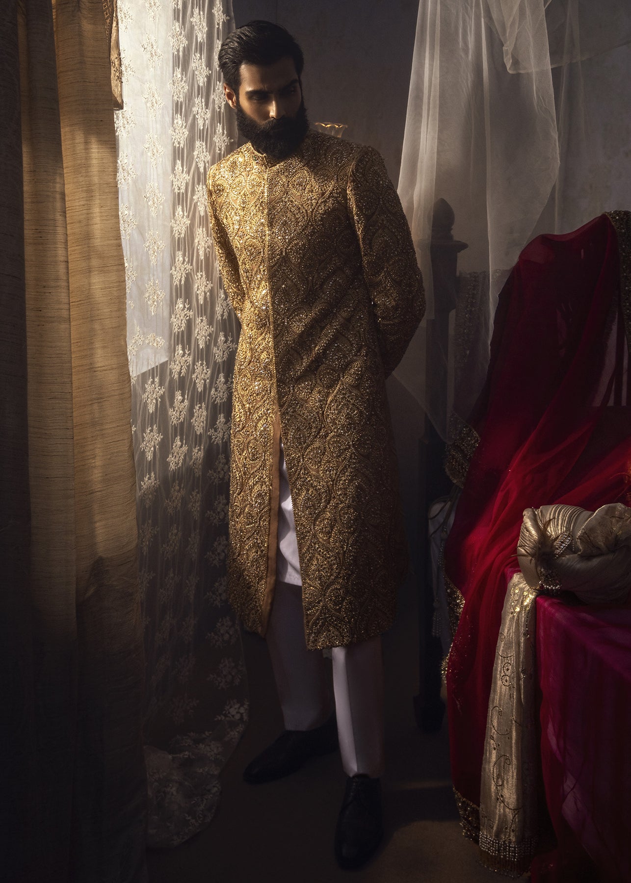 It is a dull gold cotton net sherwani with damask motifs and gold lorex embroidery which is further embellishment in antique sequins and silver stones while the ban collar has french knots and semi precious stones as well. It is paired up with a luscious white inner suit.