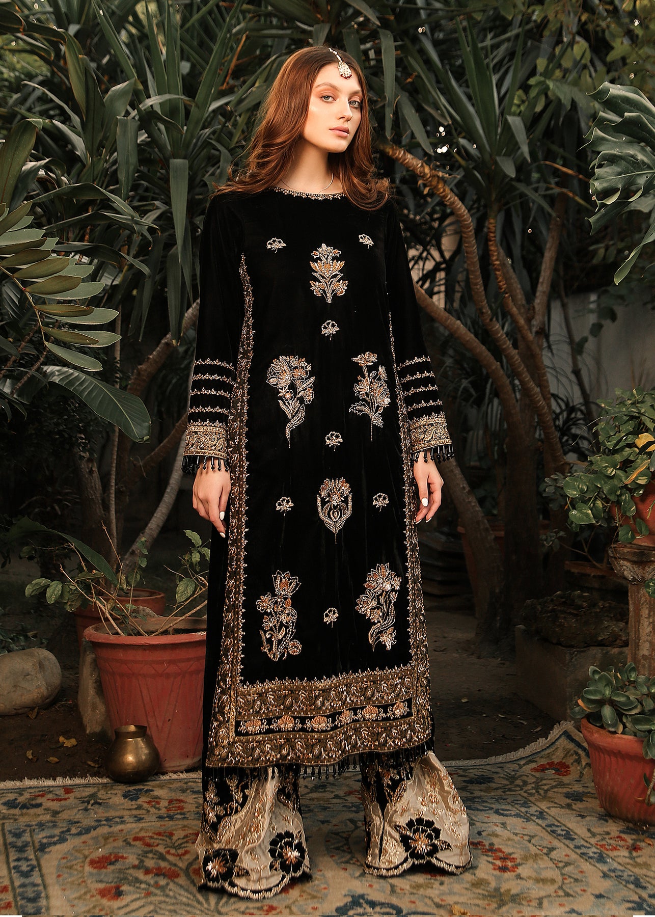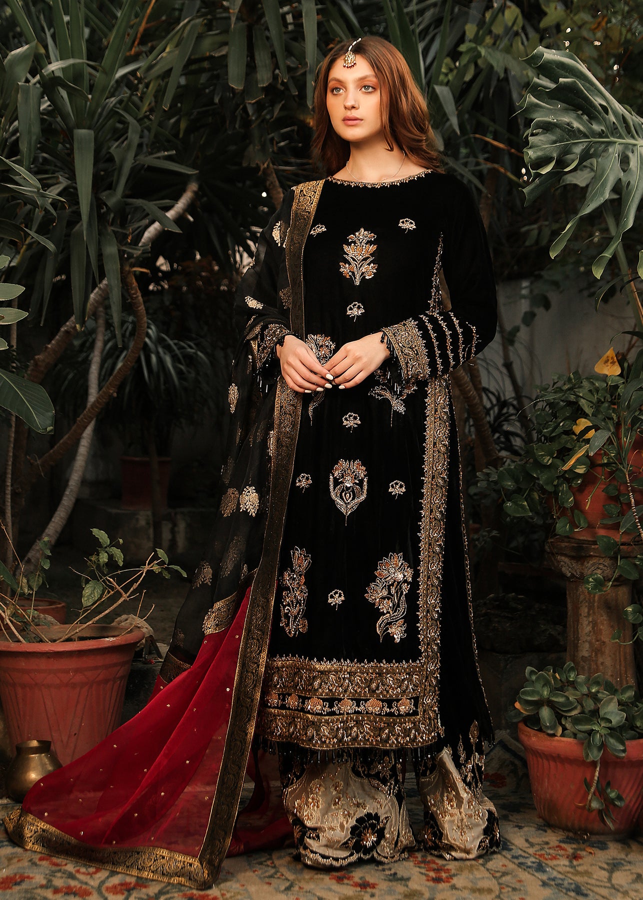 A pure black velvet traditional long shirt. Finished with dabka, kora and gota embellishments. Traditional motifs of kora and sequins. Sleeves and borders embellished with pearls hangings. Paired with a an embellished trouser. Net dupatta enhanced with dark colours in handwork applique work, enhanced with pearls and sequins.