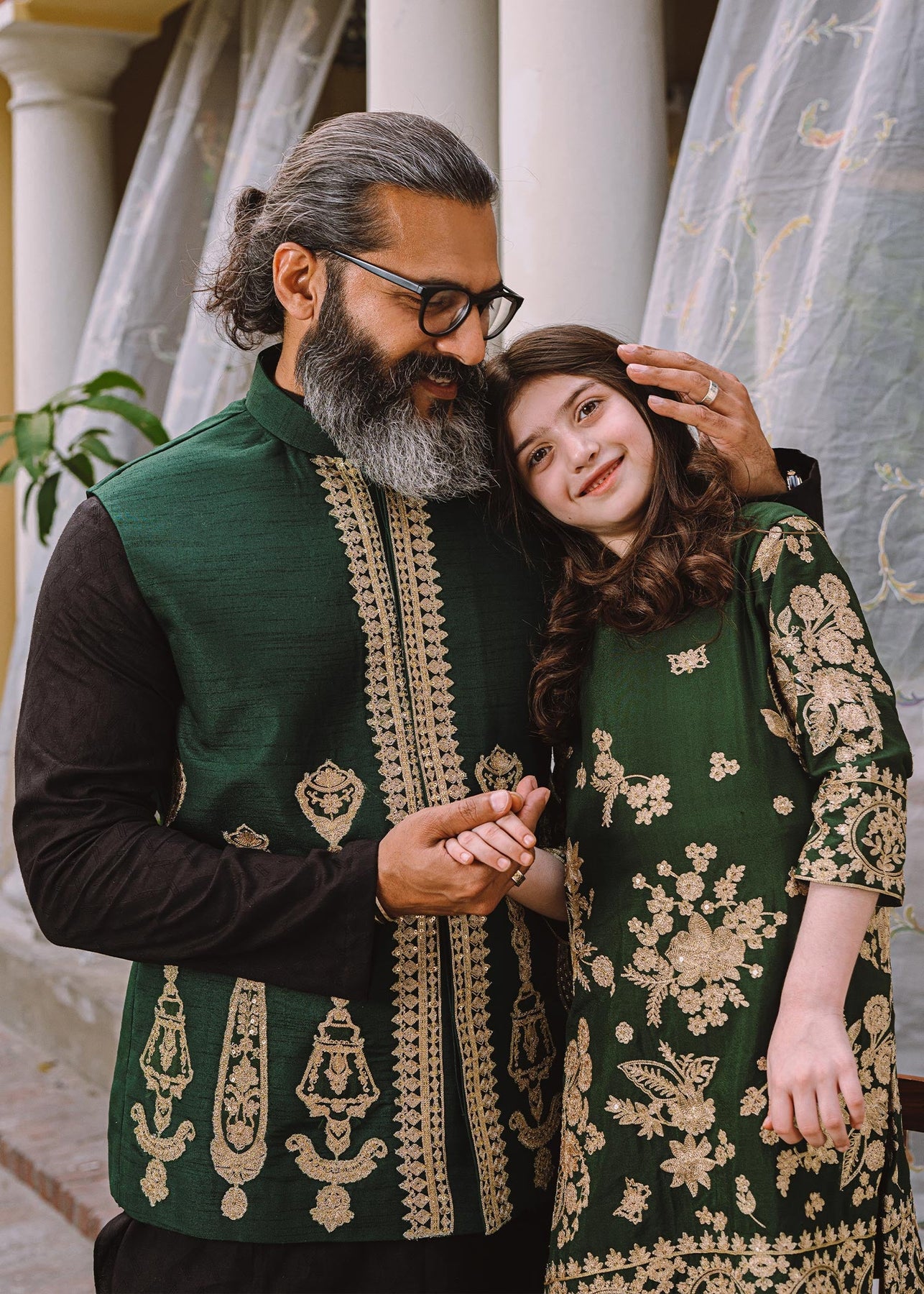 Description: A bottle green silk waistcoat with aari embroidery on it is enhanced with sequins work. It is paired up with a black cotton shirty and trousers.