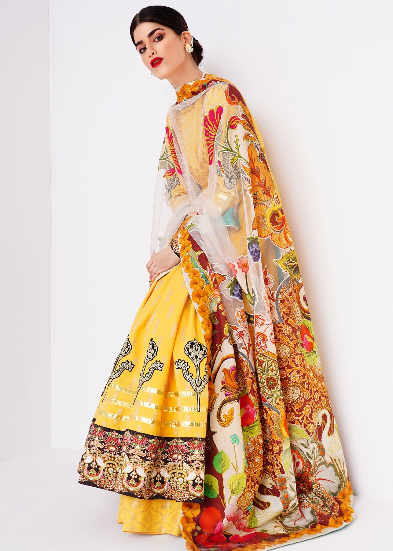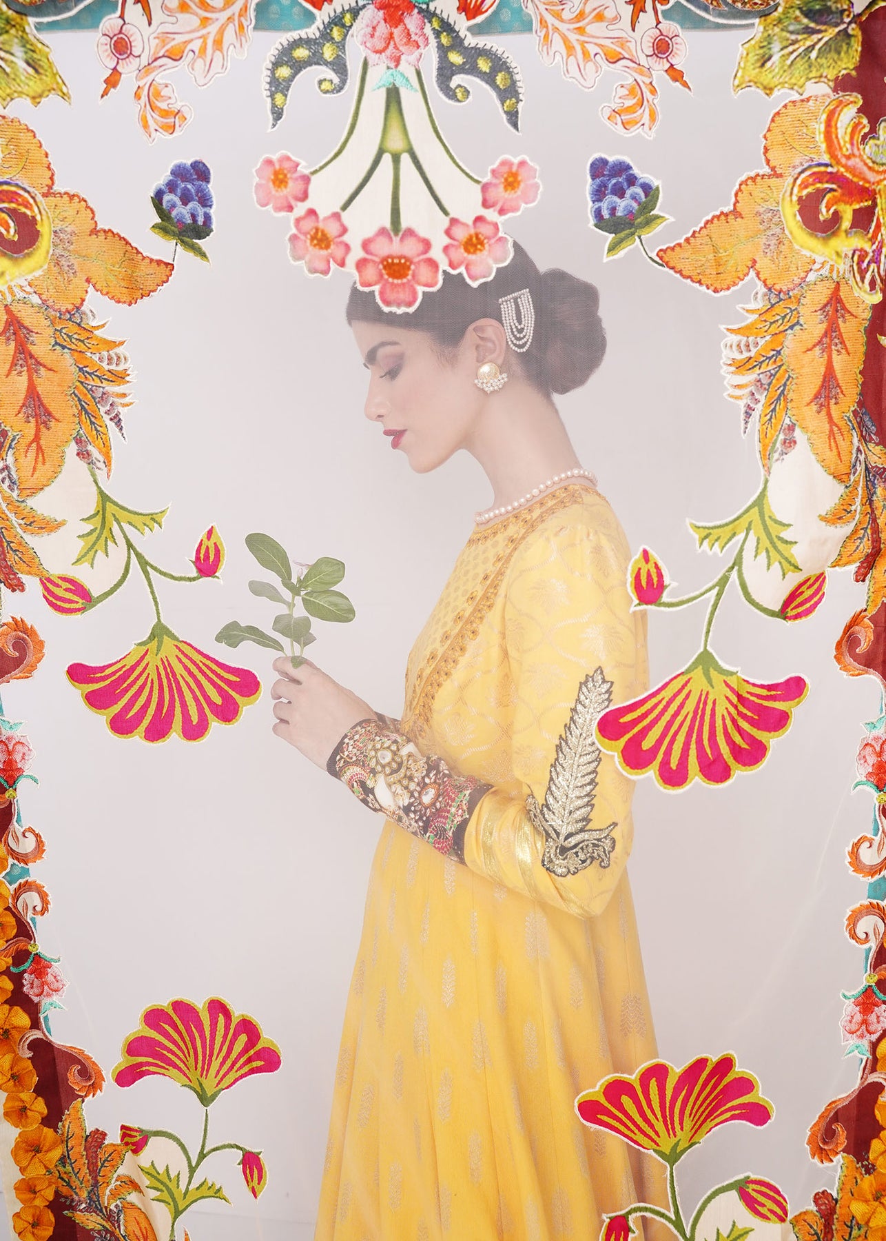 A lPure jacquard mustard hued piece with thread work finishes, tilla motifs and digitally printed silk border with complimenting traditional flower motifs on net dupatta.