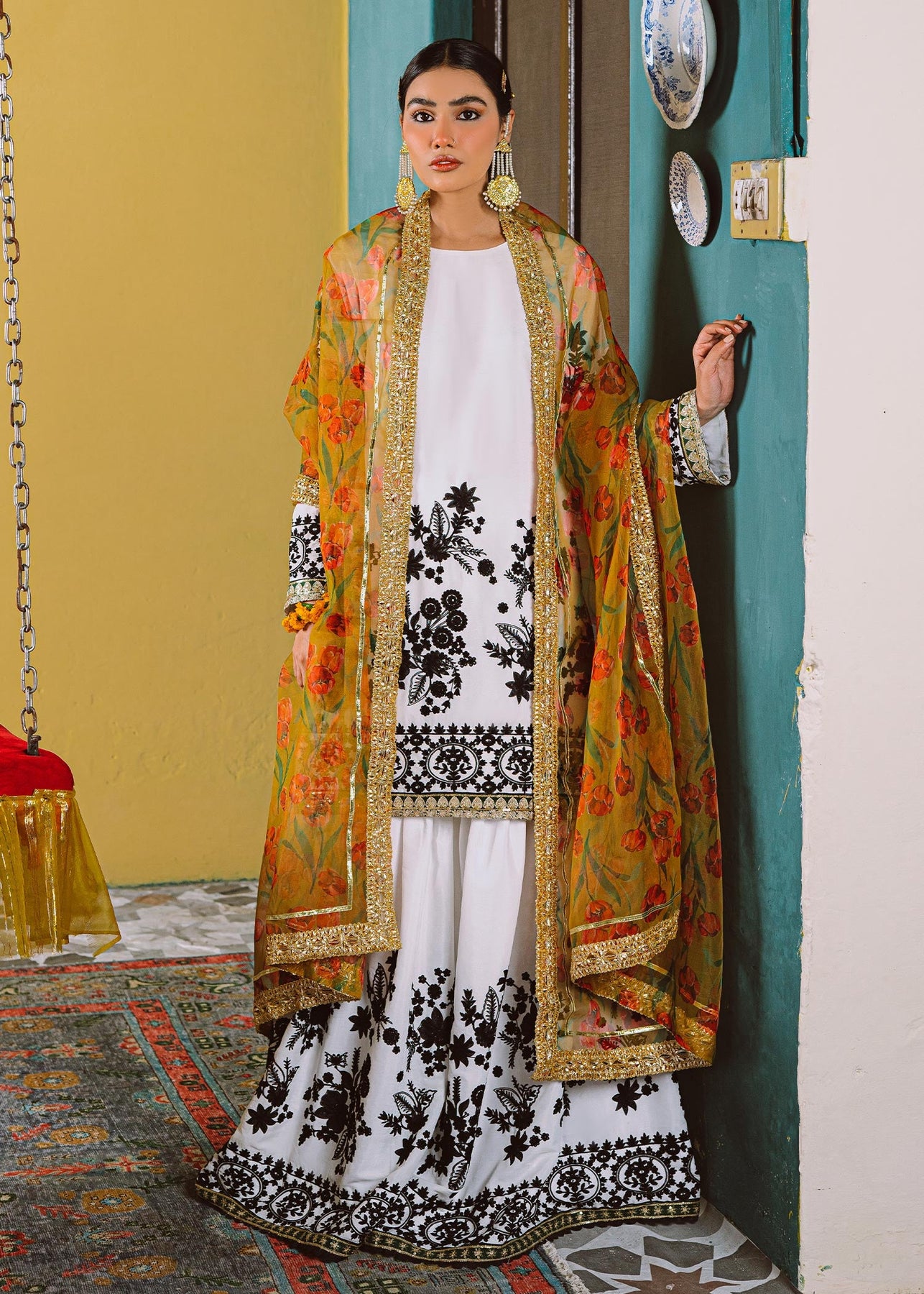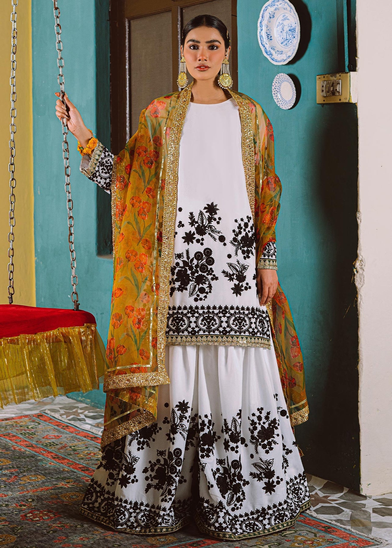 Description: A luscious white silk shirt and ghrara have gorgeous black aari embroidery which is enhanced with black sequins. It is paired up with an hand-rendered, organza dupata which is framed with gotta borders.