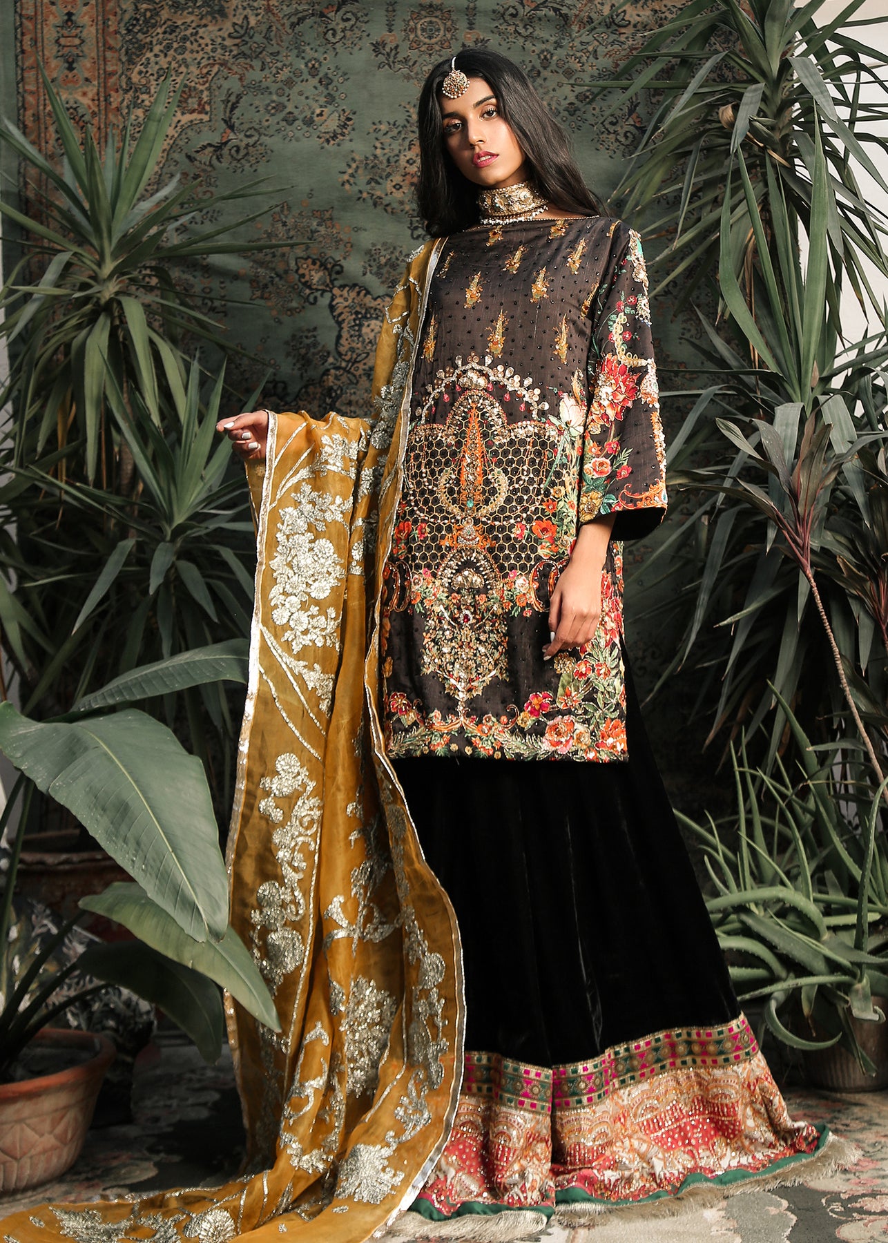 Digial floral print on a pure raw silk base adorned with sequin and gota embellishments. Decorated with beads, antique oxydized tilla and traditional motifs on sleeves and front. Pure net dupatta enhanced with soft colours in handworked applique work with zari and anchor thread.