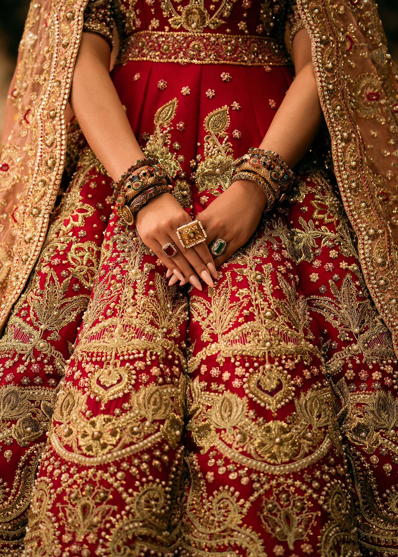 A pure raw silk base in ruby red serves as a canvas to shimmery gold and silver hand embellishments. This lehanga and pishwas is incrusted with naqshi, dabka, resham, sequins and pearls. It is paired up with an exquisite net dupatta in coral shade and has tread work and hand embellishments.