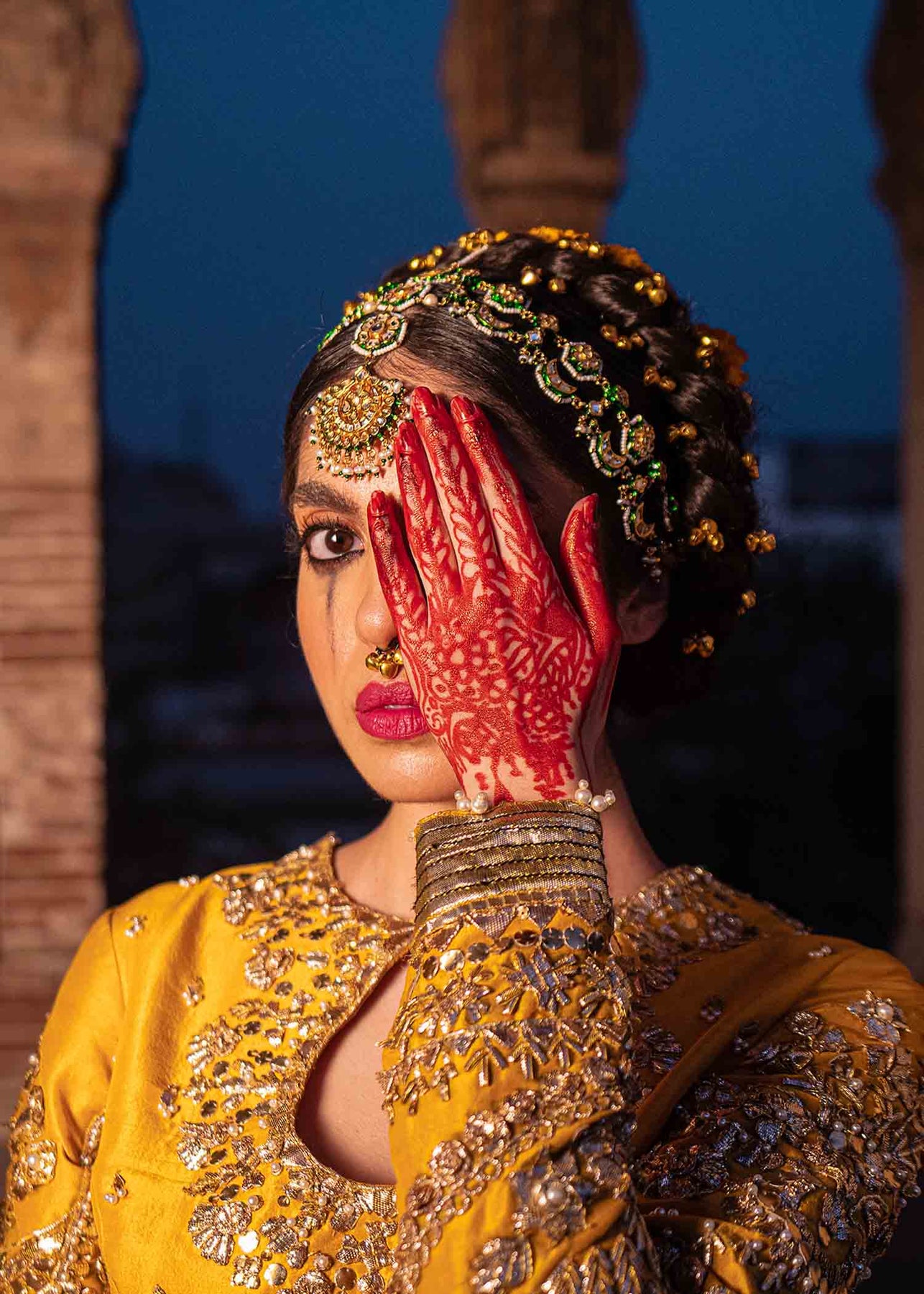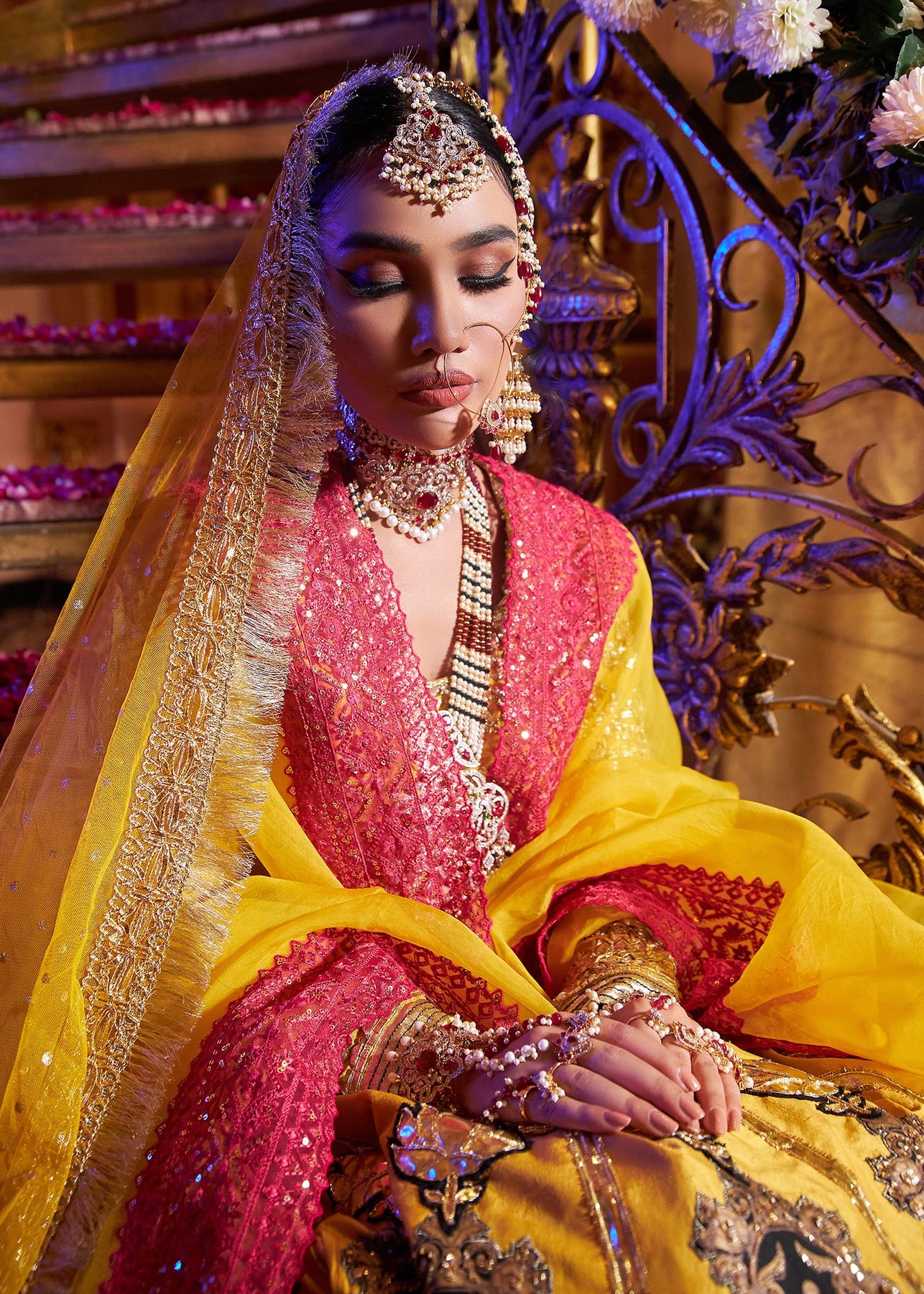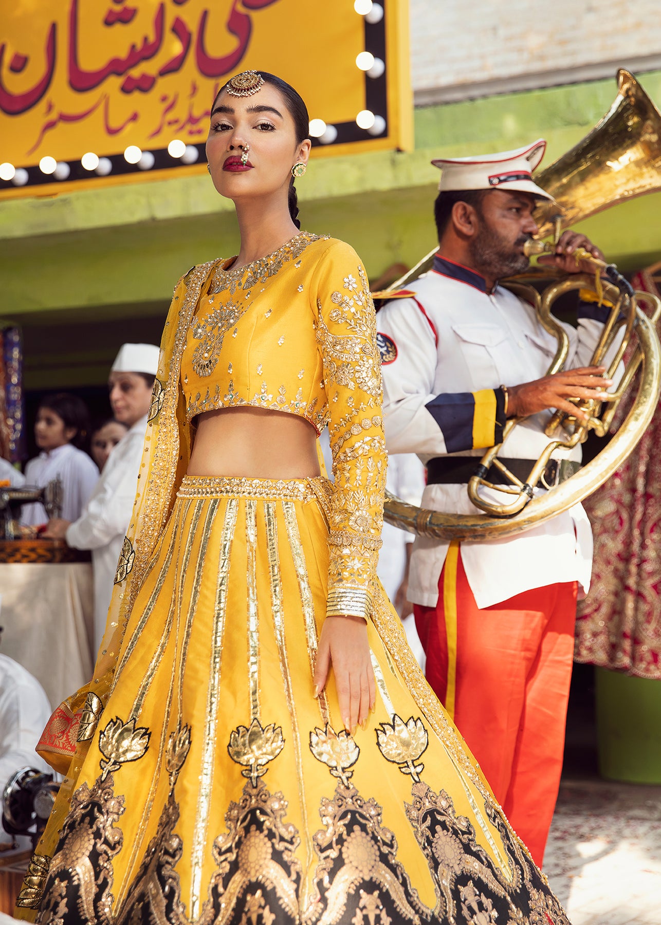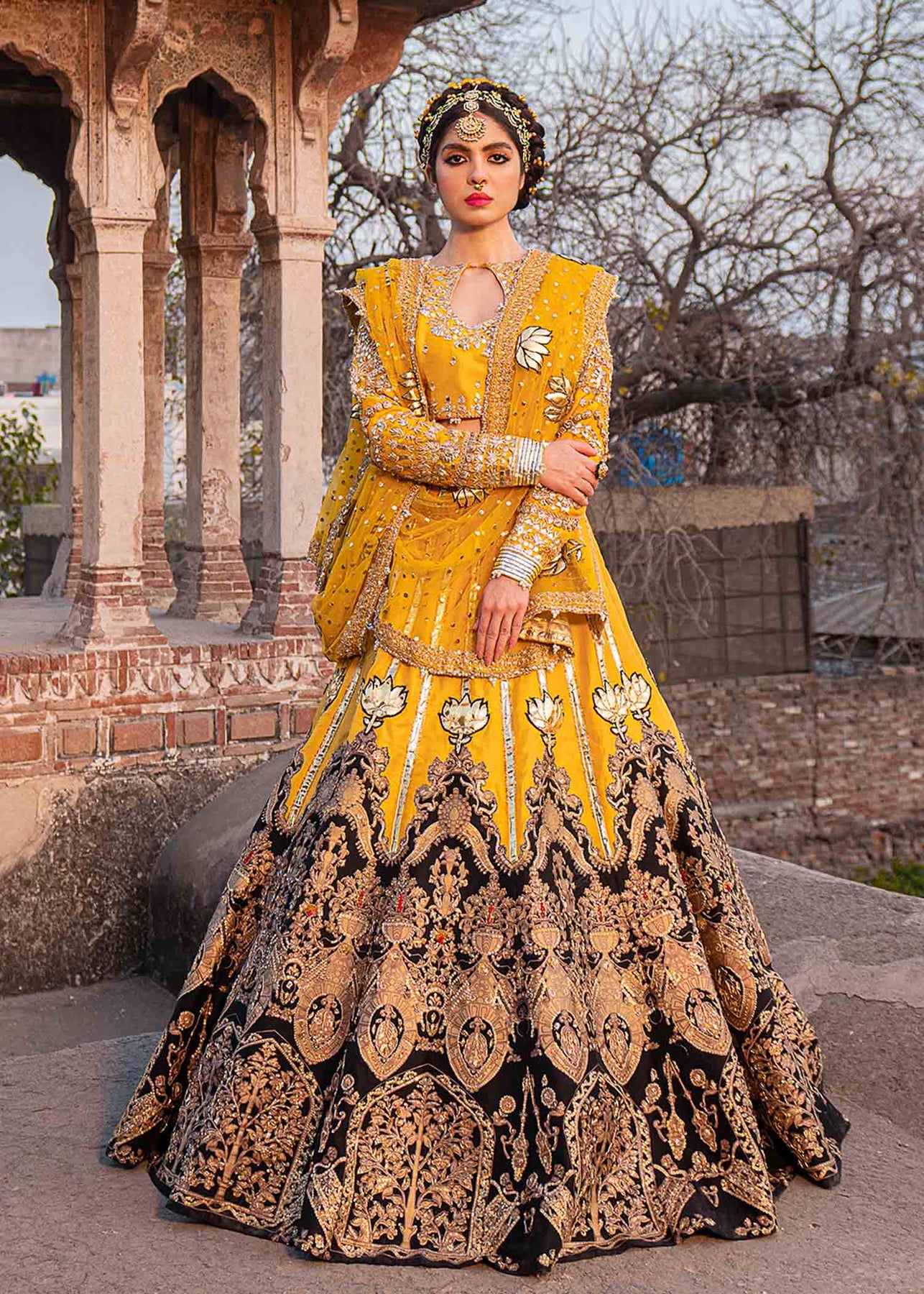 A yellow raw silk lehanga is enhanced with gorgeous gota work and is designed using colour blocking technique in black which is incrusted with red dabka, sitara and naqshi. The leather flowers, gota pati and sitara lines are adding grandeur to the piece. It is paired up with a yellow choli and net mukesh dupatta.