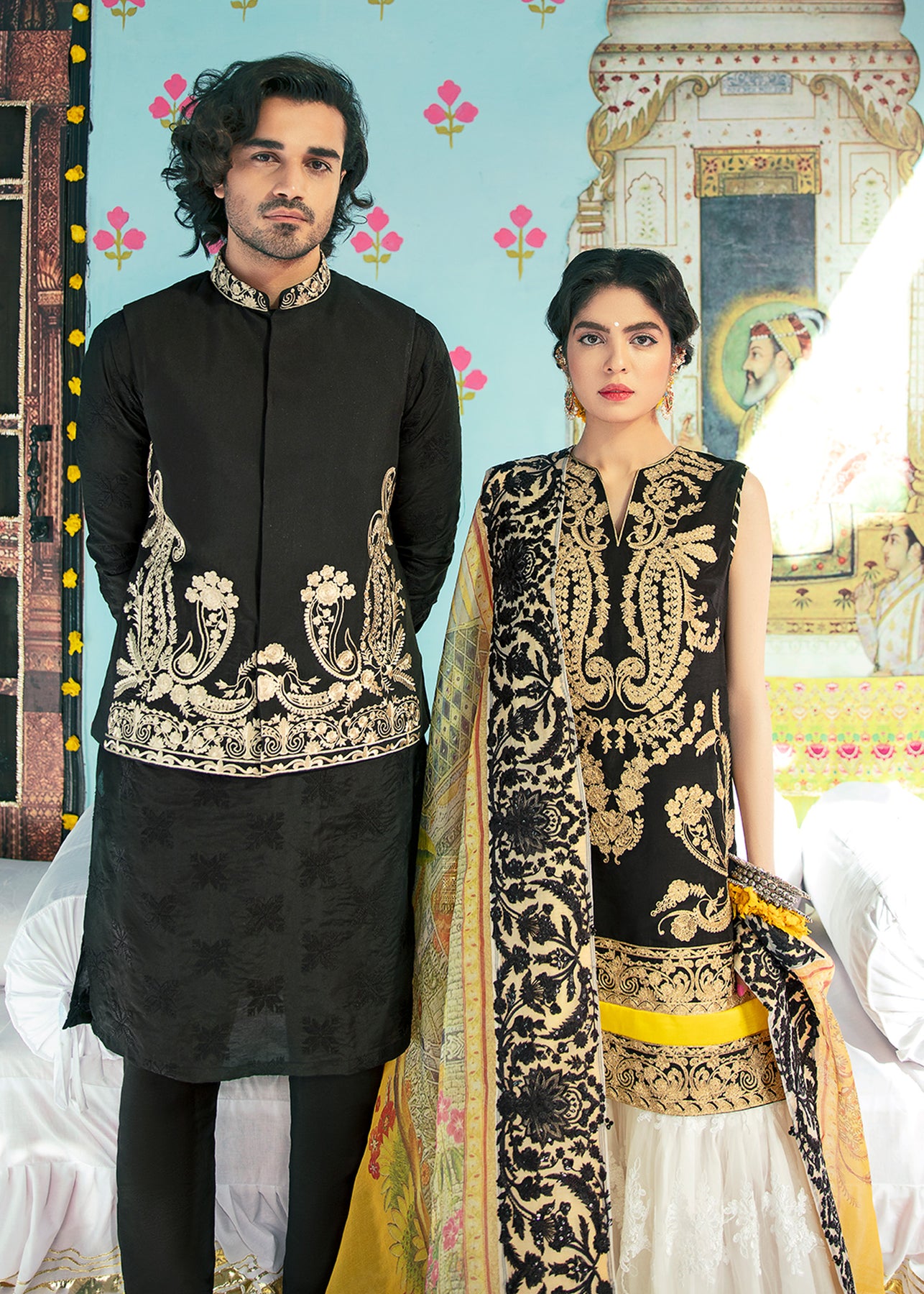 A gorgeous black cotton kurta with geometric embroidery is paired up with straight trousers and a cotton waistcoat with gold aari embroidery and beautiful paisley motifs.