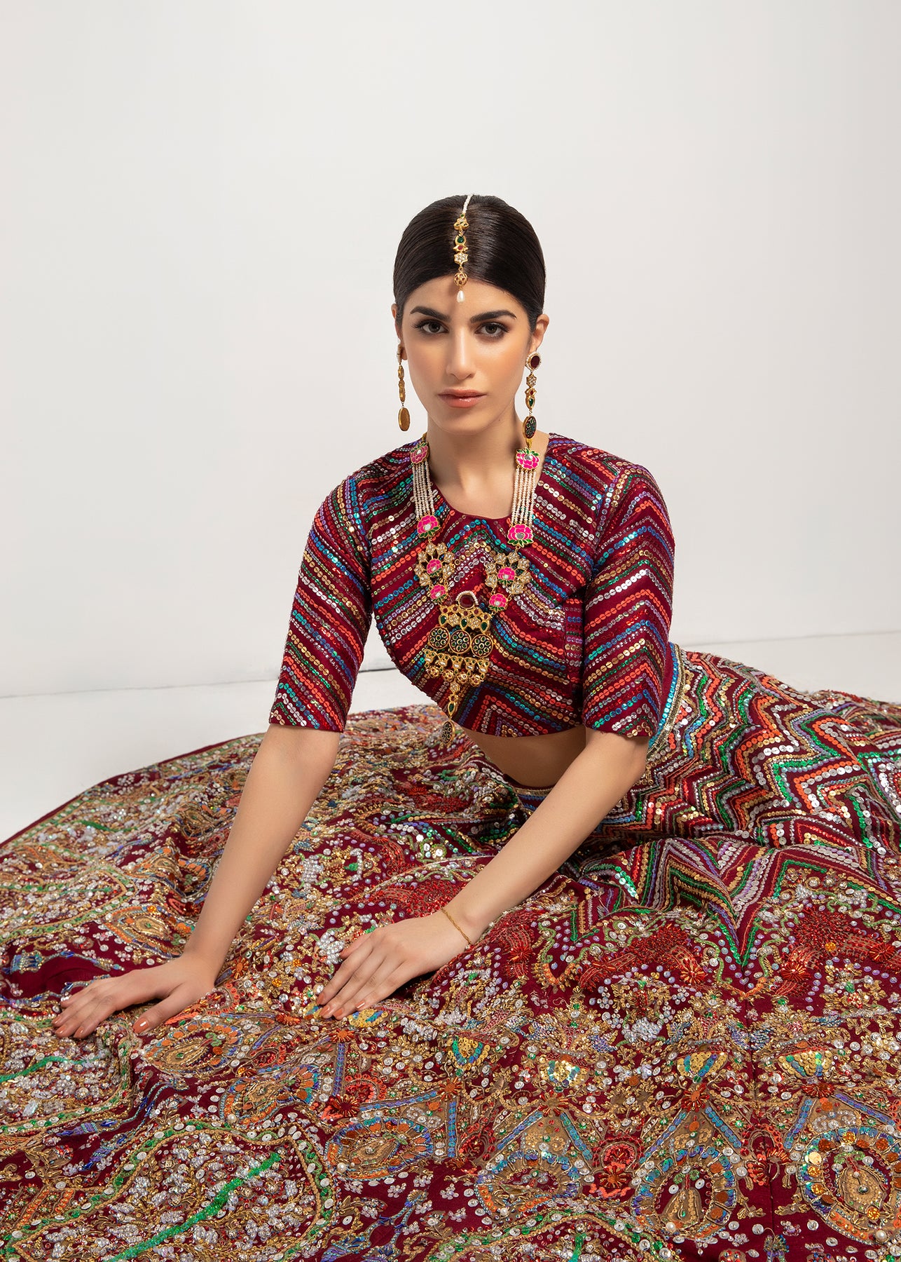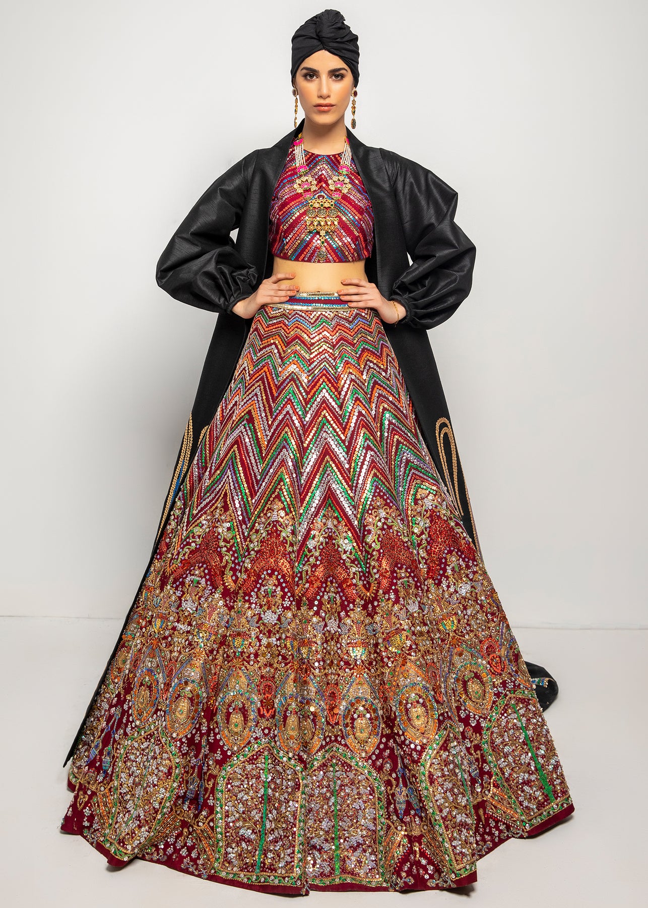 A pure raw silk lehanga choli with plum base has zigzag multicoloured details with differend sizes of sitara. It is paired up with an oversized black jacket with puffy sleeves, enhanced with paisleys motifs.