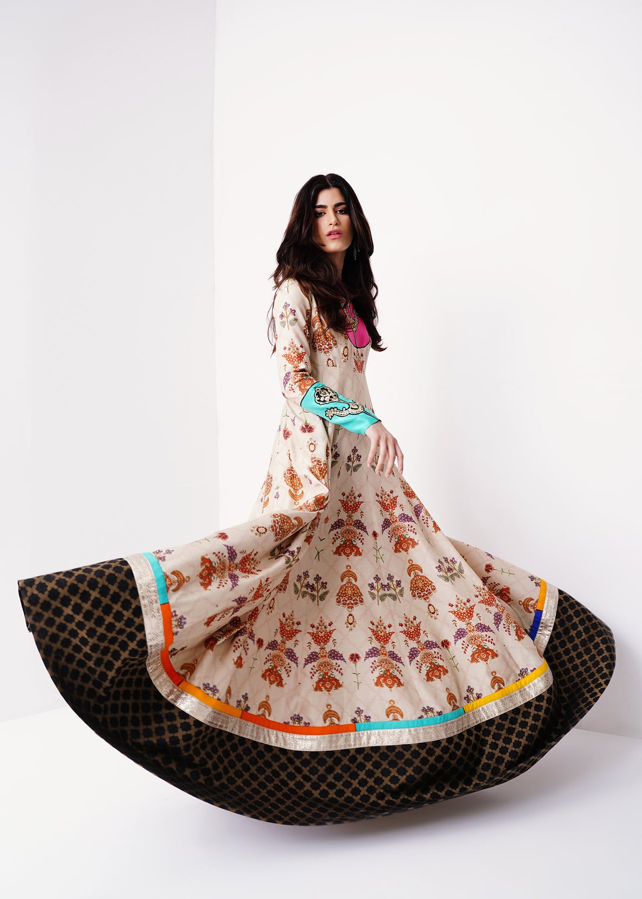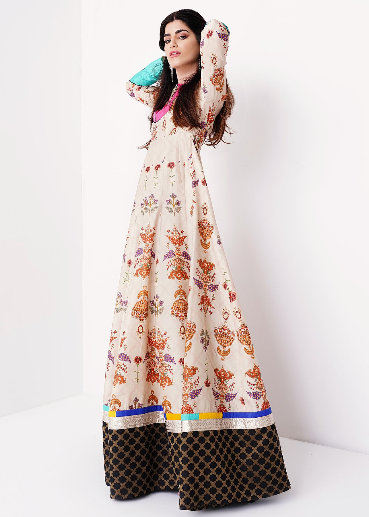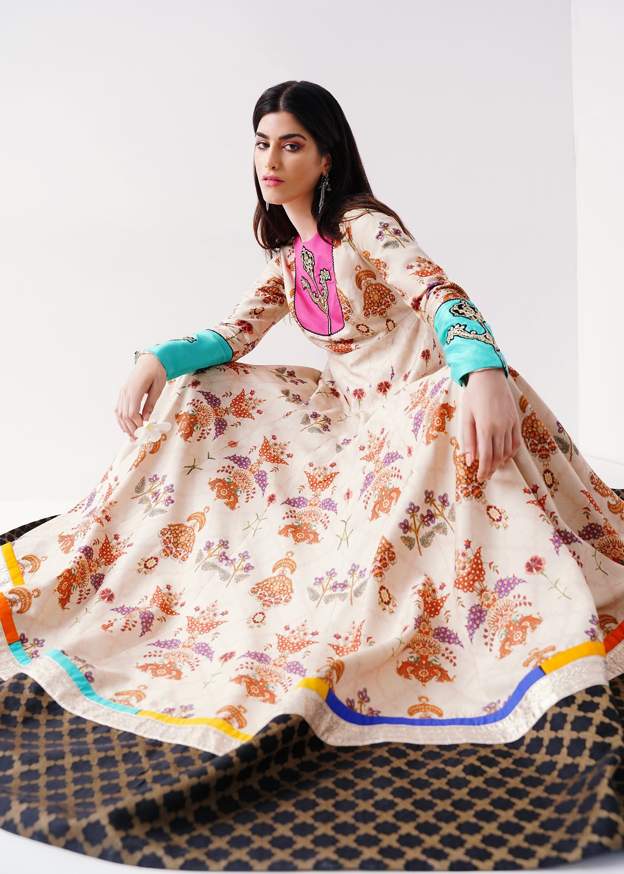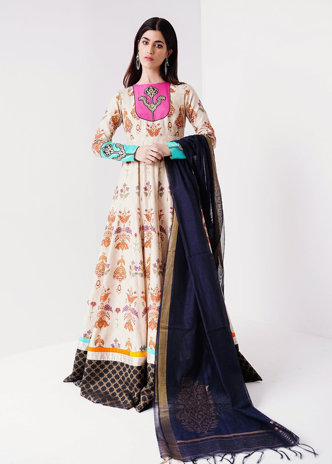 A beautiful long traditional frock decorarted with tilla work on a printed silk fabric with jacquard border. Further paired with a blackhand woven duppatta.