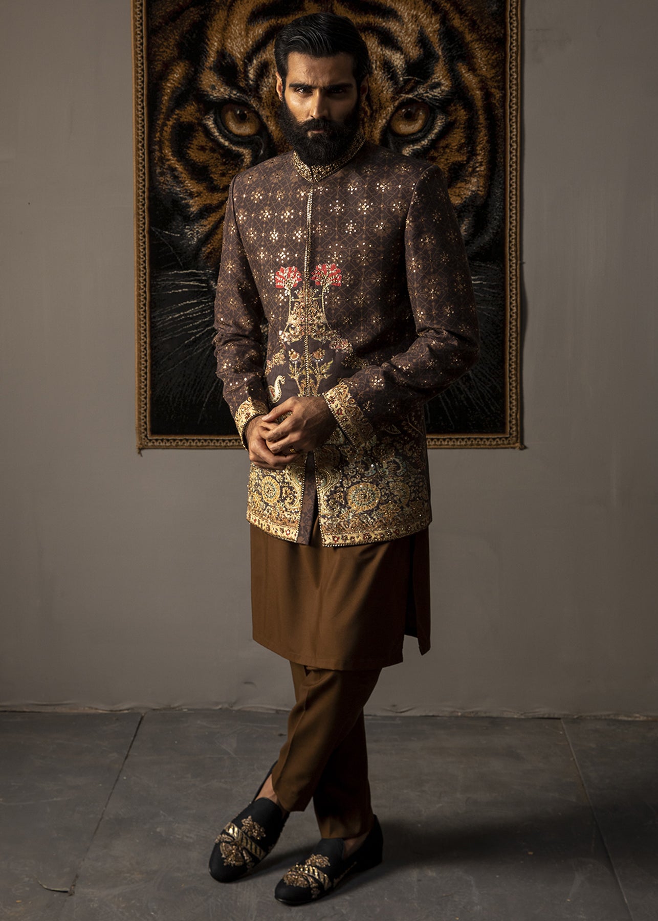 This short sherwani has a  walnut brown cotton base which is hand-printed with love and enhanced with florals and peacock motifs. While the ban is meticulously designed using sequins and zardozi work. It is paired up with a rich chocolate brown inner suit.