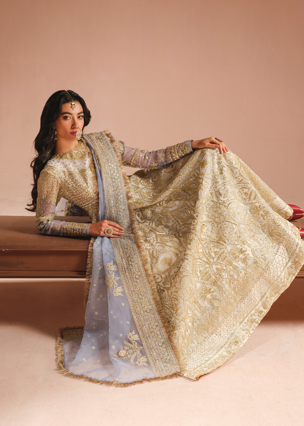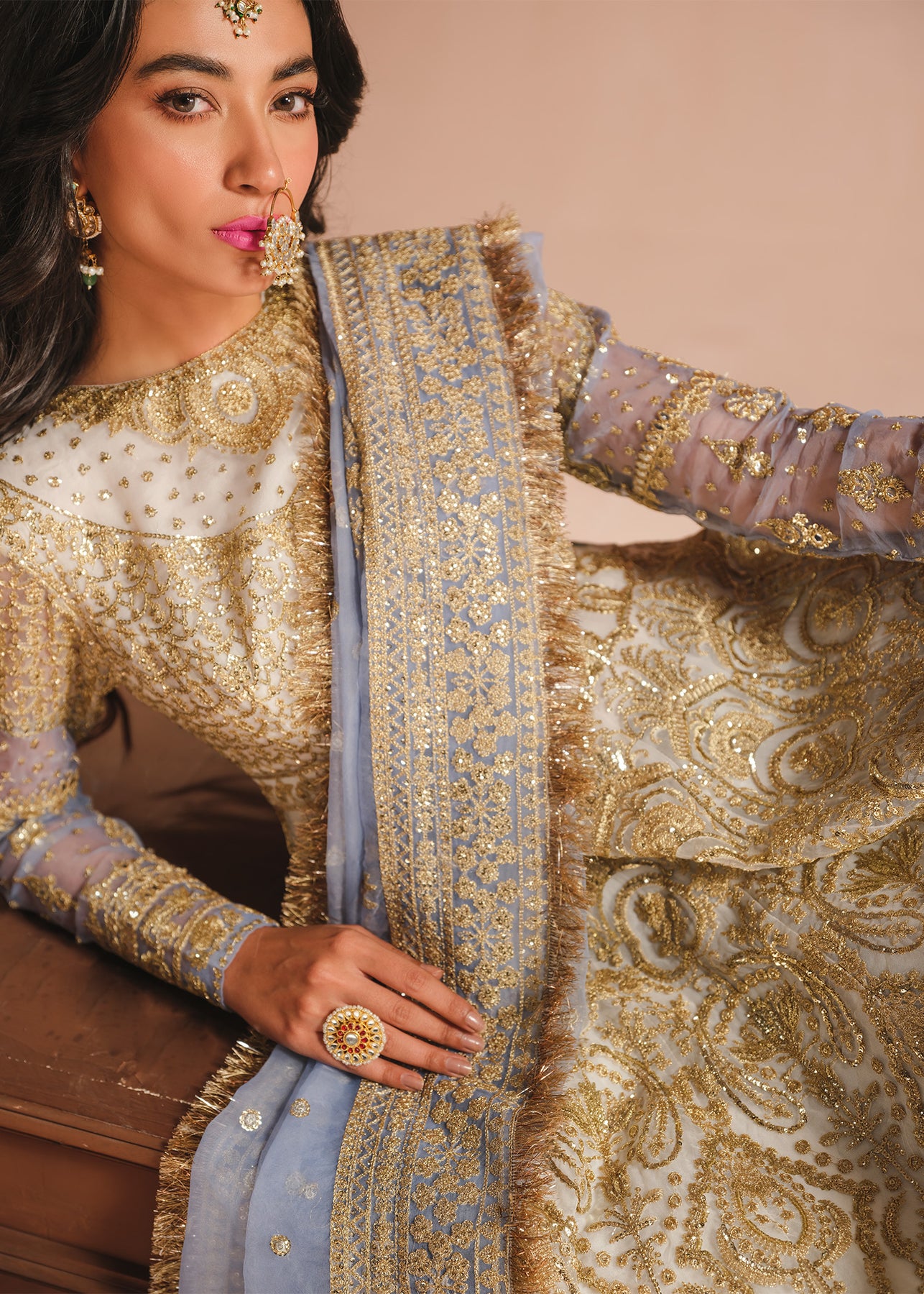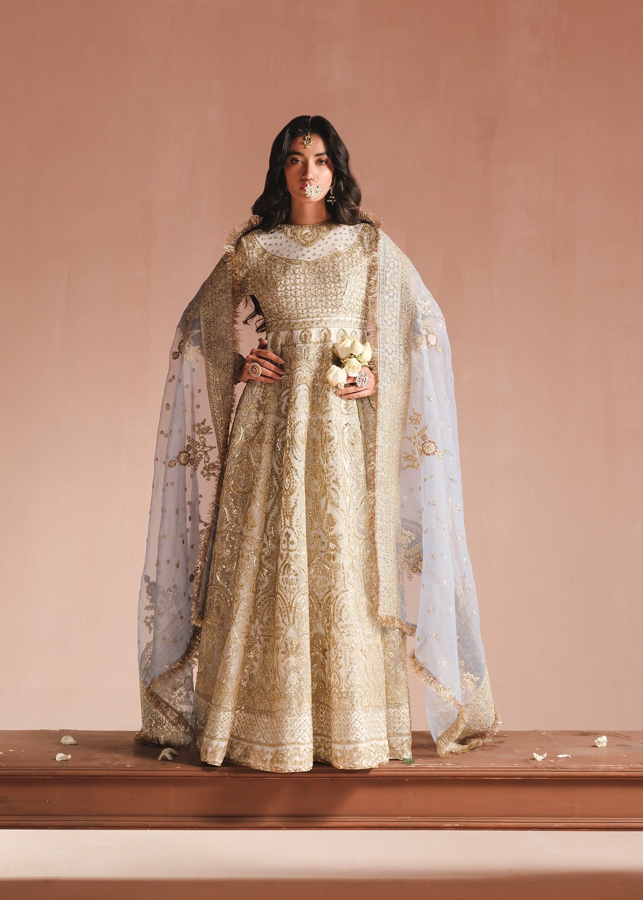 A gorgeous ivory pishwas is adorned with opulent gold embroidery, intricate tilla, and dazzling sequins. The jewel neckline and ice blue sleeves adds a touch of regal charm. Complementing the ensemble is a trouser and a stunning ice blue organza dupatta featuring a beautifully embroidered border.