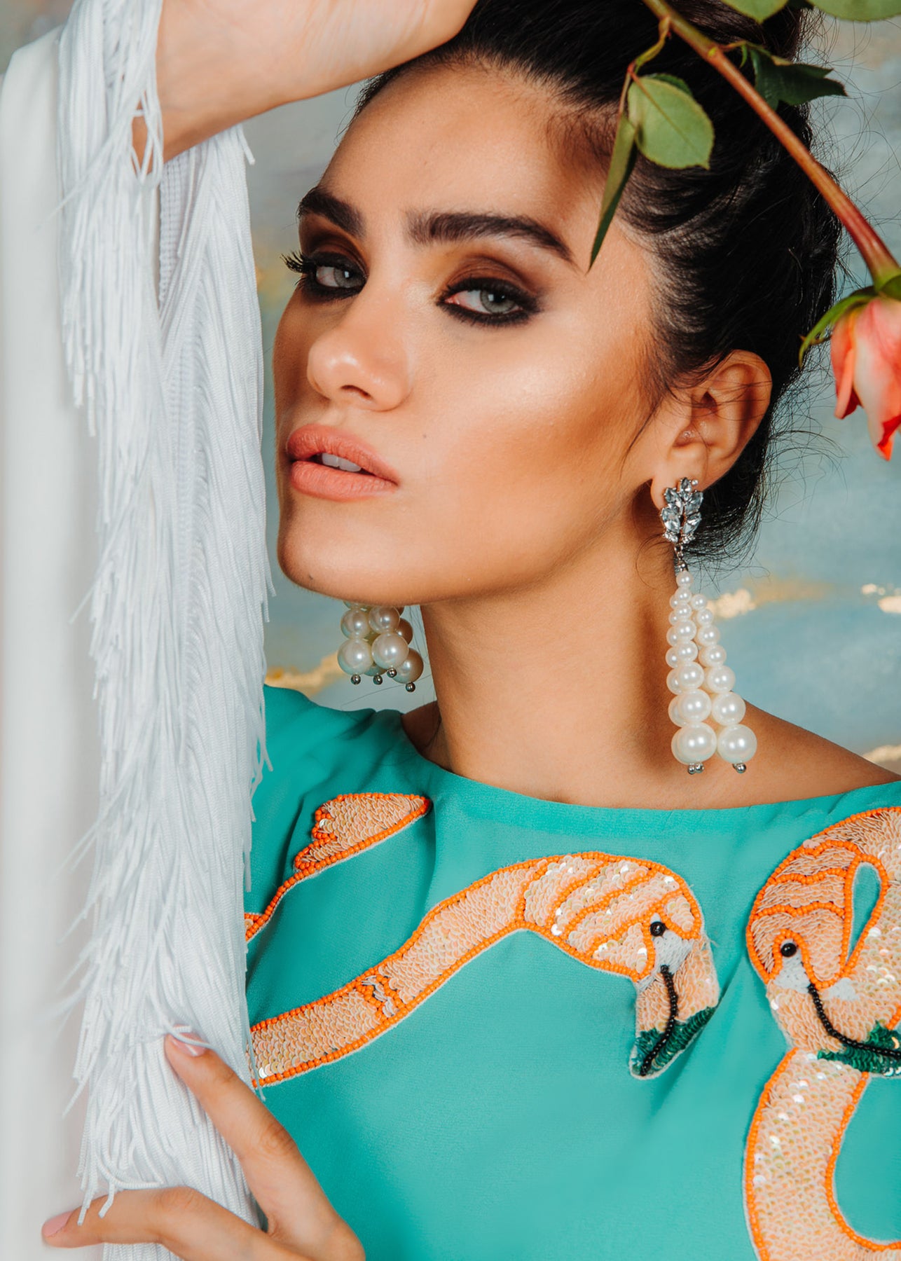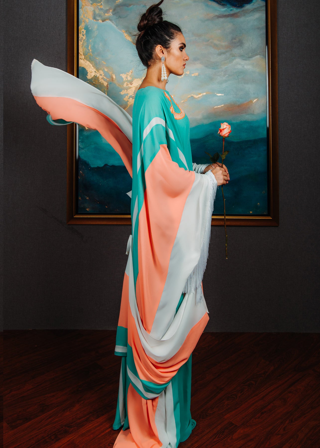 Summer pastel palette kaftan with flamingos embellished with beads and sequins with fringes as trimmings.