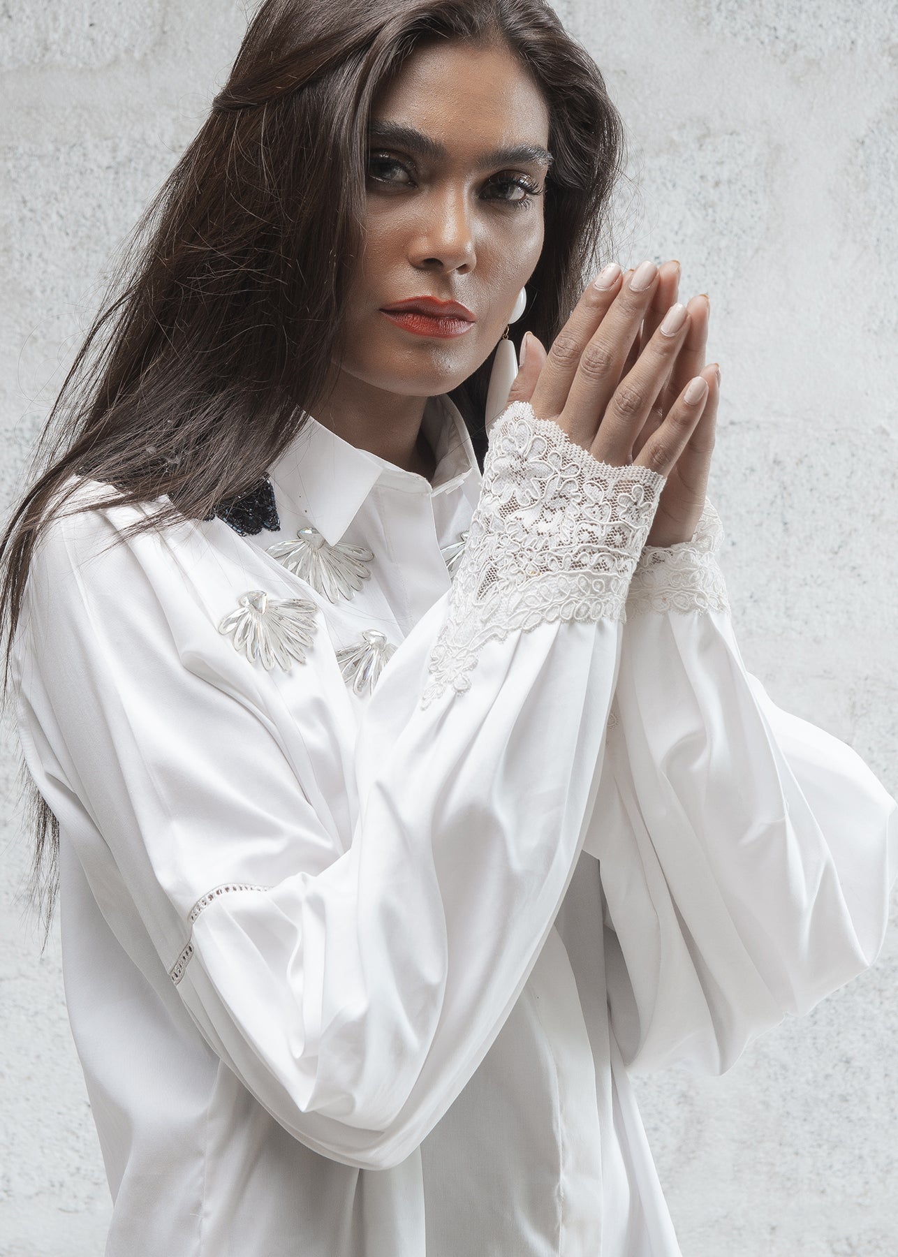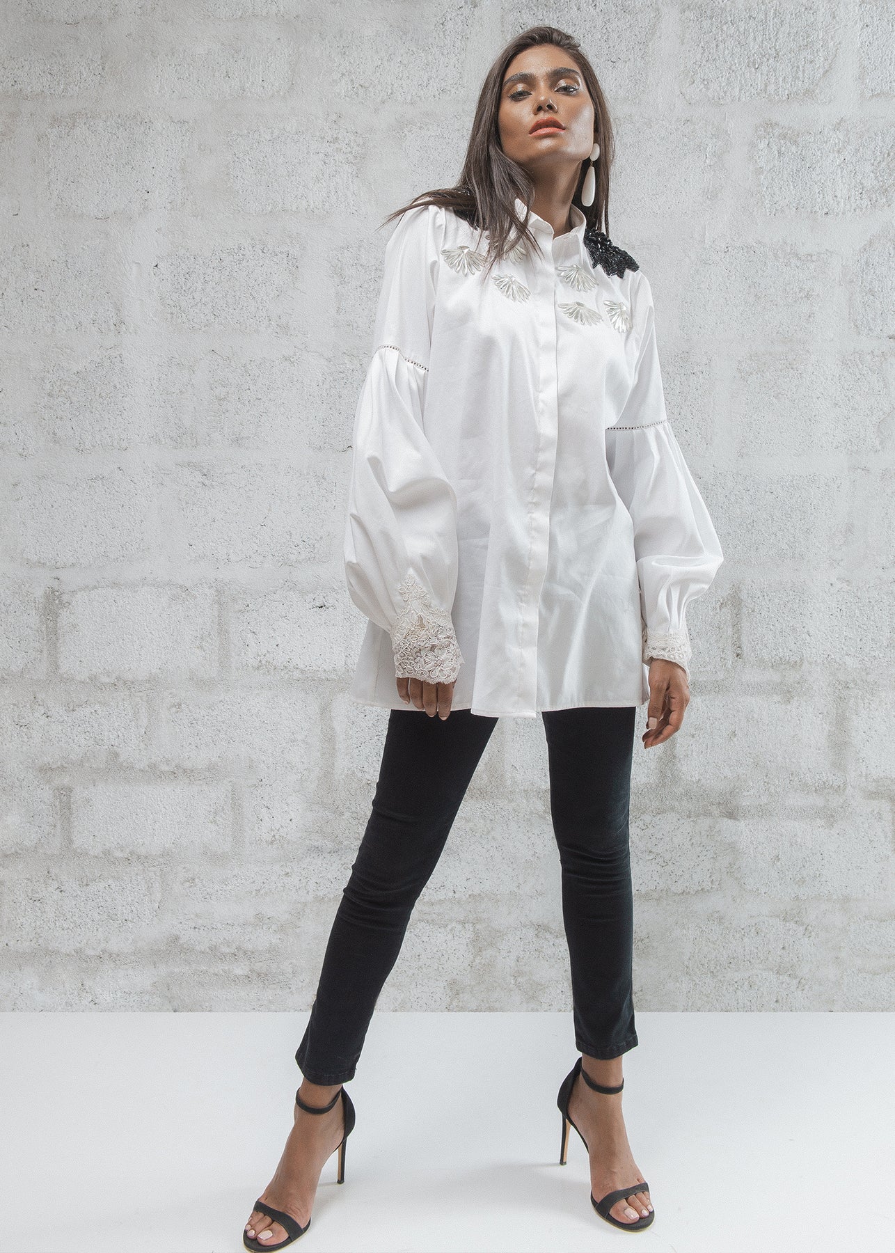 White cotton Button down with french lace trimmings. Black sequins work and studs.