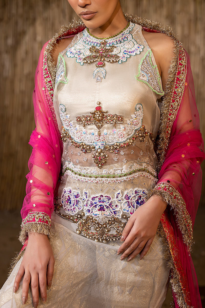 This white organza shirt is embroidered in contrasting colours with hand embellishment of adda work, and comes with Korean raw silk palazzos and strapless inner.