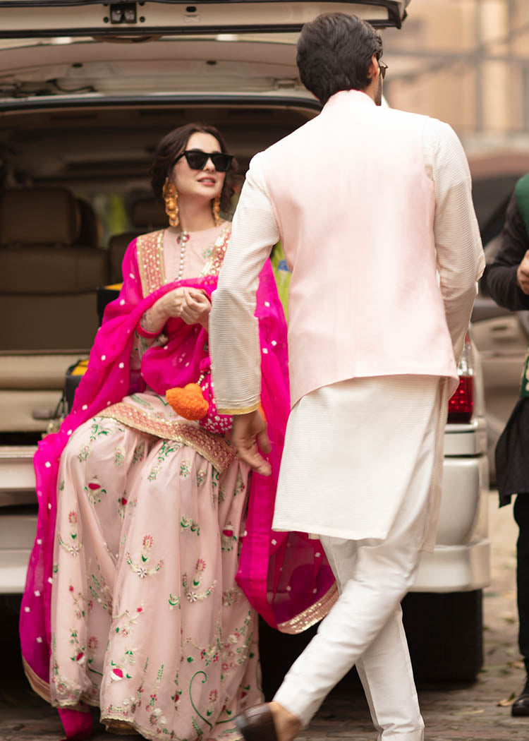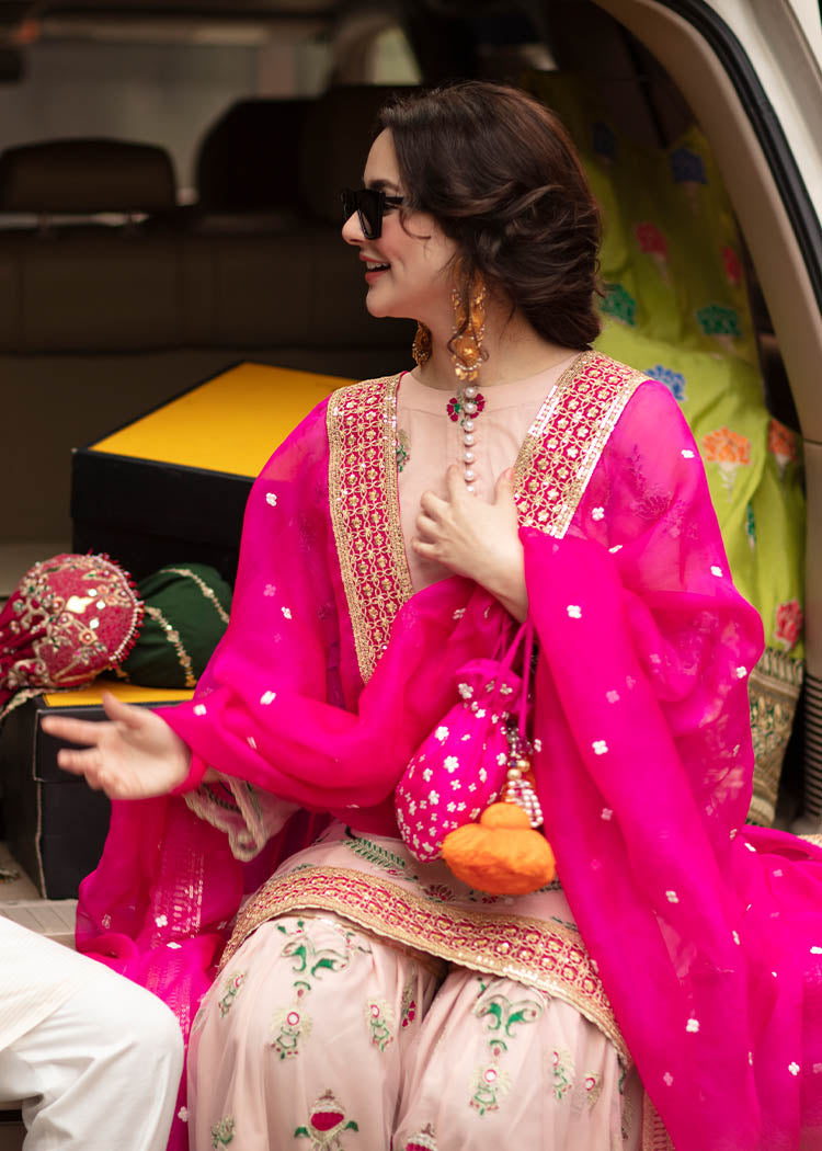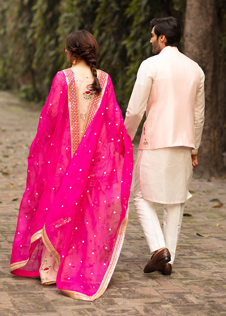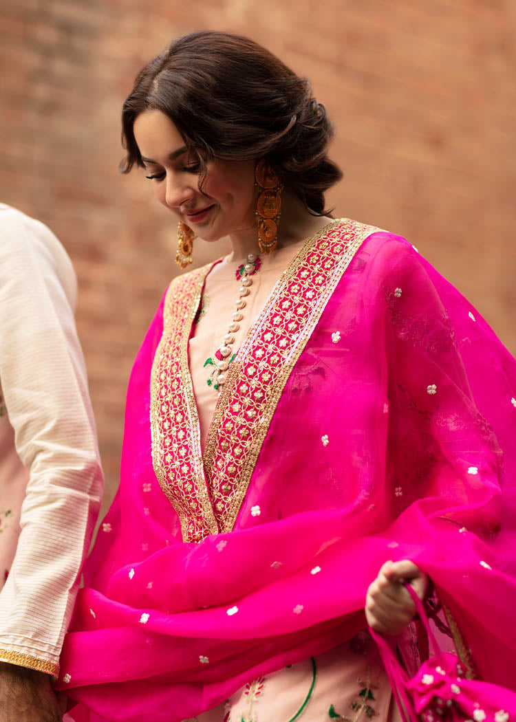 Description: A gorgeous powder pink net serves as a canvas to floral embroidery in pink and green. The shirt has button detail on the neckline and borders. It is paired up with a matching gharara and shocking pink organza dupata with white flower and embroidered borders.