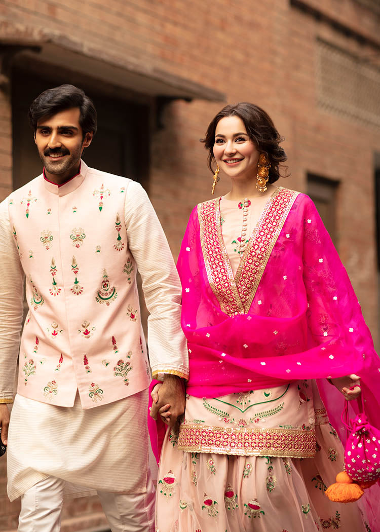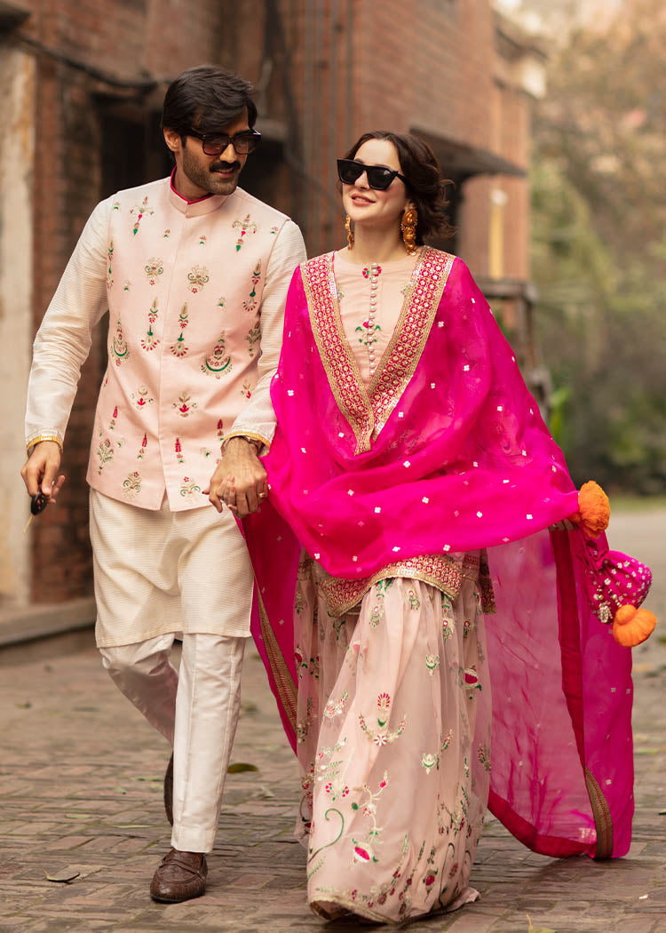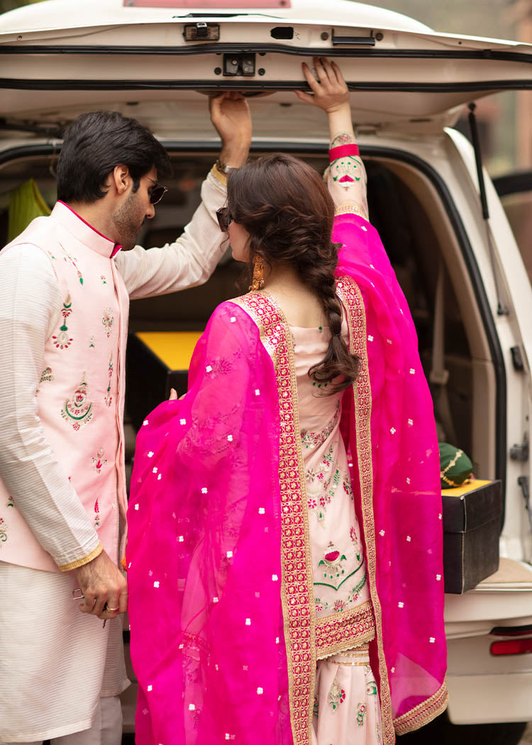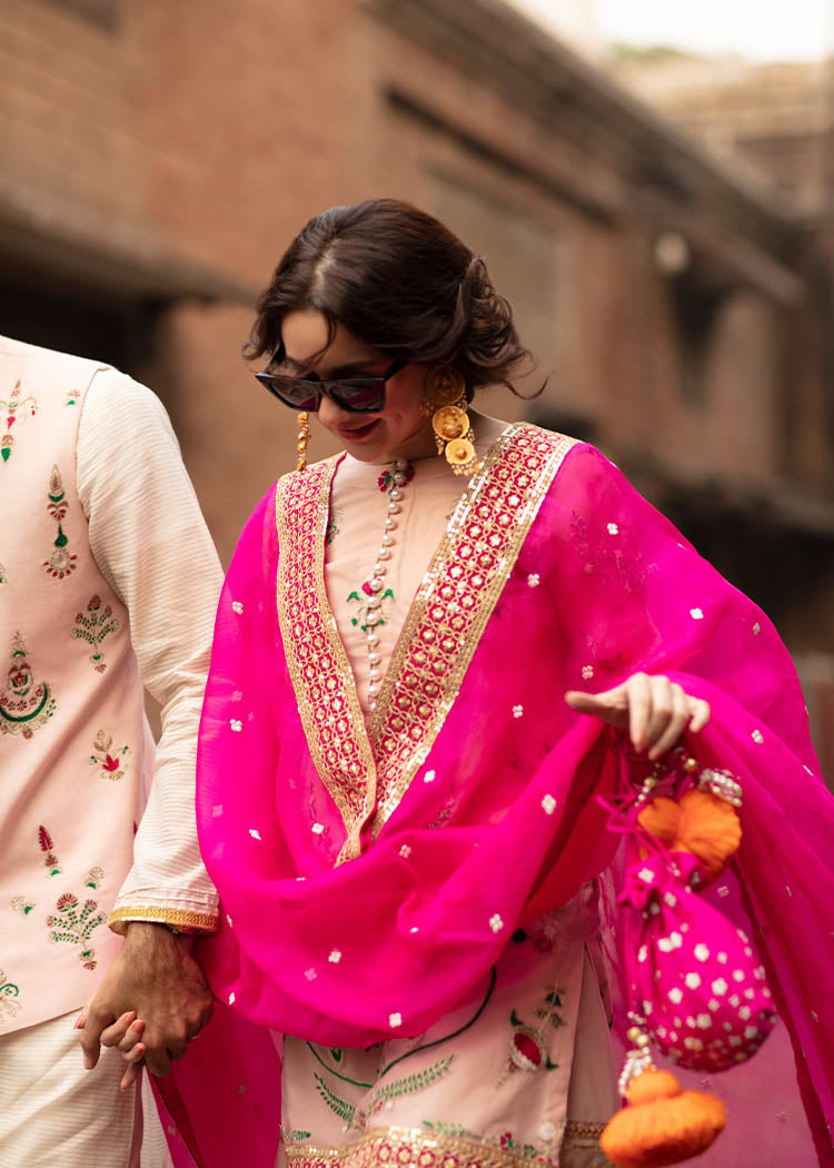 Description: A gorgeous powder pink net serves as a canvas to floral embroidery in pink and green. The shirt has button detail on the neckline and borders. It is paired up with a matching gharara and shocking pink organza dupata with white flower and embroidered borders.