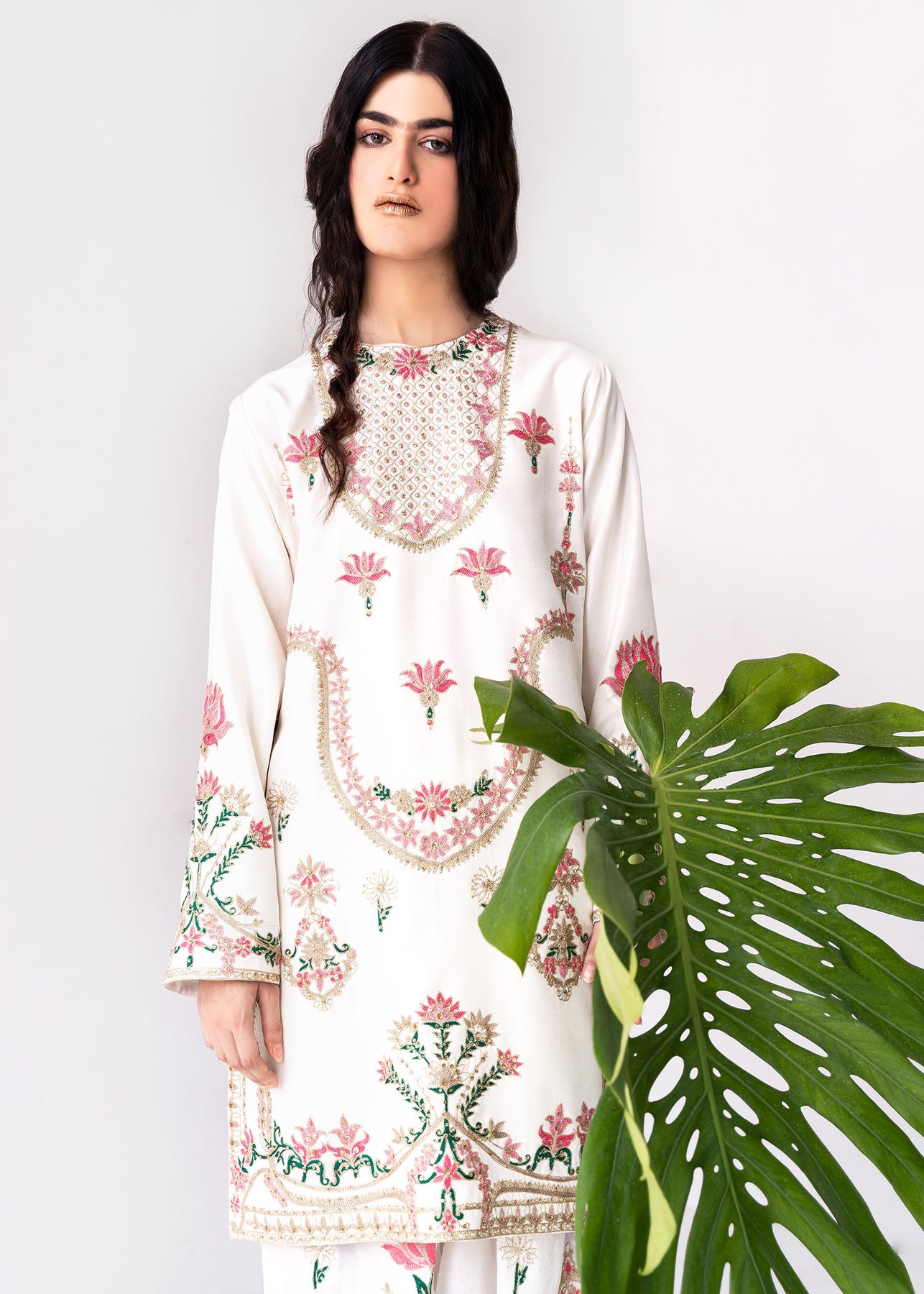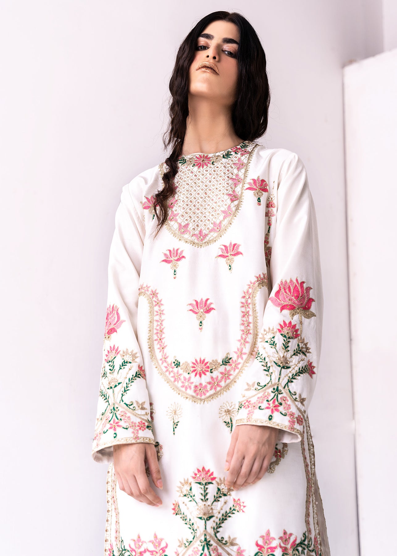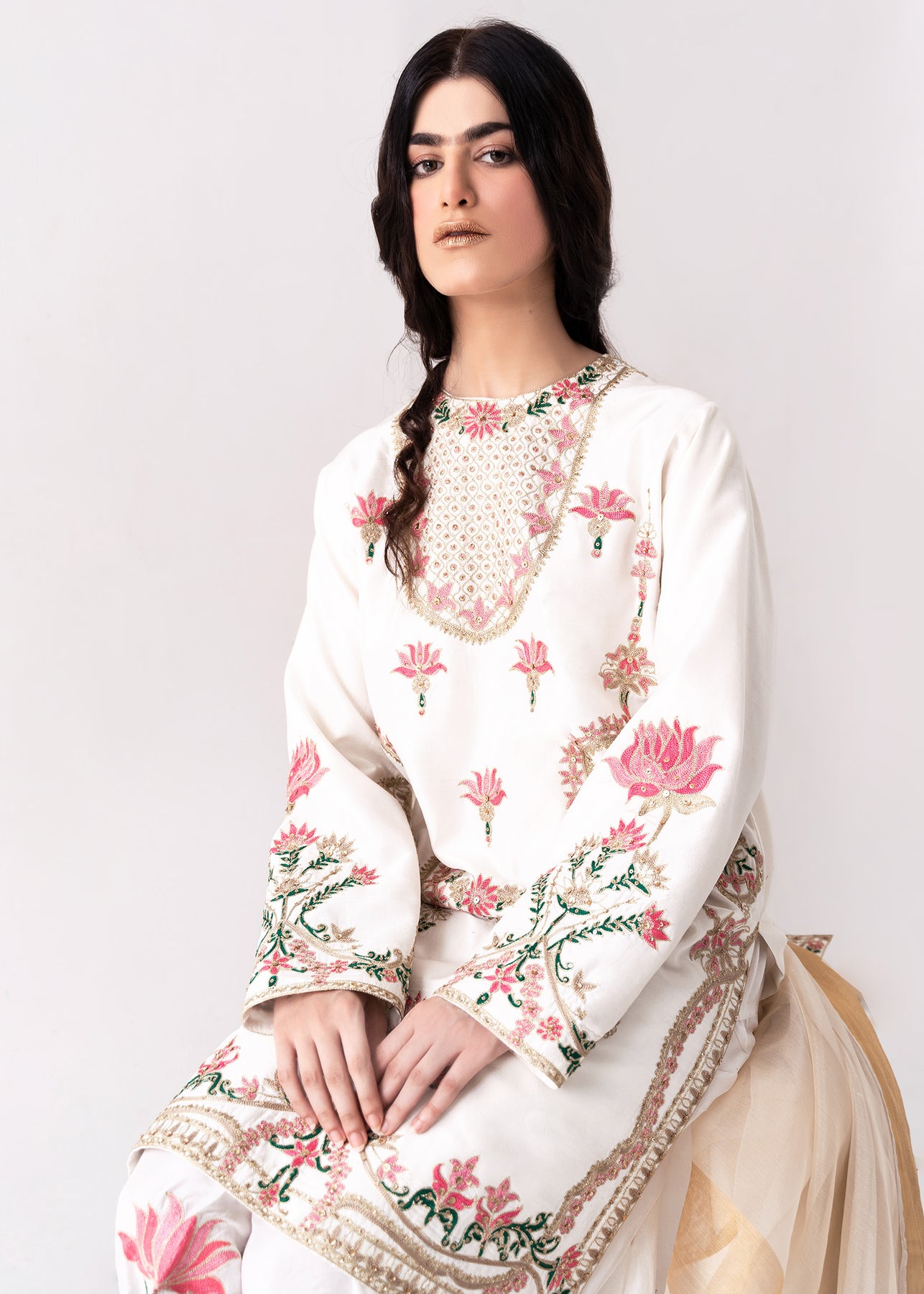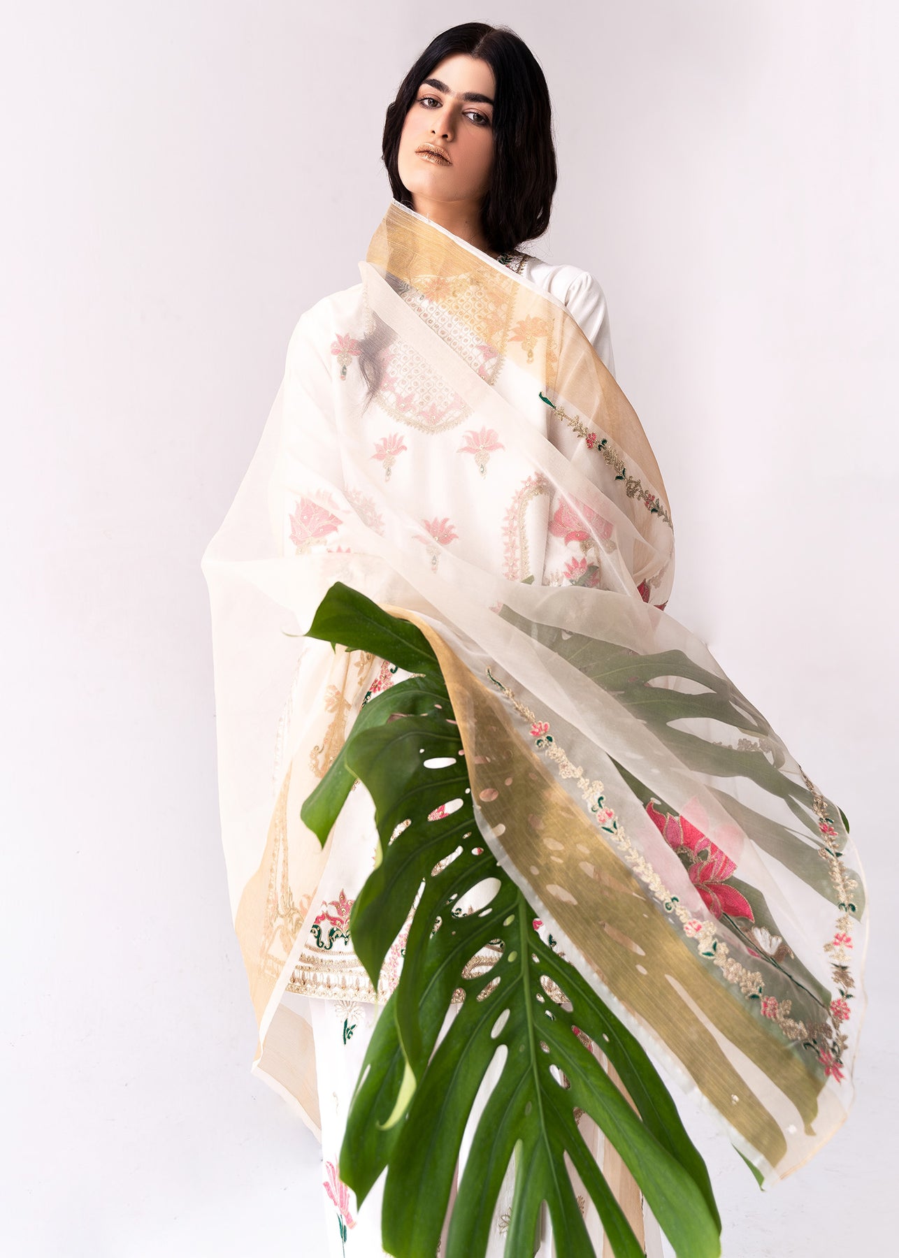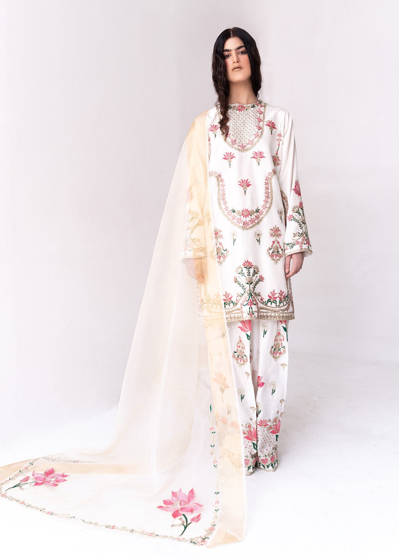 Ivory white cotton silk floral embroidered shirt paired with our signature traditional aari work shalwaar. The exquisite piece is complimented with a pure organza dupatta with floral embroidery.