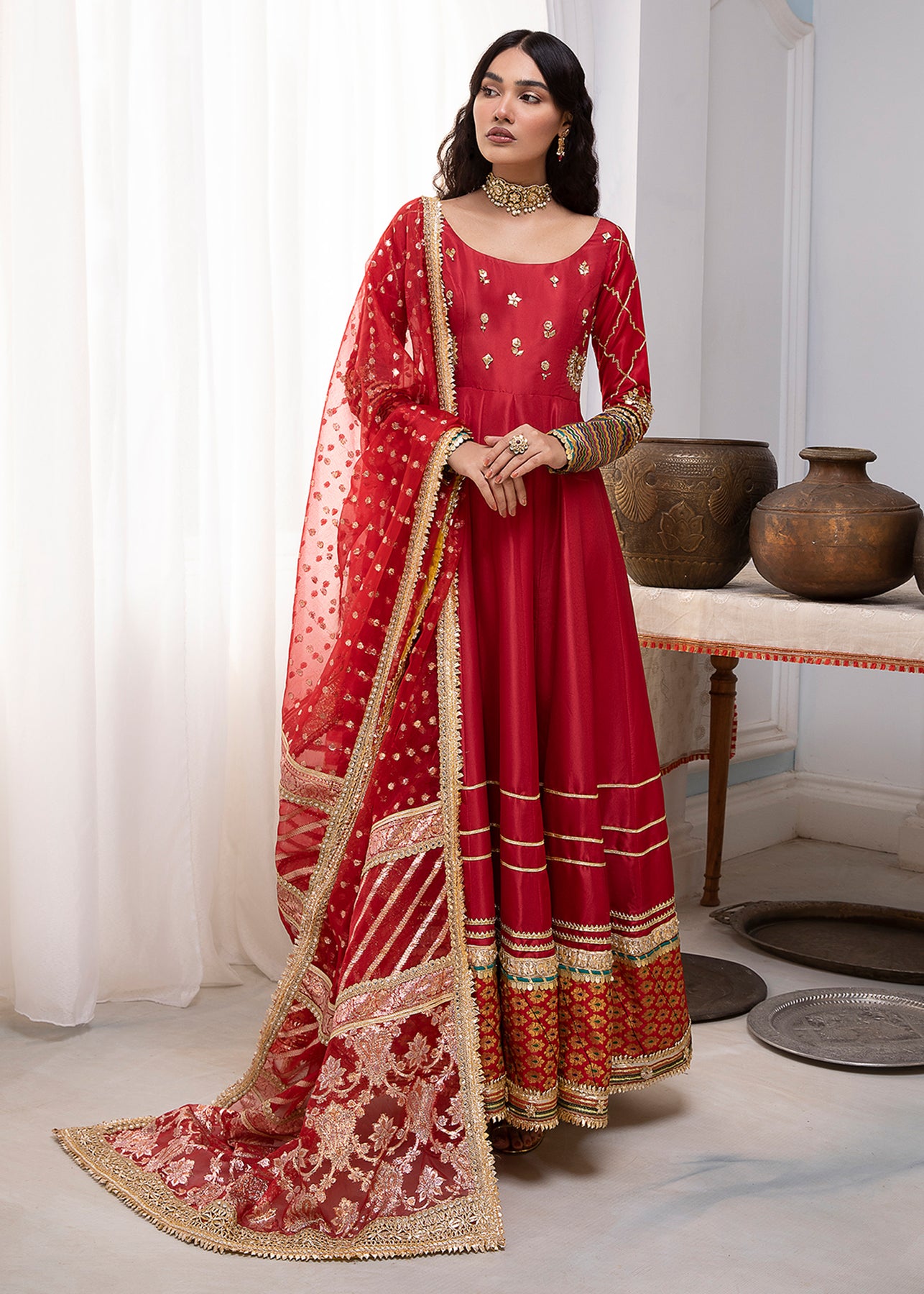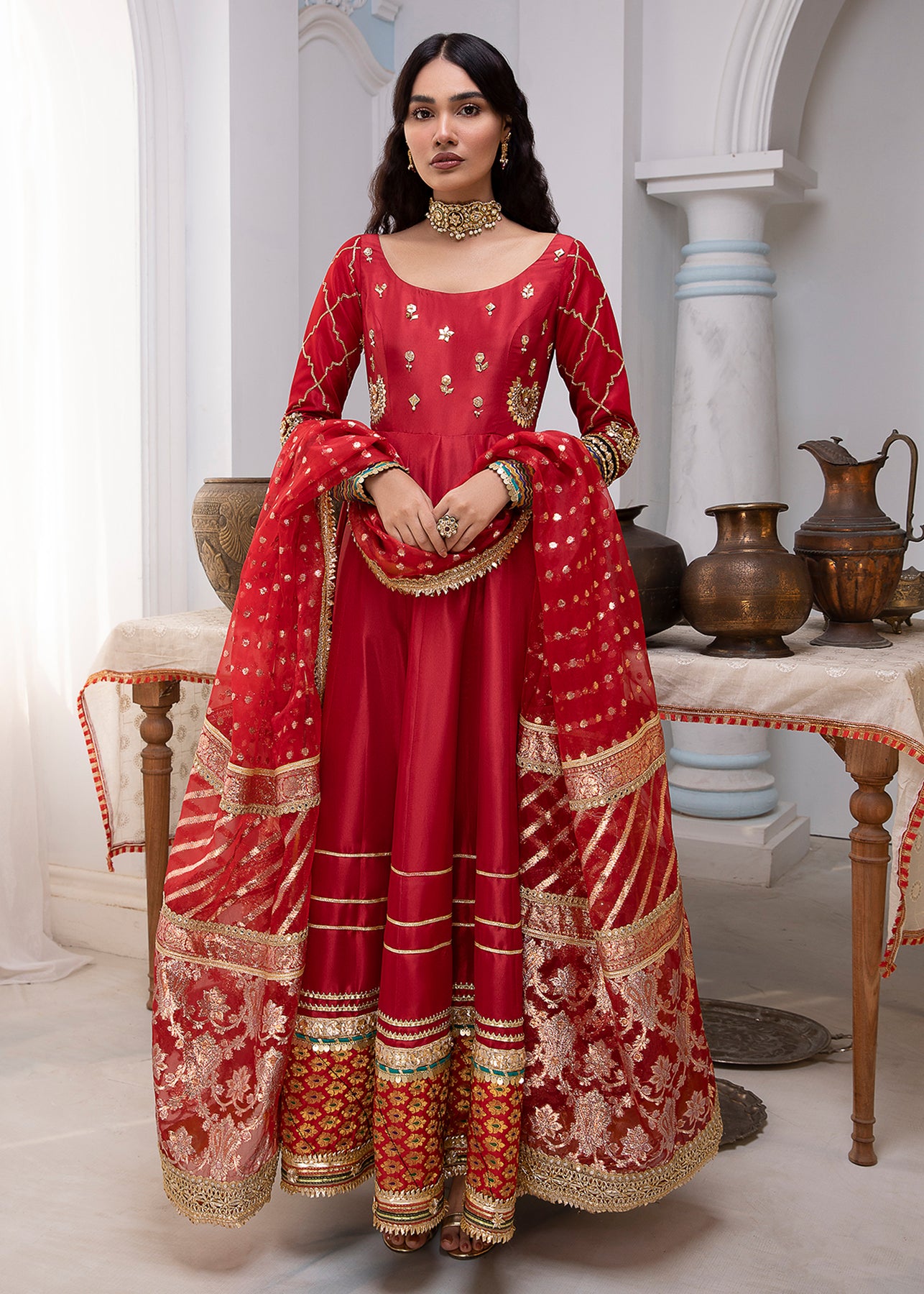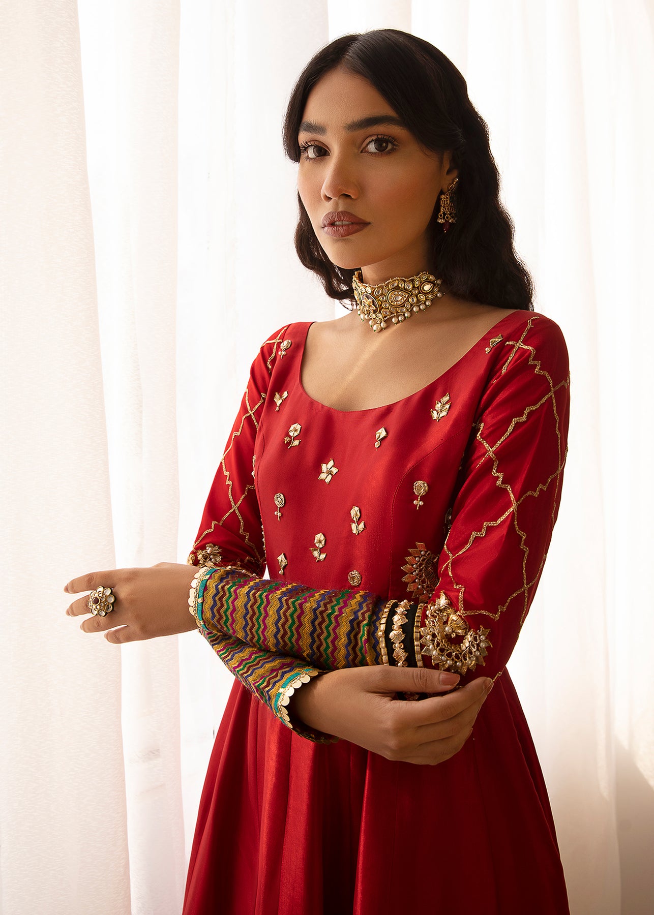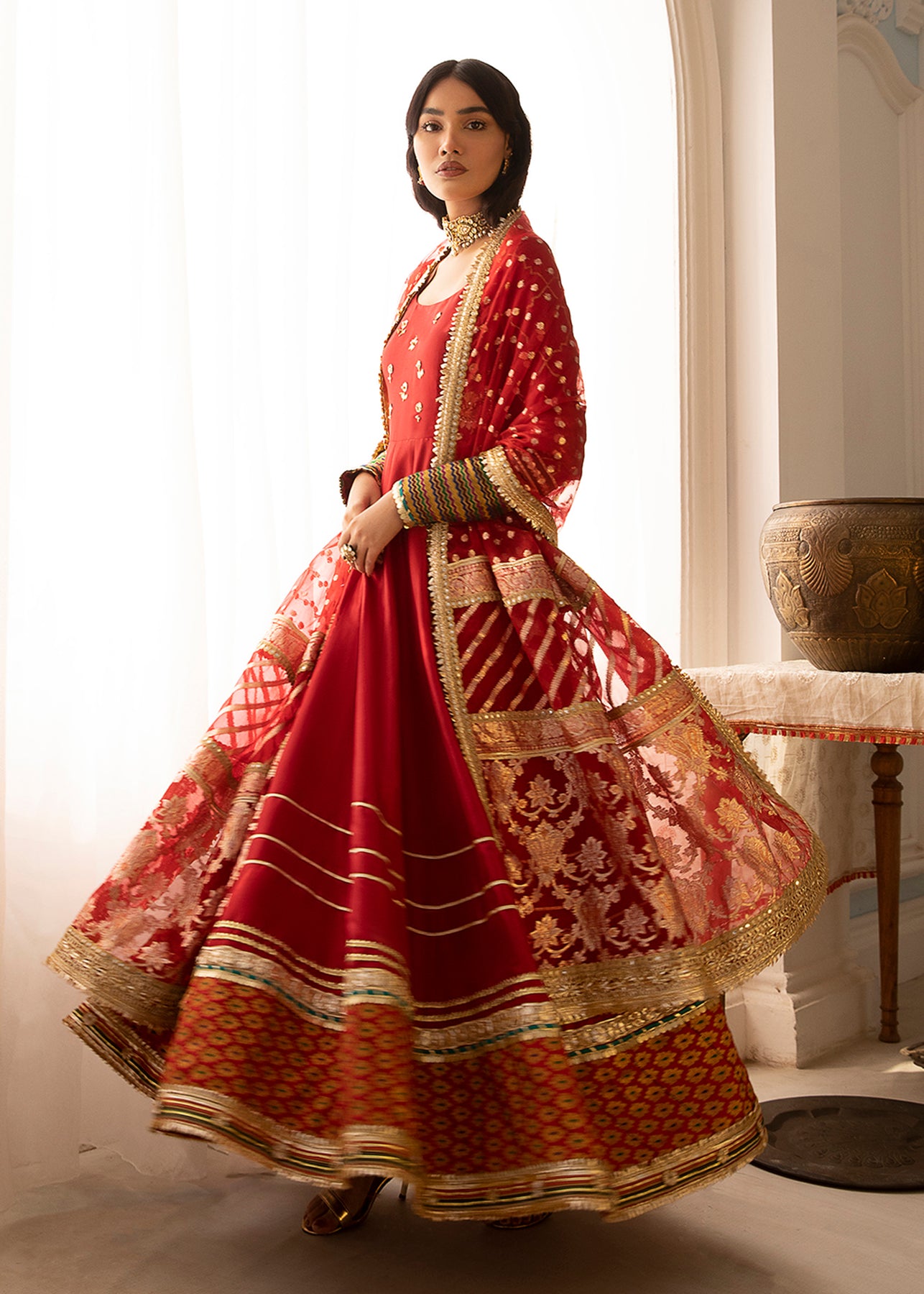 A crimson red silk pishwas is meticulously designed with gota motifs on the bodice while the border is framed with the magic of chatta pati. This stunning piece is paired up with choridars and a zari organza dupatta.