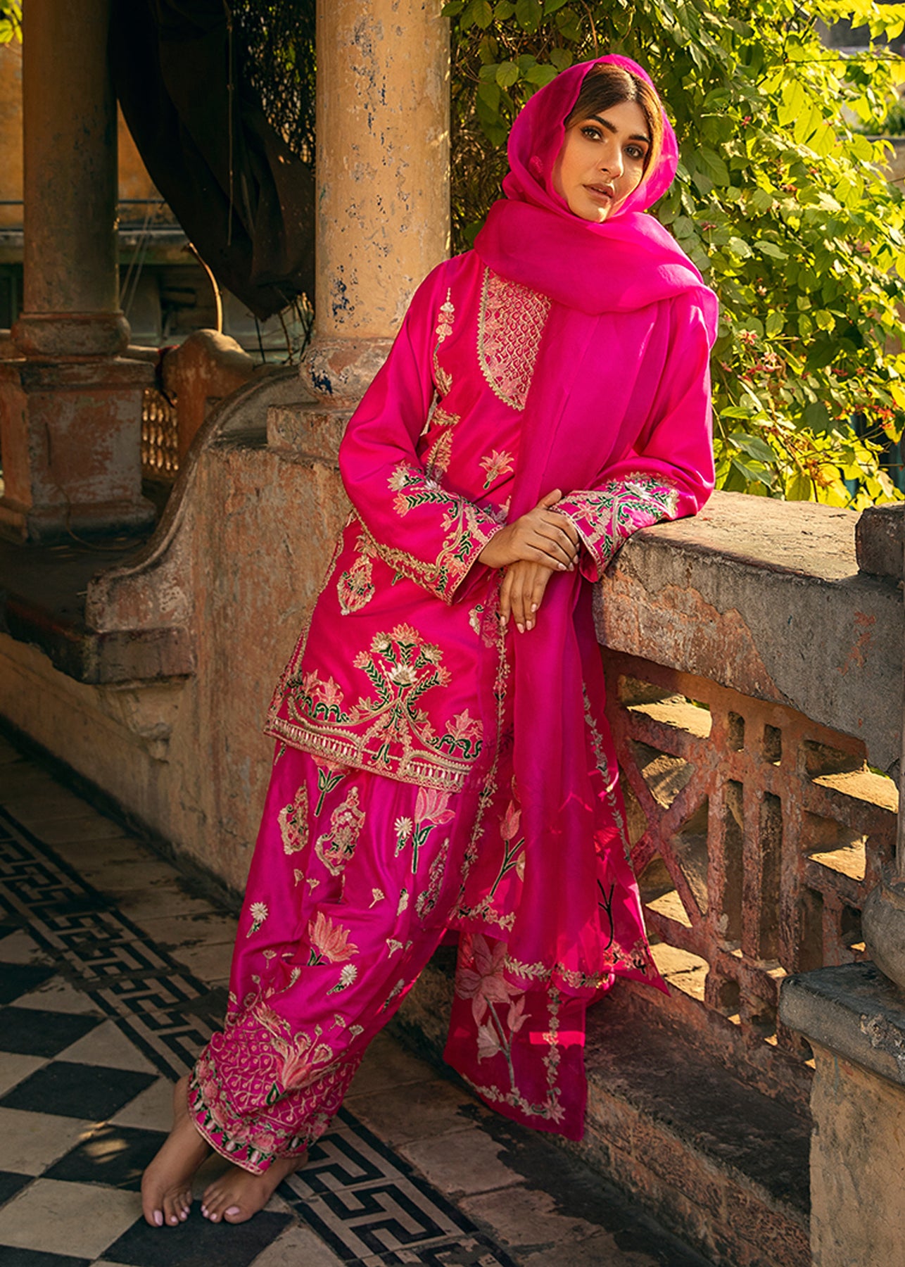 Hot Pink cotton silk floral embroidered shirt paired with our signature traditional aari work shalwaar. The exquisite piece is complimented with a pure organza dupatta with floral embroidery.
