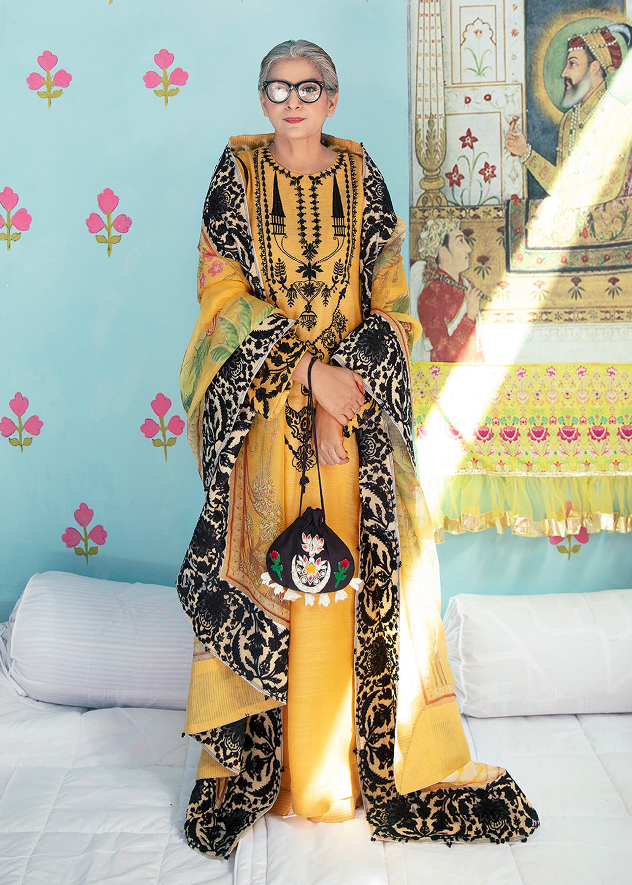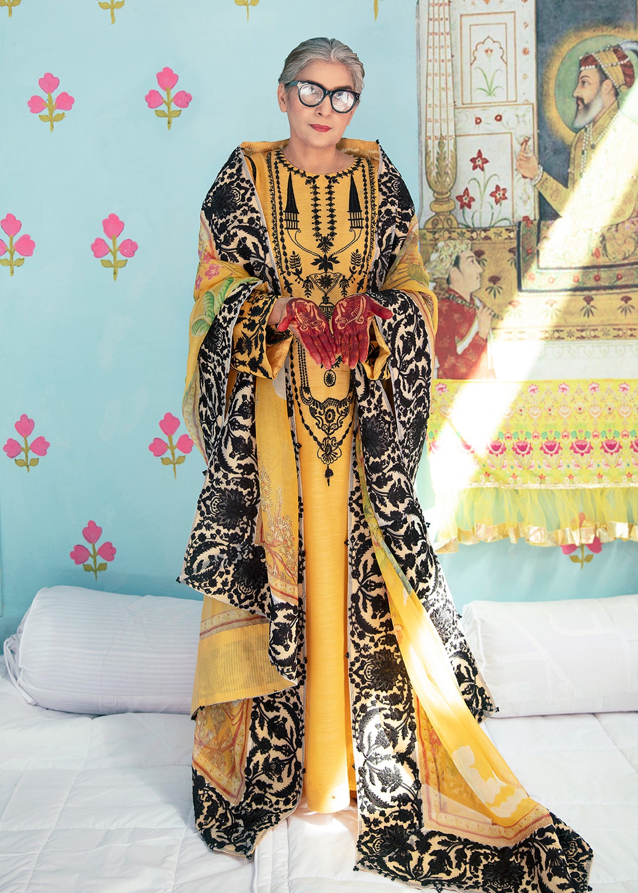 A rich cotton net base in spellbinding mustard hues serves as a canvas to gorgeous black embroidery. The midcalf length shirt has a loose silhouette and is paired up with a trouser and hand-rendered organza dupatta.