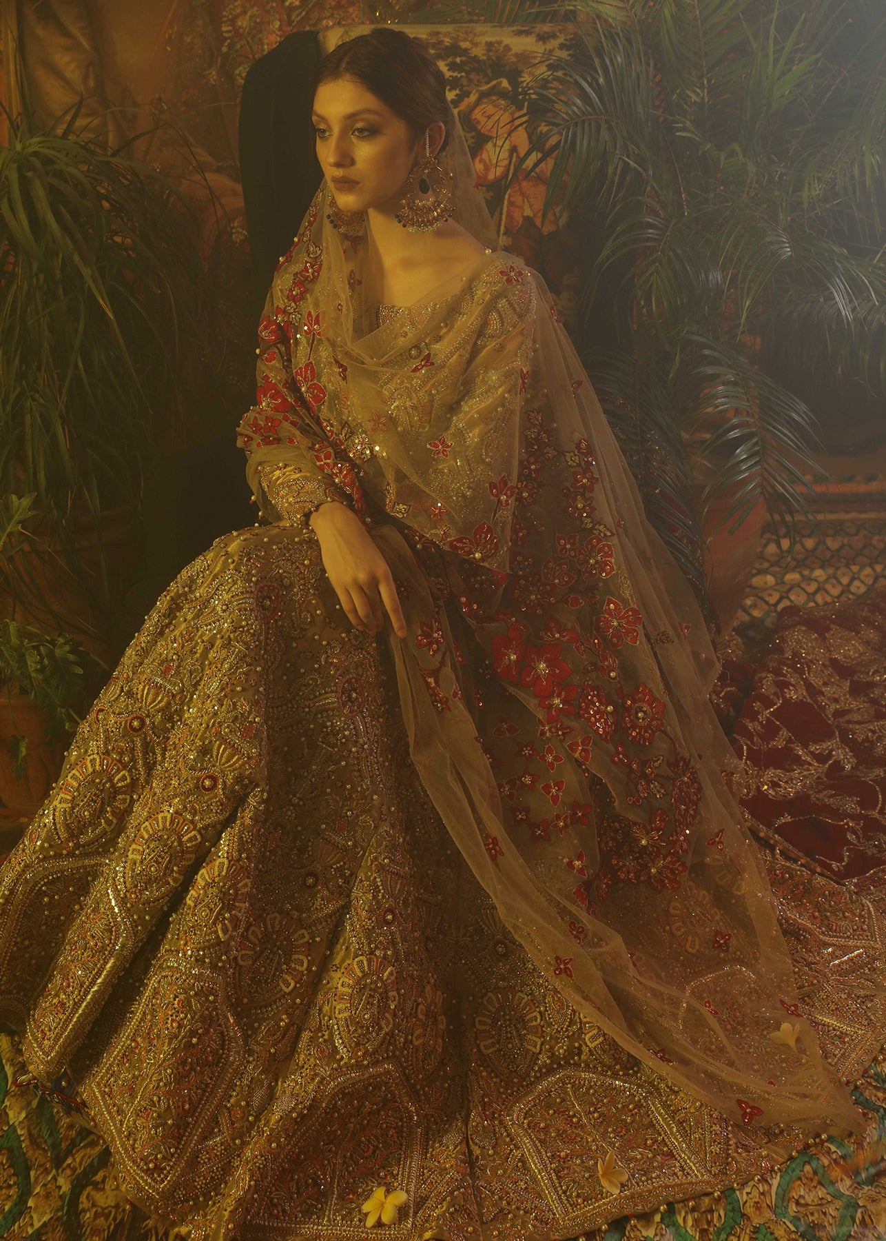 Ali Xeeshan features a traditional  oxidised vintage gold tissue lehenga choli  , in ruby adorned with beautiful gota, dori, pearl and zardosi handwork and worn with an embroidered net dupatta with border detailing.