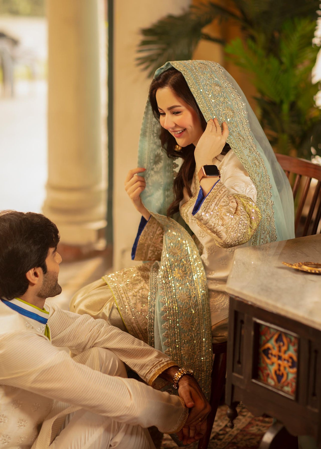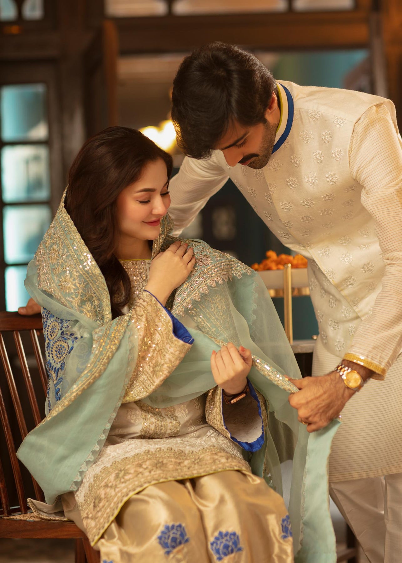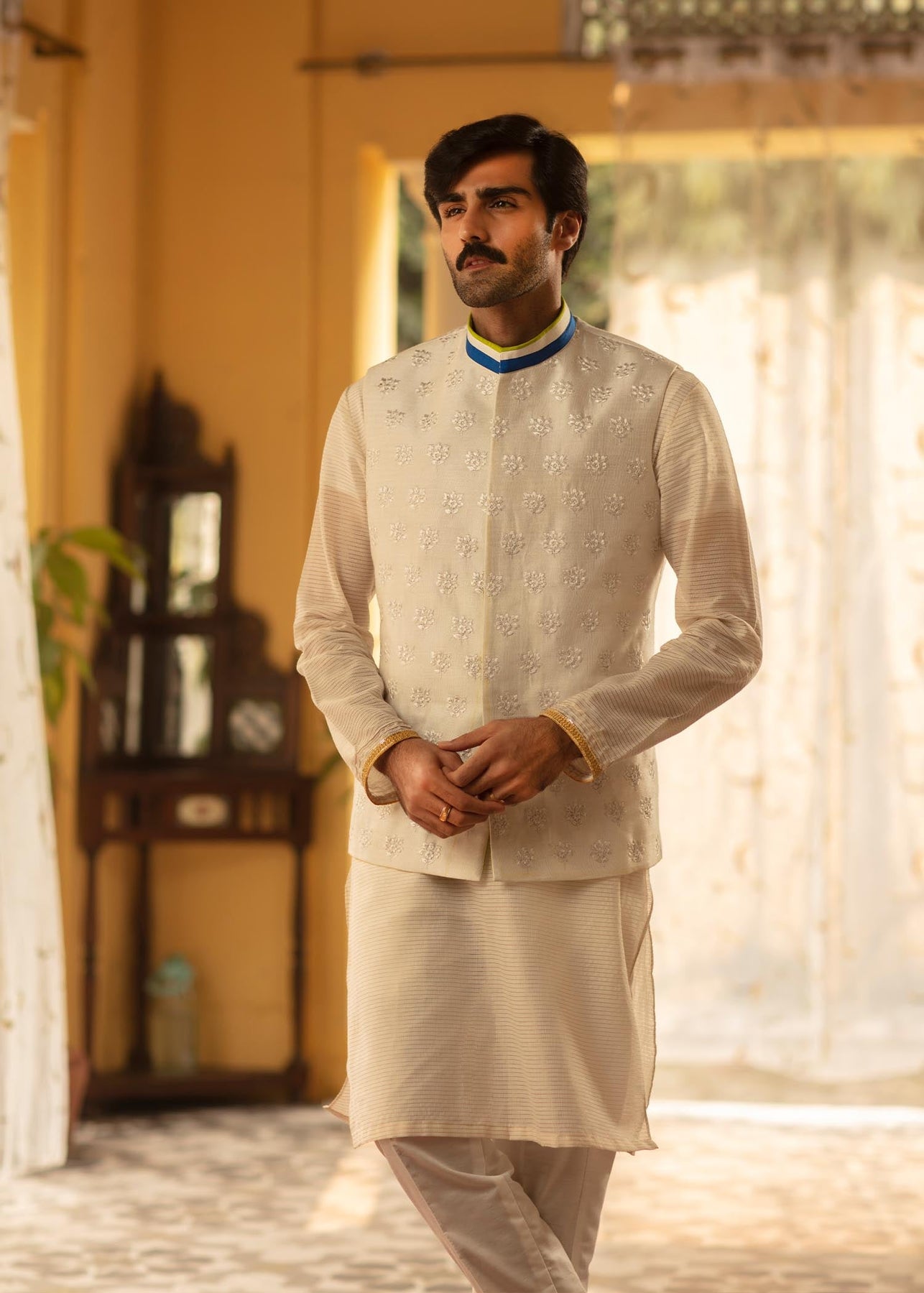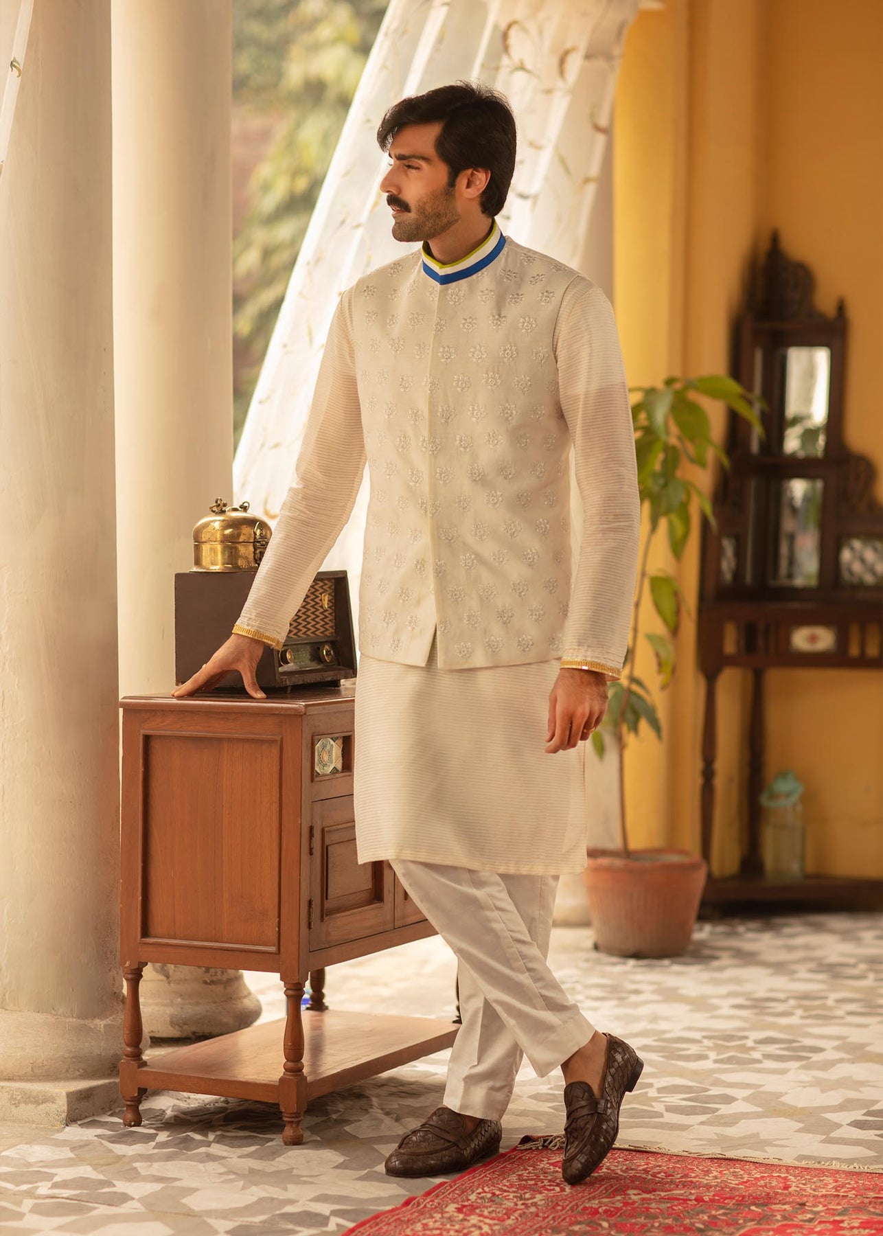 Description: A white cotton net waistcoat with self-embroidery has blue and acid green finishing on the collar which gives a contemporary vibe to the piece. It is paired up with a white shirt with embroidery and a white cotton trousers.