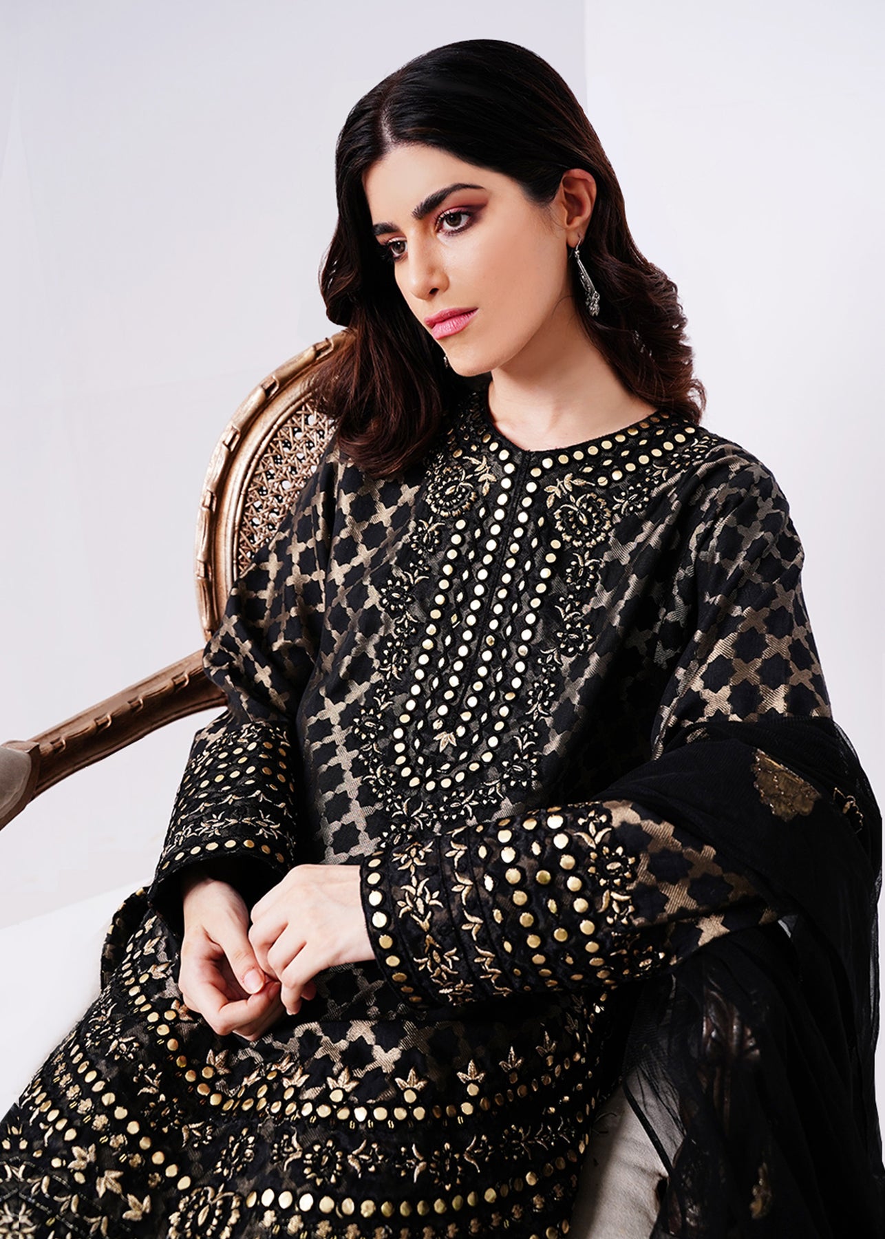 Rich black Jacqaurd matching separates with gorgeous mirror and thread work on sleeves, hem line and bottom.