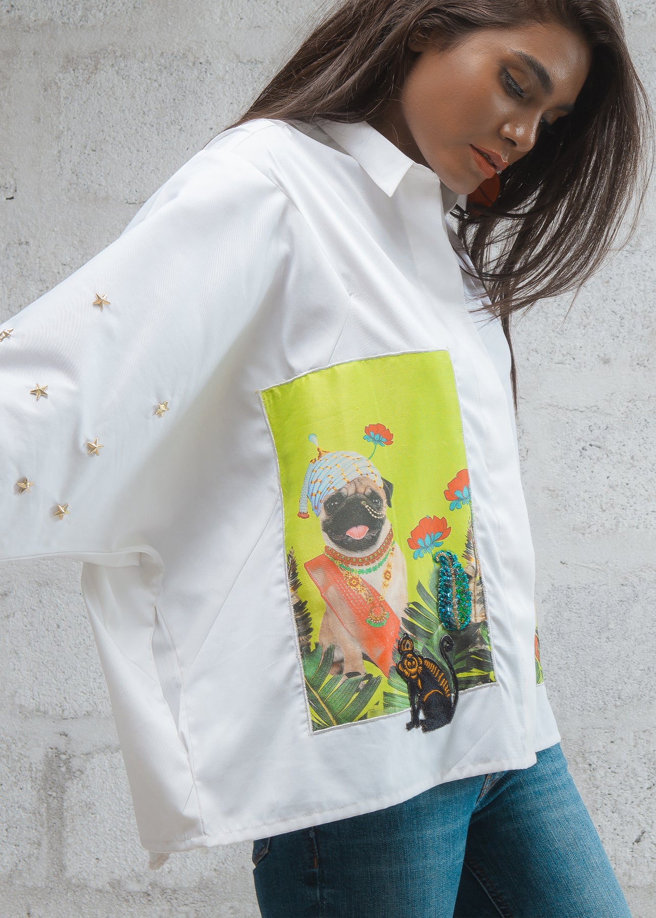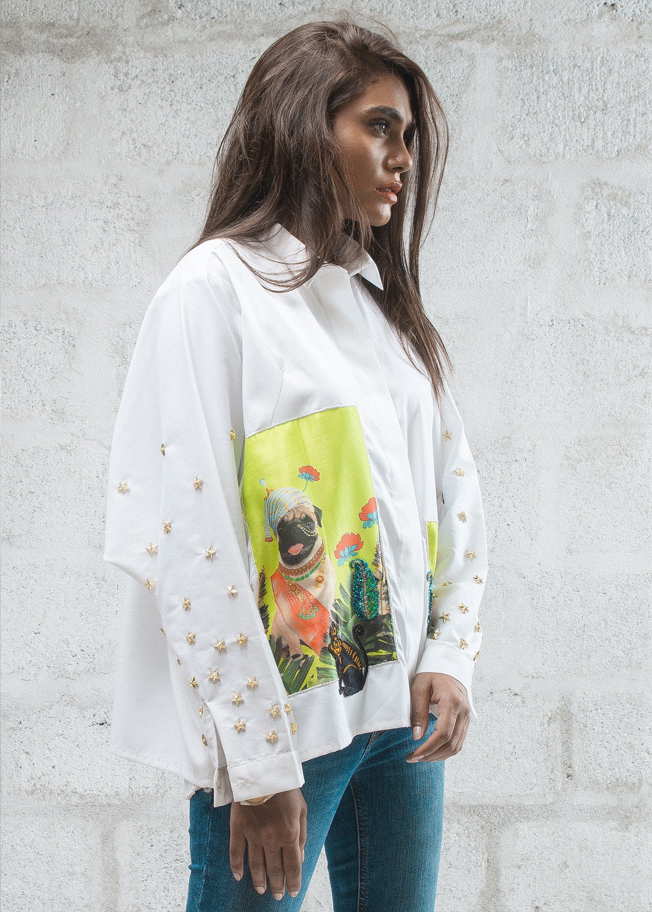 Egyptian cotton white shirt with metallic star studs and fun digital print detailing finished with traditional embellishments.