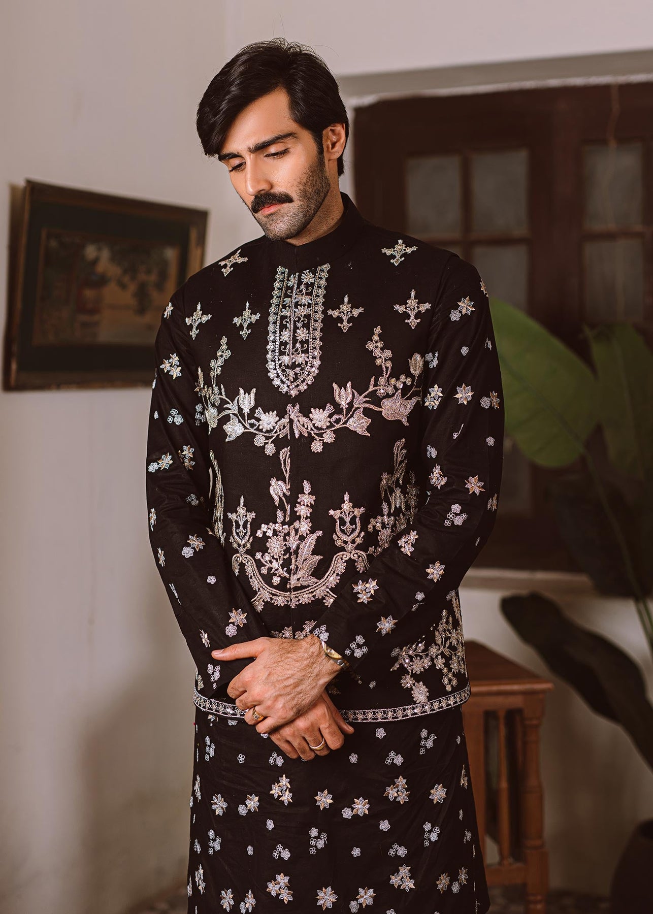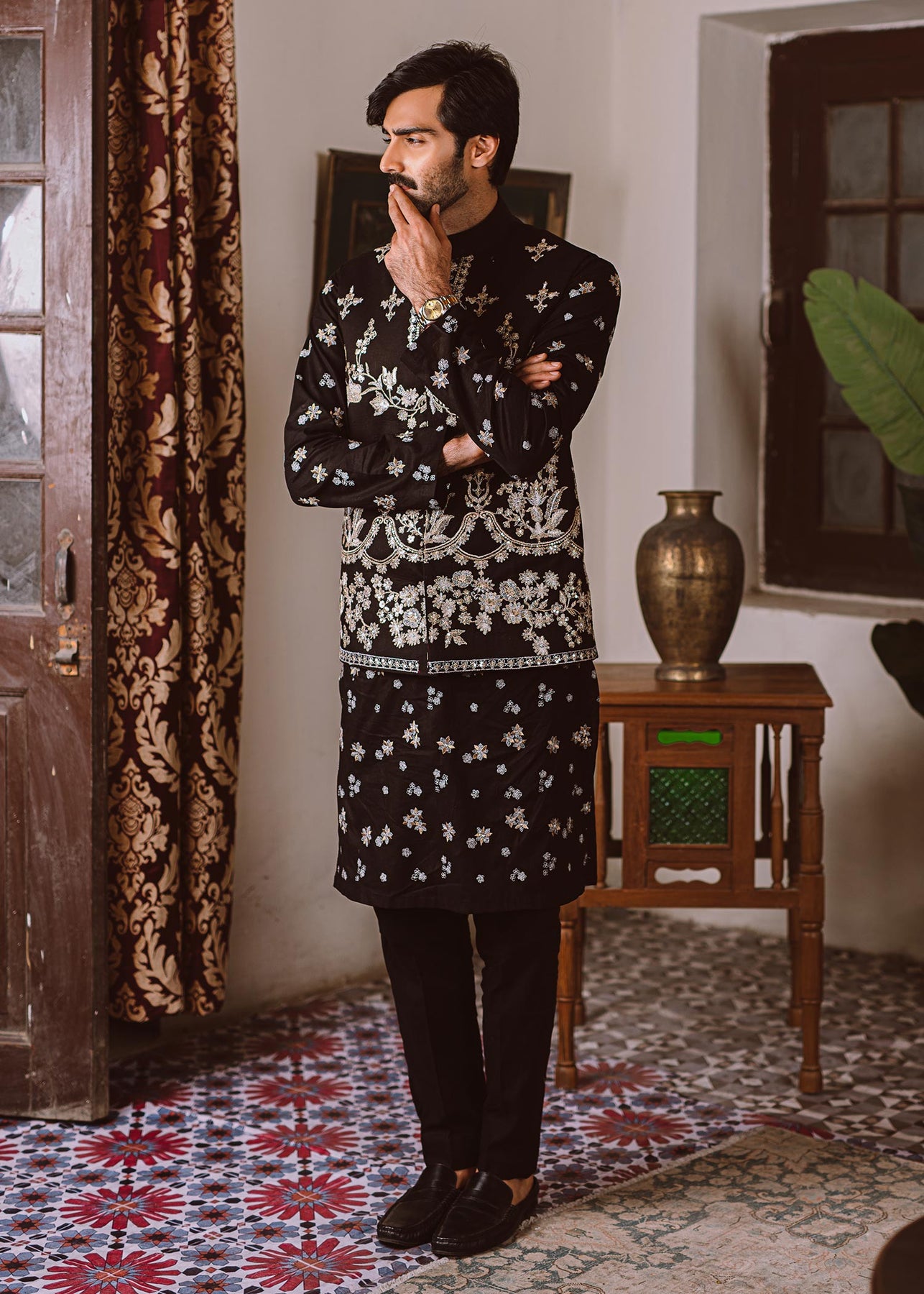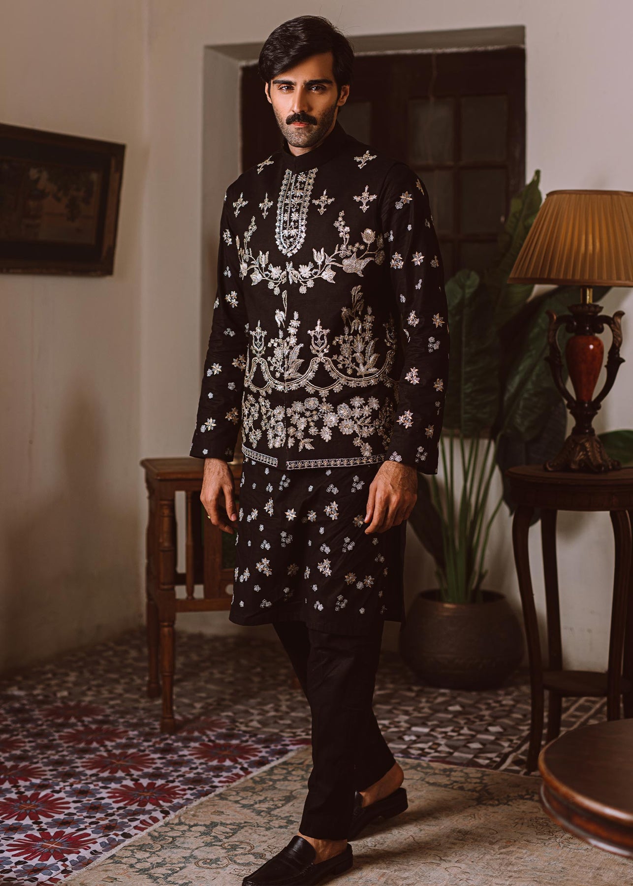 Description: A black cotton waistcoat is incrusted with tilla embroidery and sequins work. It is paired up with a luscious black cotton shirt with tilla embroidery and trousers.