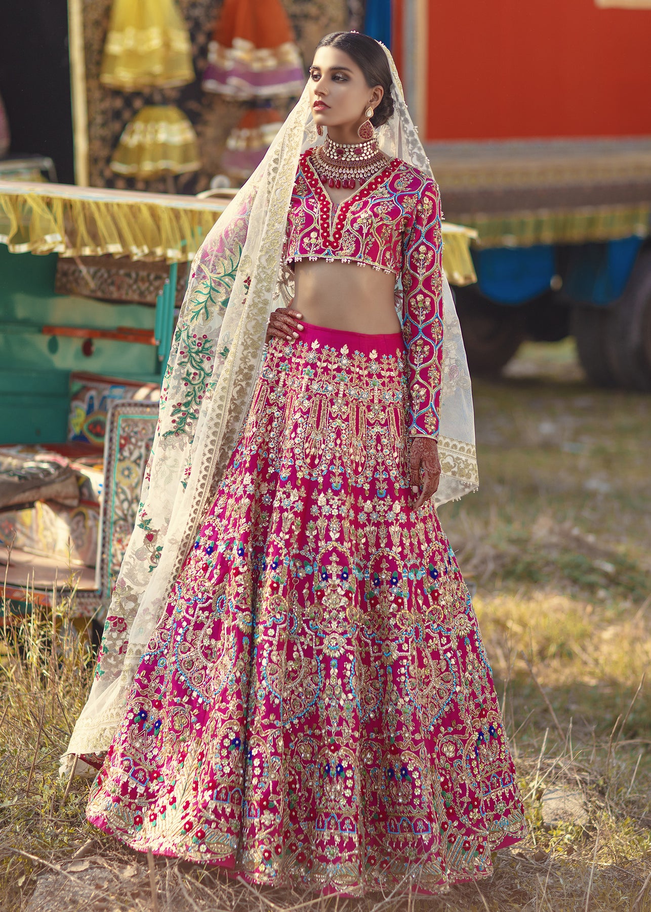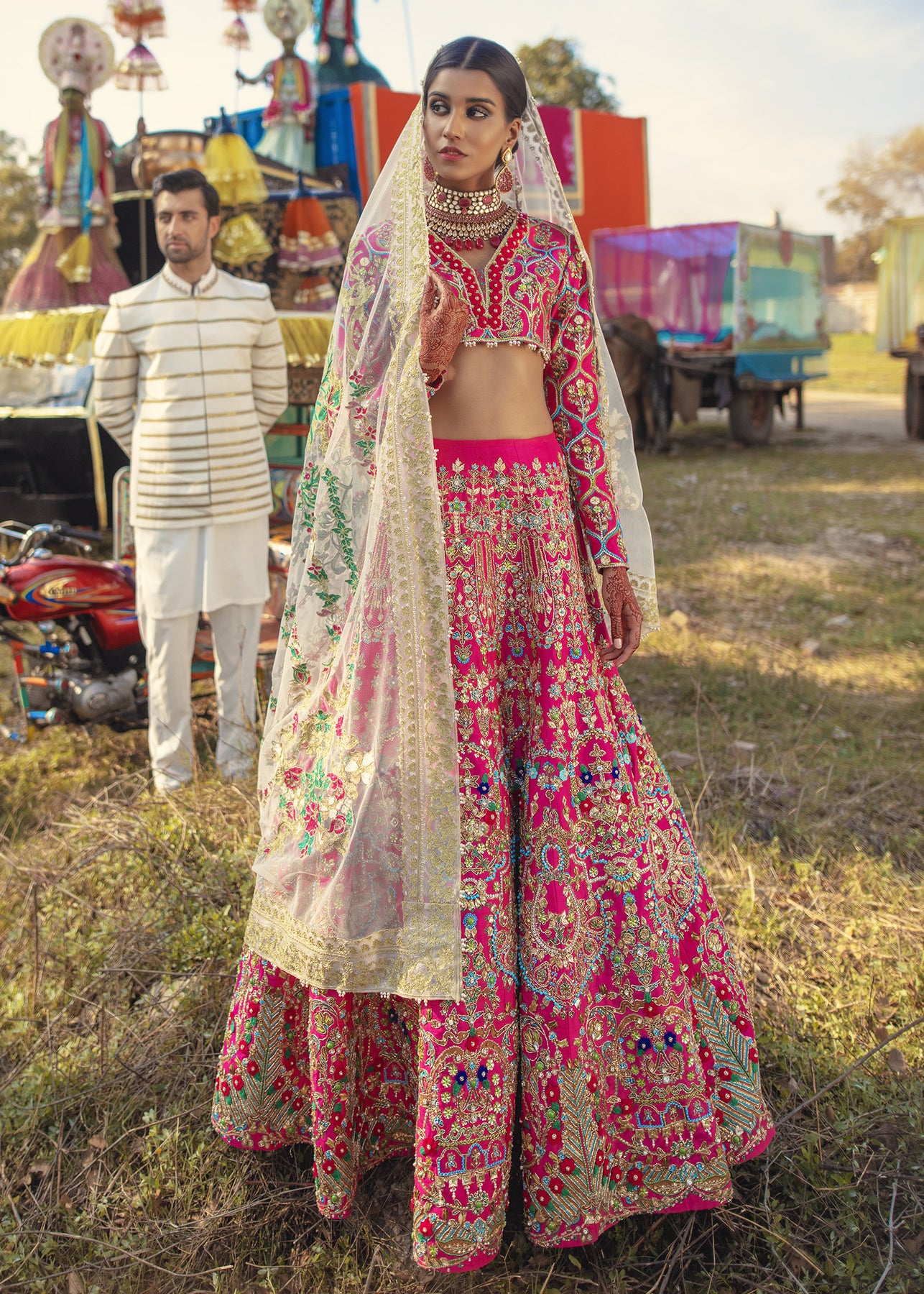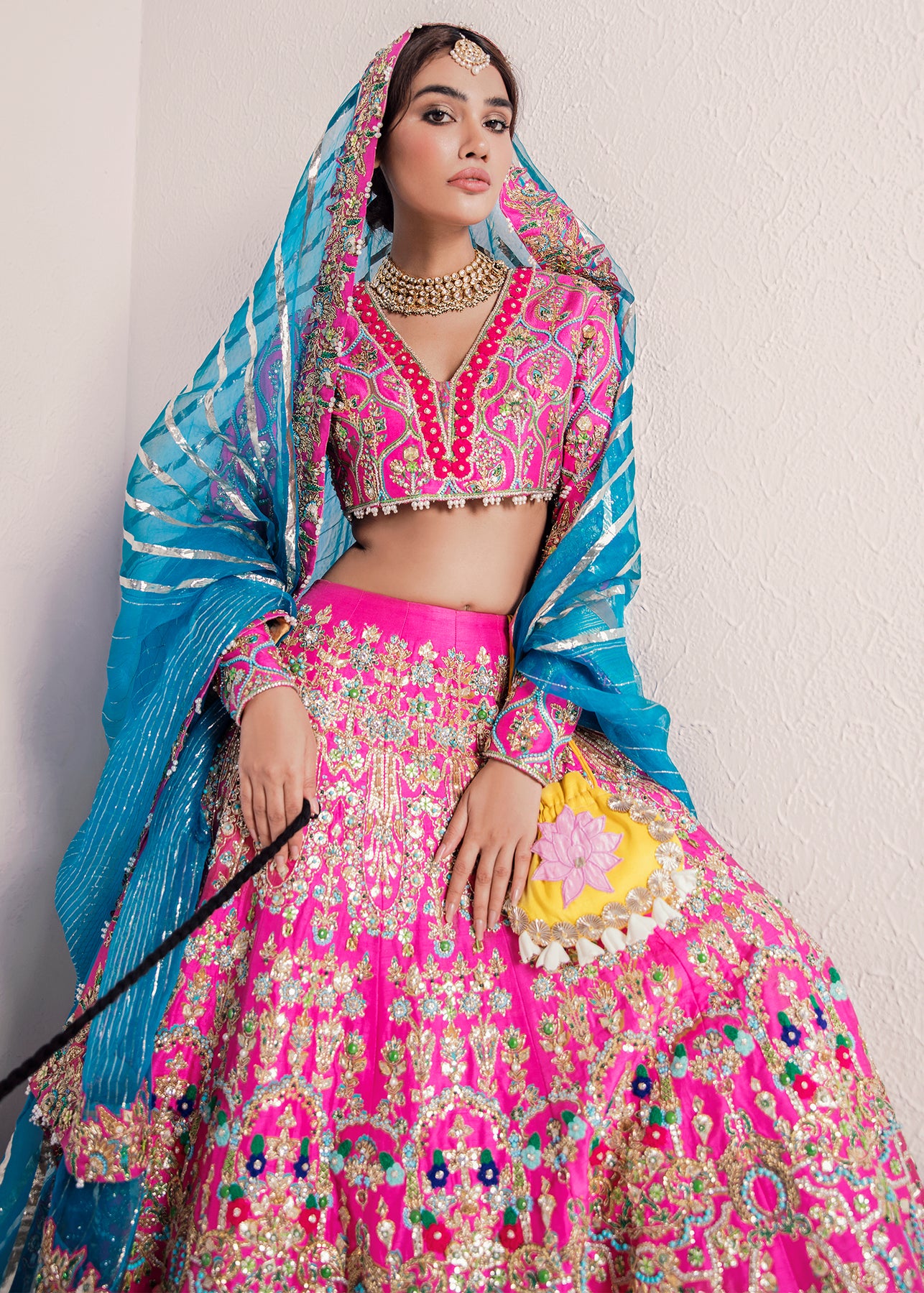 Add an oomph to your festive occasion featuring a fully embellished lehenga and choli paired with embroidered net dupatta. A deep crimson color all over raw silk lehenga choli paired and dupatta adorned with a tissue border.