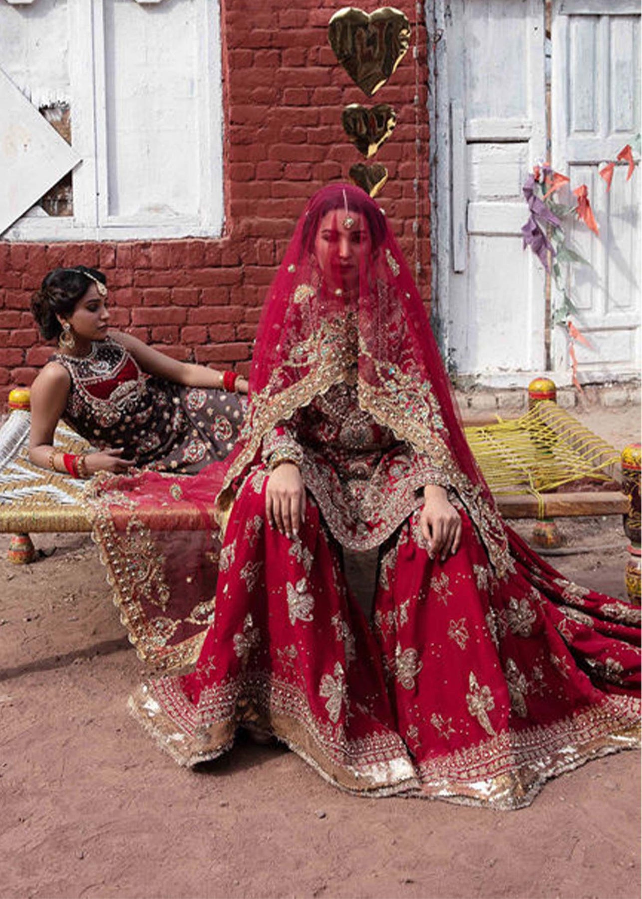 This deep red raw silk shirt is embellished with tilla and zardozi fused with multicoloured stones, pearls, sequins and crystals over a traditional Mughalai layout. The deep red raw silk farshi gharara is intricately worked with motive spray, sequins, pearls, crystals and multicoloured stones, and finished with a detailed edging. The red net dupatta has multicoloured aari, zardozi, pearls, sequins, crystals and a tilla and pearl edged finishing.