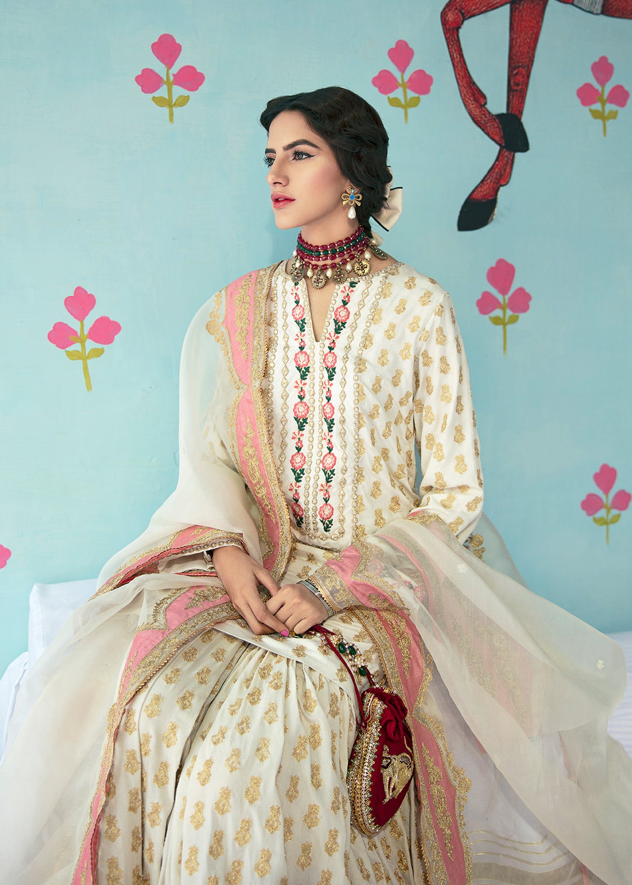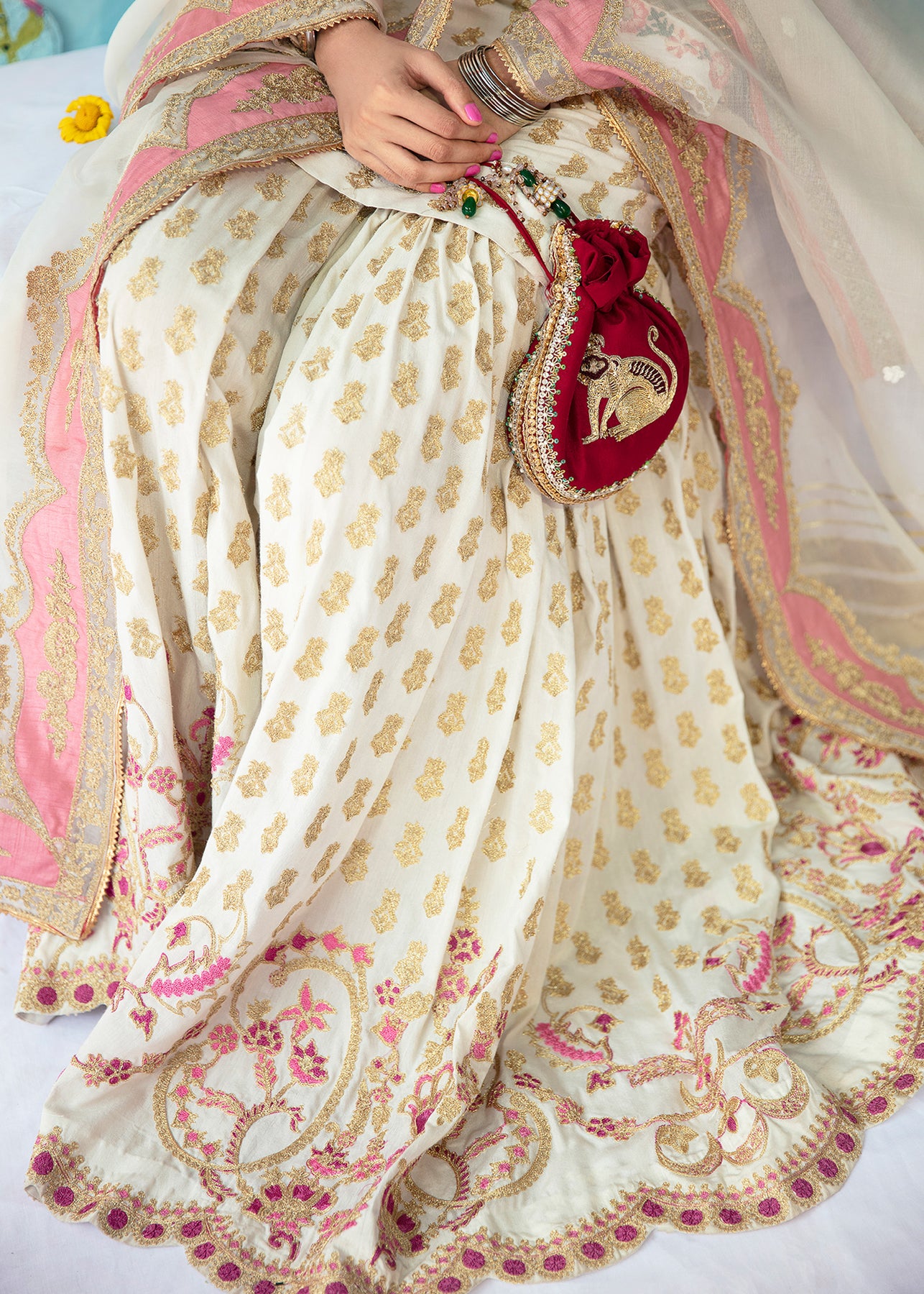 A cotton silk shirt and gharara is enhanced with gorgeous golden aari embroidery all over it. The ghrara has a beautiful scalloped border while the organza dupatta has tea pink finishing on all sides.