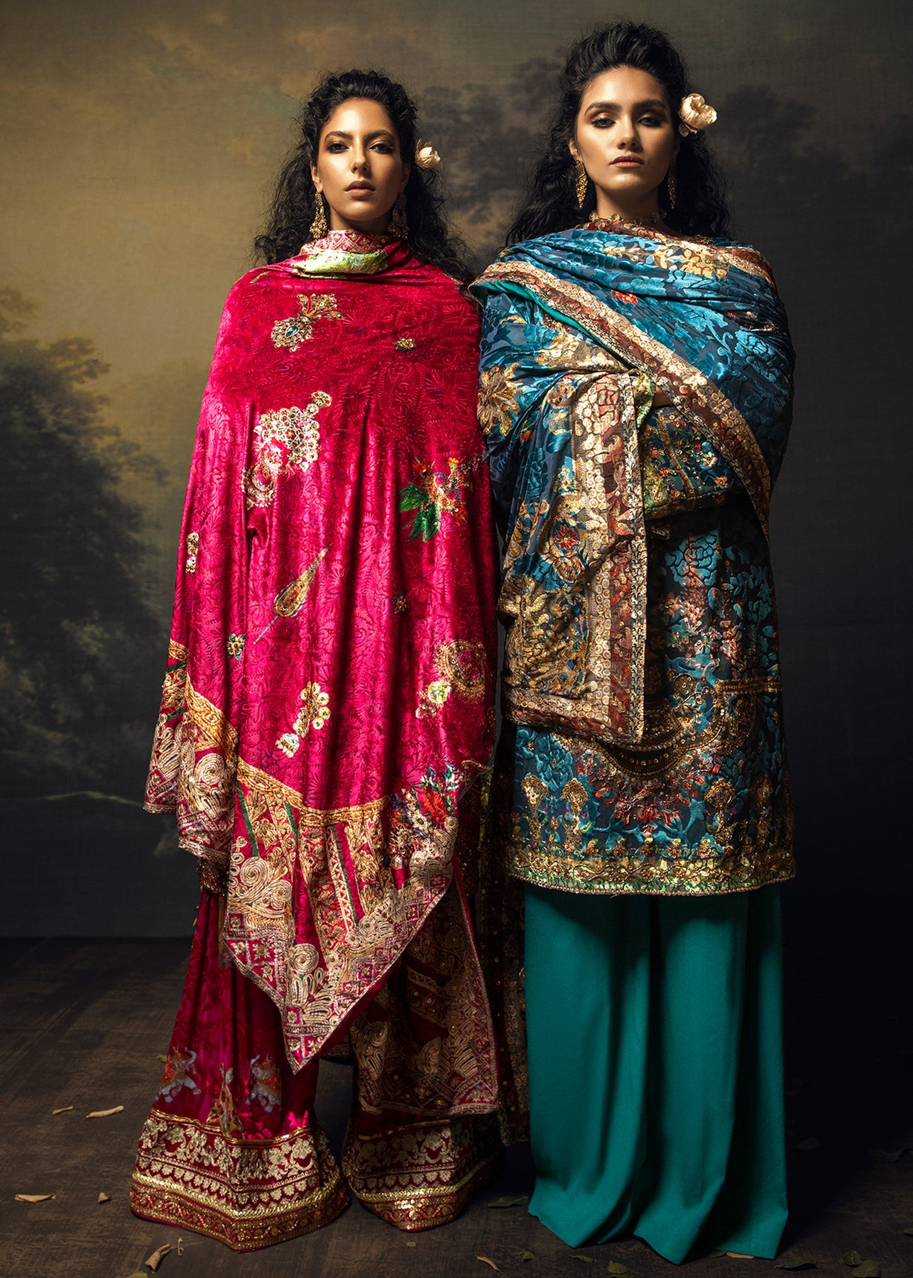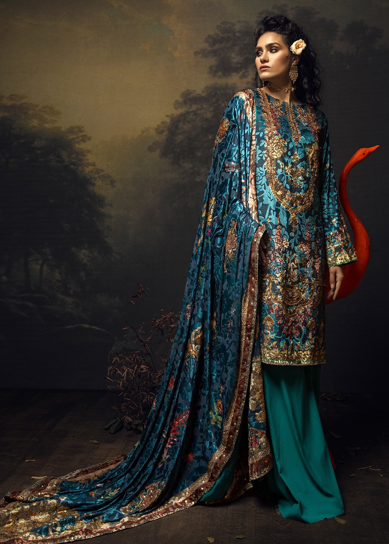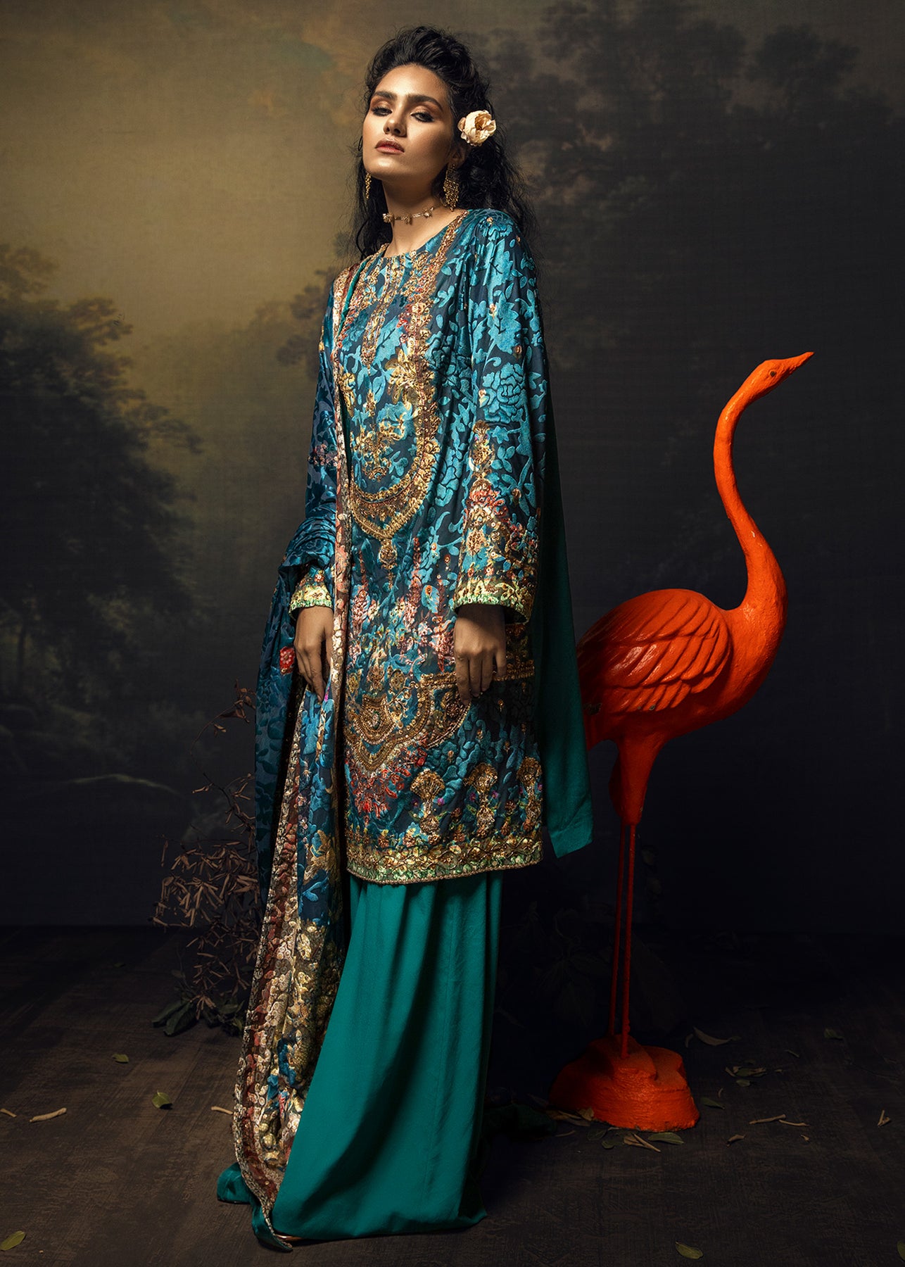 An ocean blue palachi velvet shirt is enhanced with antique zardozi work and sequins. It is paired up with georgette palazo and a velvet shawl with detailing on the borders.